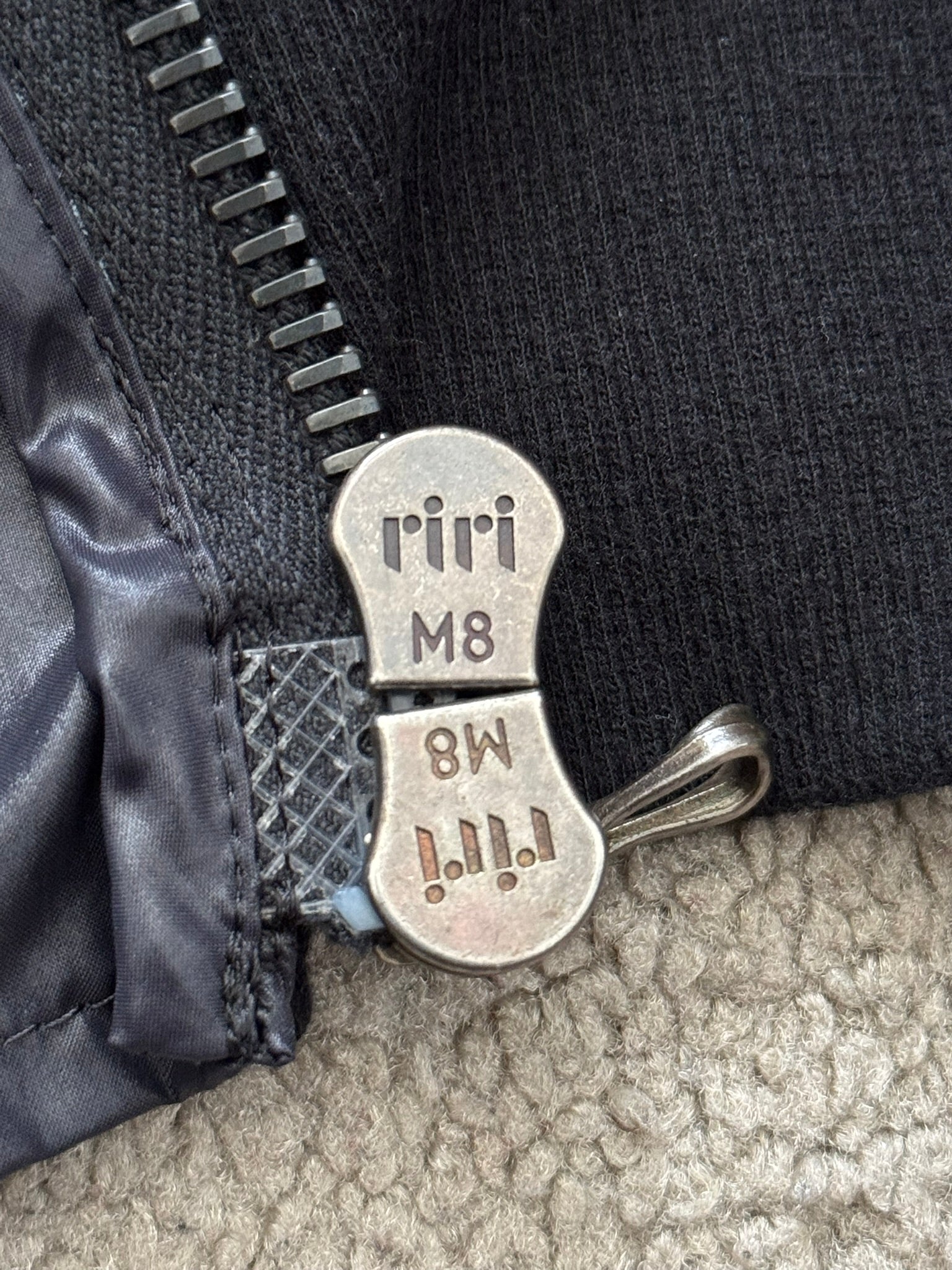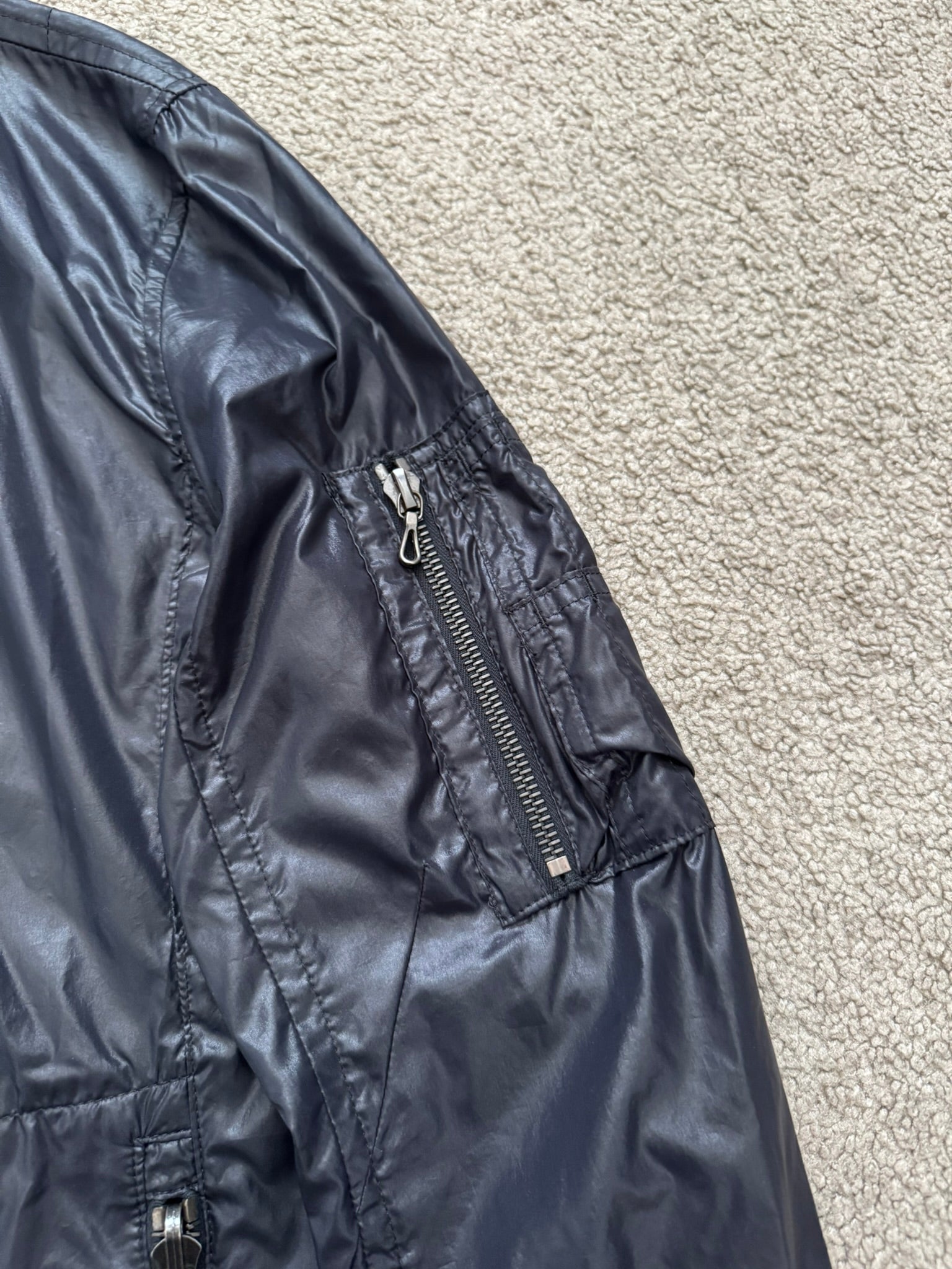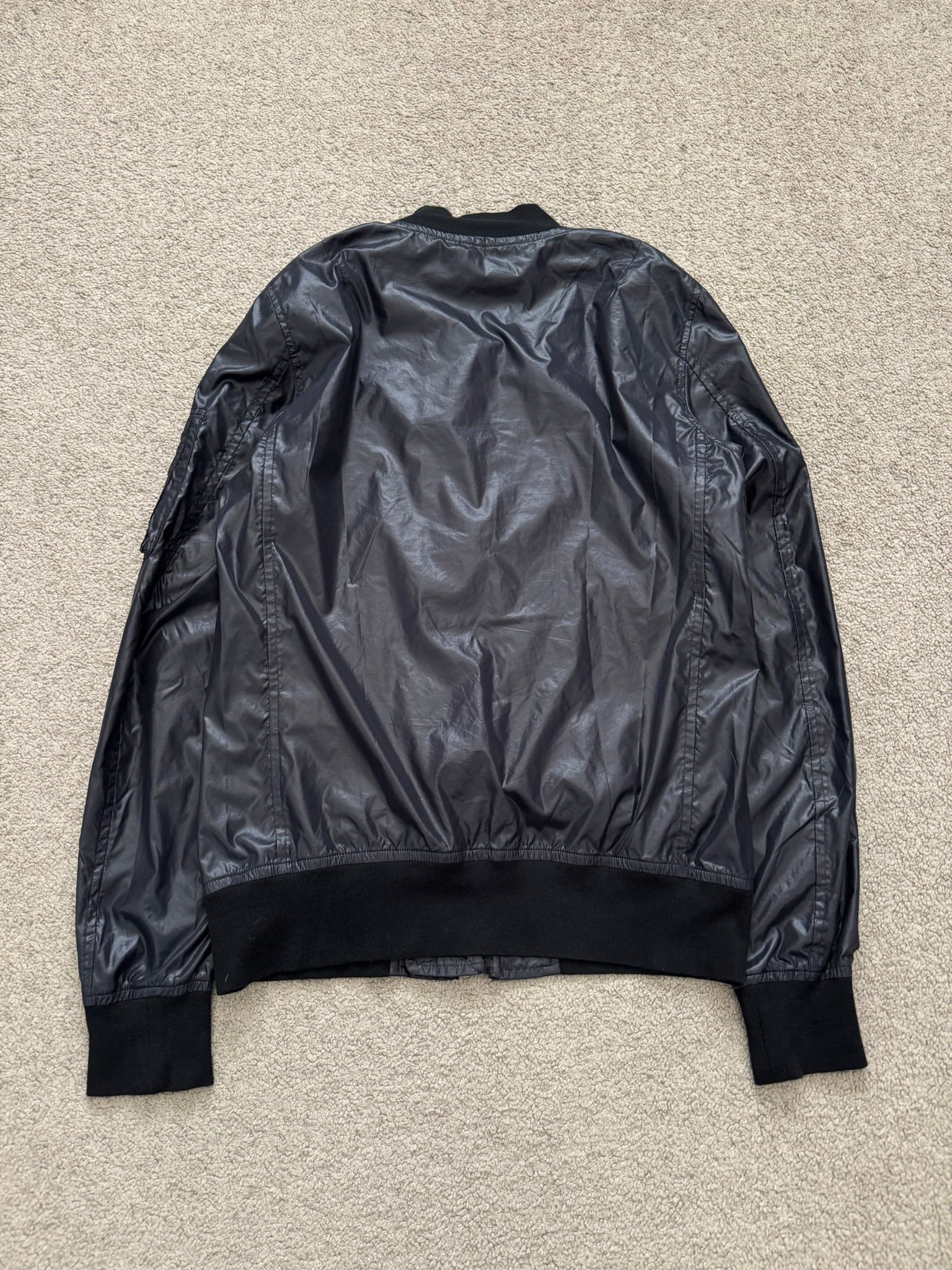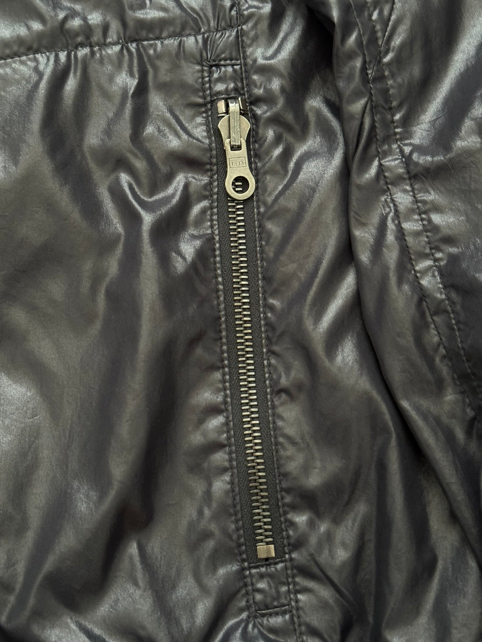 From the Japanese label Attachment made by Kazuyuki Kumagai. This slim fitting lightweight nylon MA-1 bomber jacket in this black color features front zipper pockets with two different style pulls, a two-way zipper closure, and a arm zipper pocket. All zippers are quality RiRi zips. In great condition, no real flaws. Made in Japan. Tagged a size 2.
