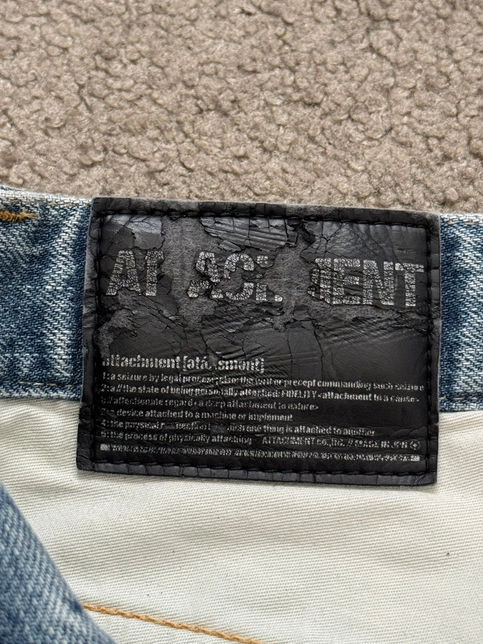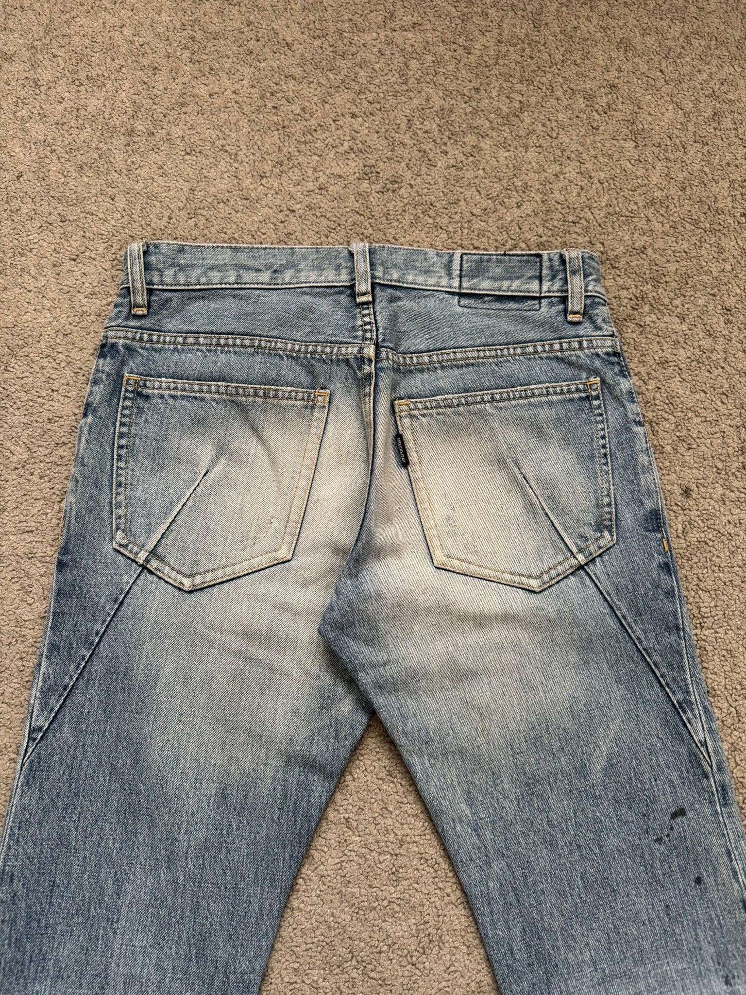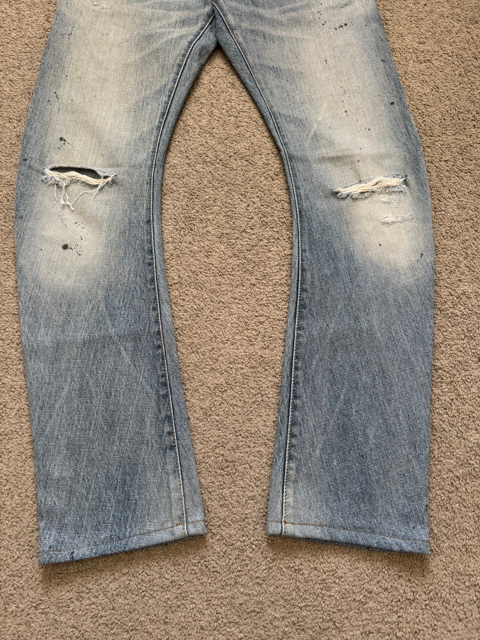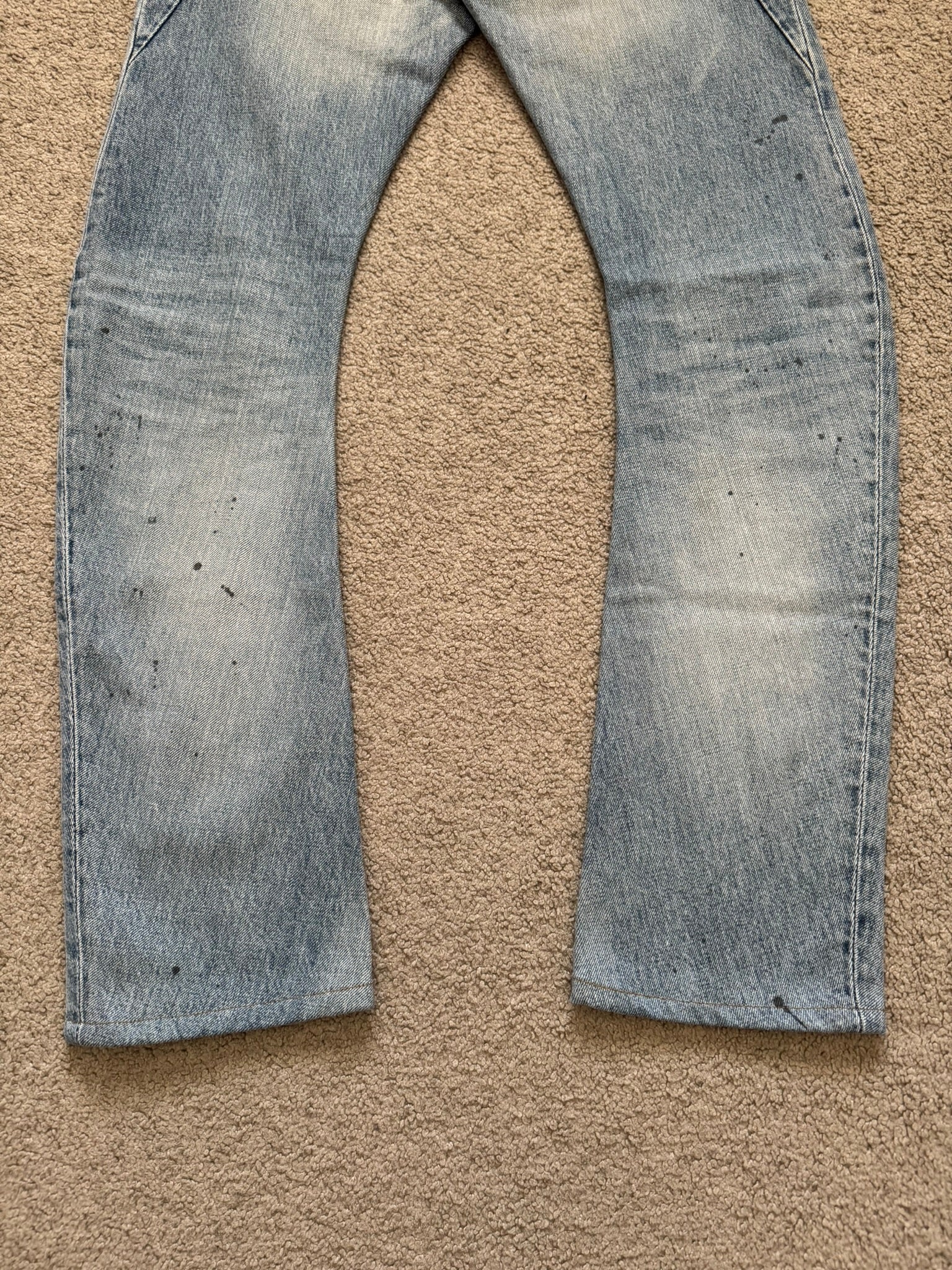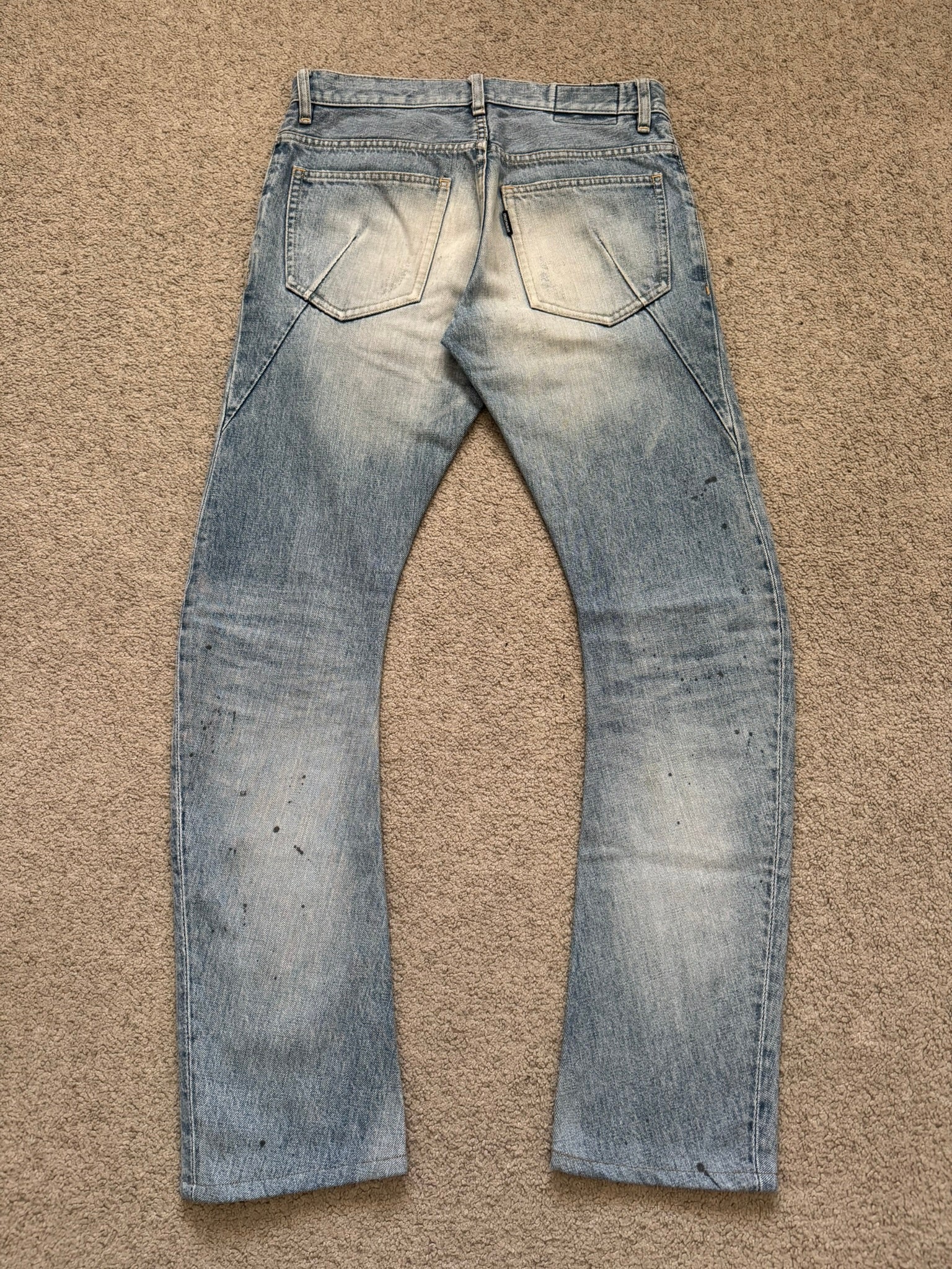 From the Japanese label Attachment made by Kazuyuki Kumagai. These light washed blue denim jeans feature slight distressing throughout, two distressed slit knee holes, subtle paint splatter details, two front pockets, two back pockets with text logo tab along with darting details, inner logo patch, and a button fly. Has a J-cut construction that is meant for stacking. In great condition, no real flaws as all wear is intentional. Made in Japan. Tagged a size JP 1.
