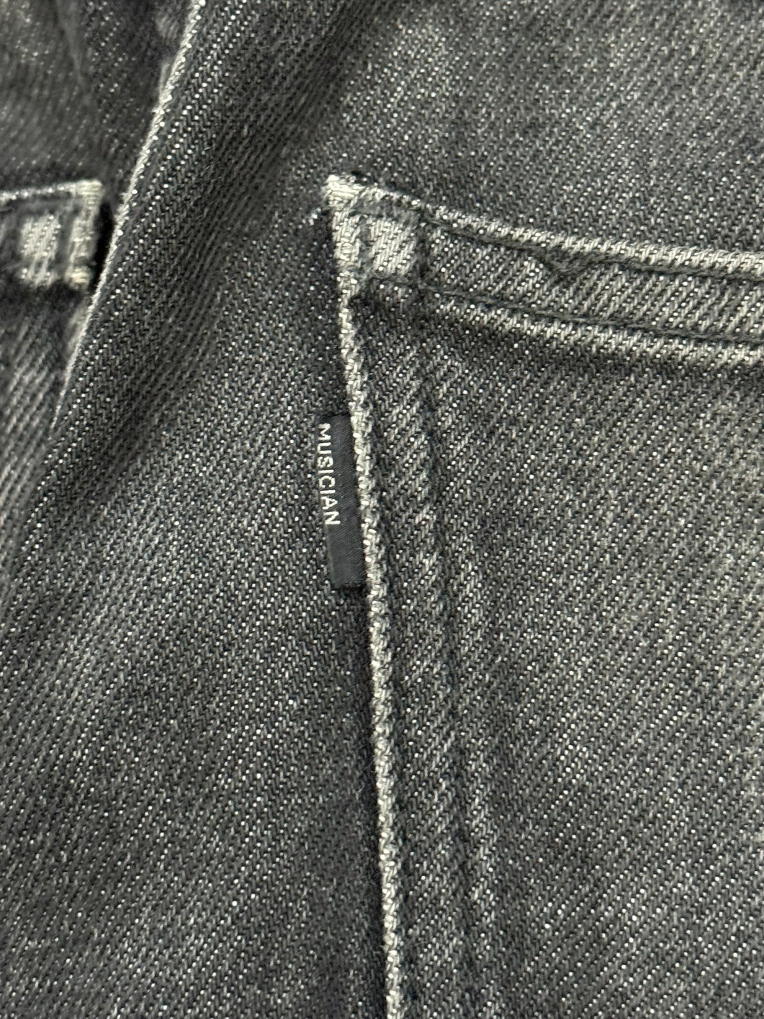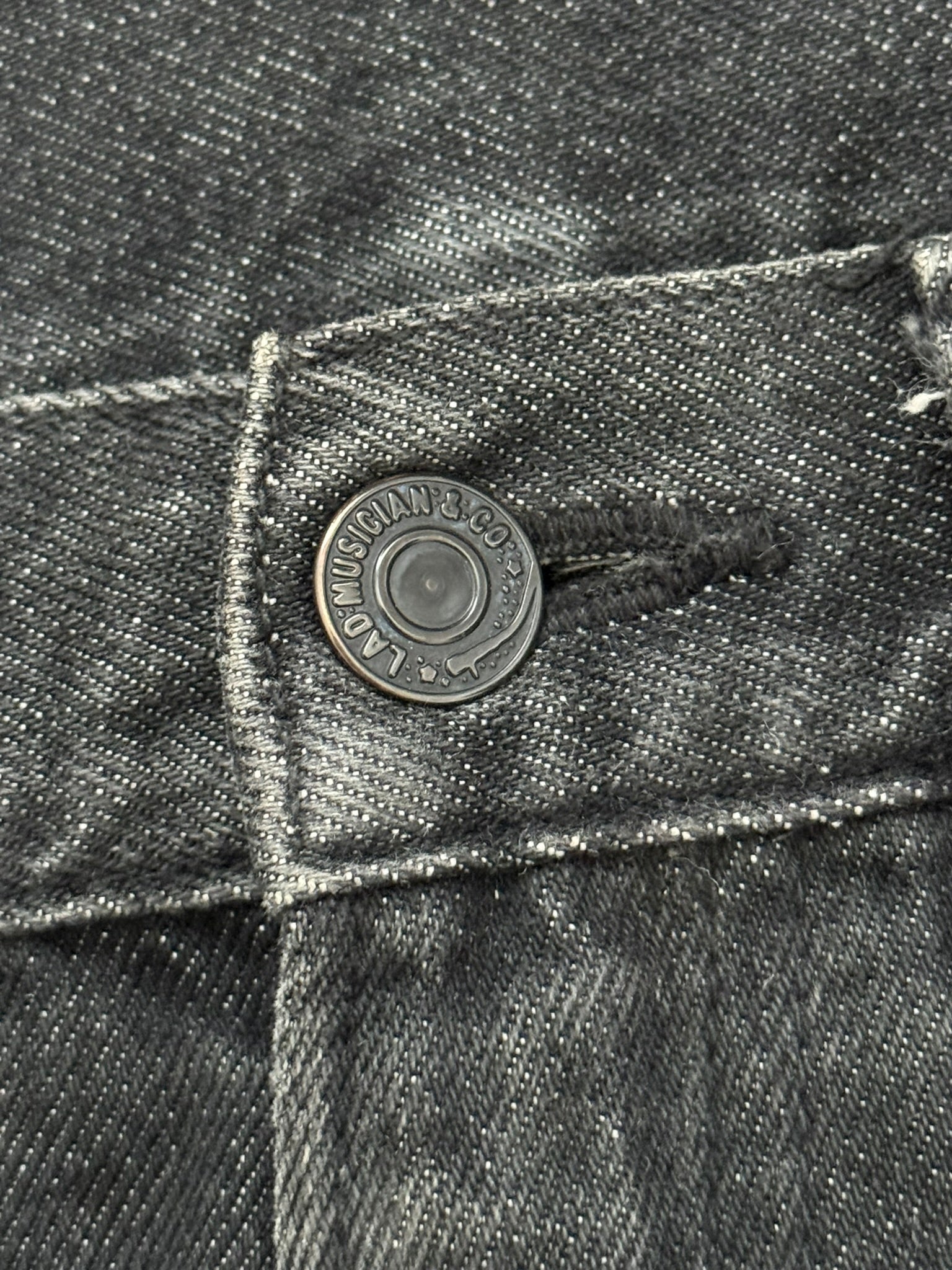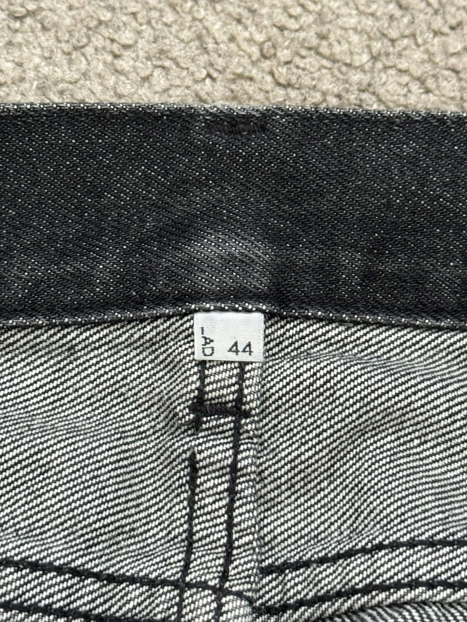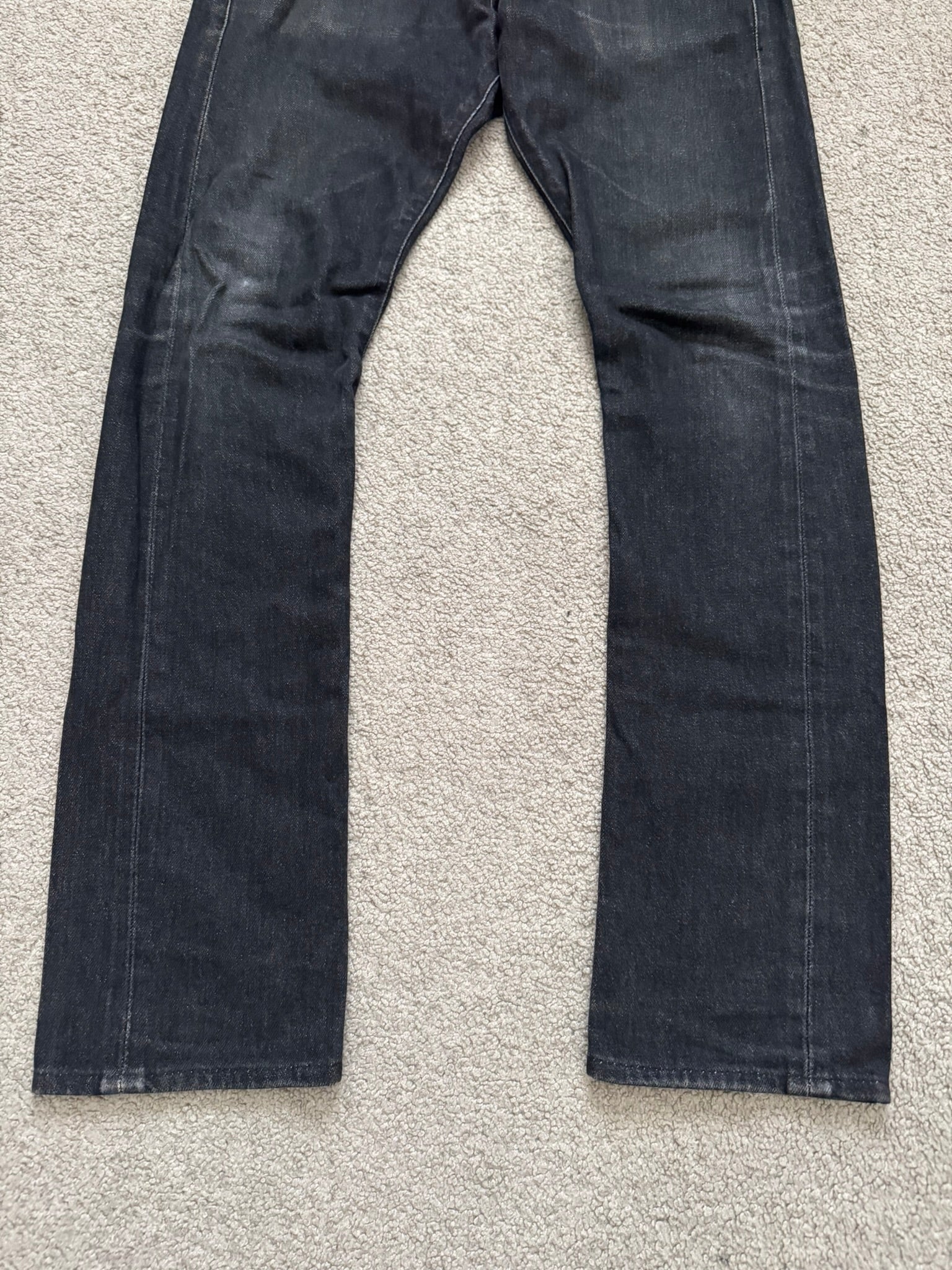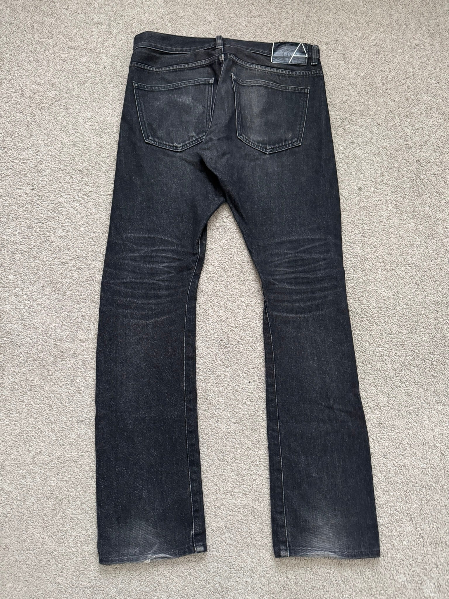 From Yuichi Kuroda's Japanese label Lad Musician. These faded black skinny denim jeans feature a five pocket layout, a button + zipper fly, and a logo leather patch on the back. Similar to Saint Laurent D02s. In good condition, all wear and fading as pictured; no other real flaws. Made in Japan. Tagged a size EU 44, fits more like a size 30.