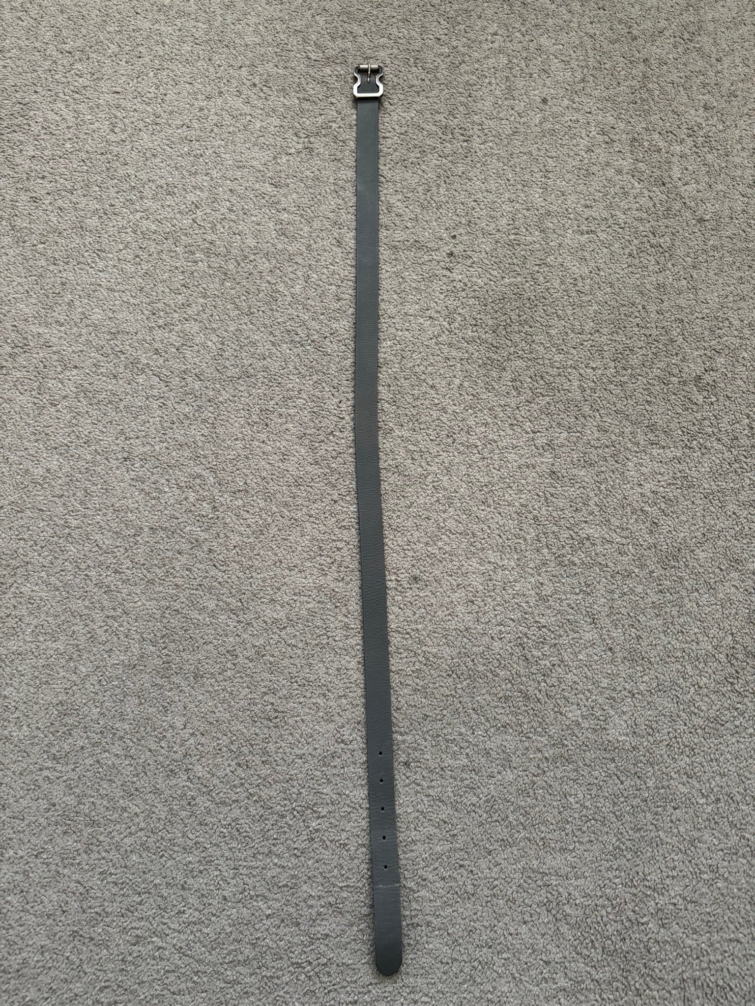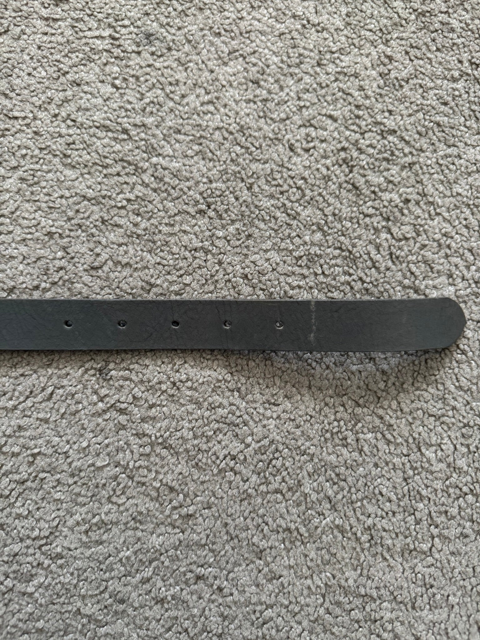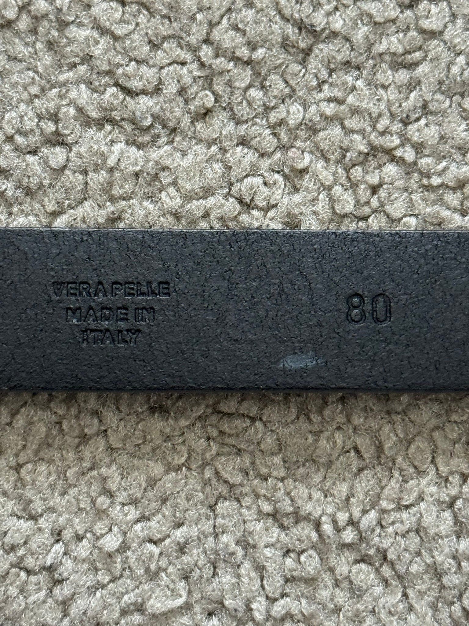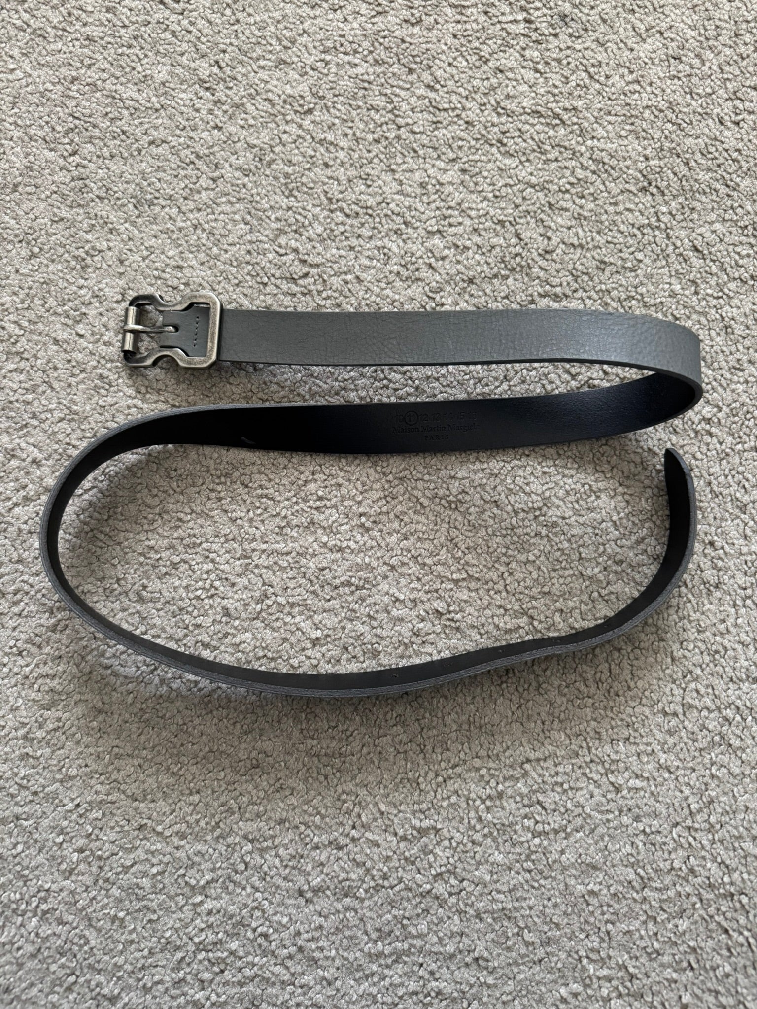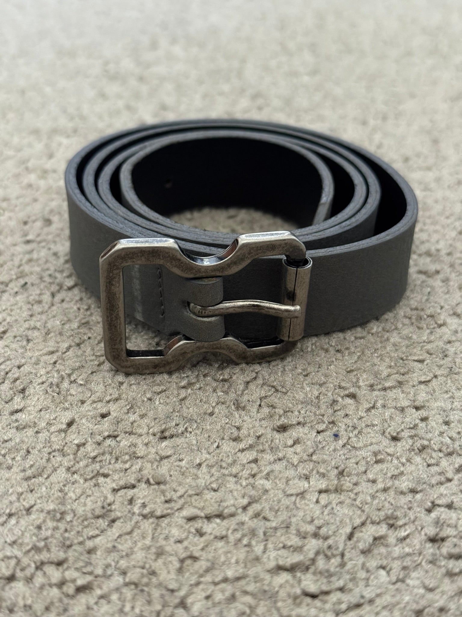 From French fashion house Maison Margiela. This grey leather belt features an interesting double conway style roller buckle. In great condition, no real flaws. Made in Italy. Tagged a size 80, fits around a waist size 28-30.