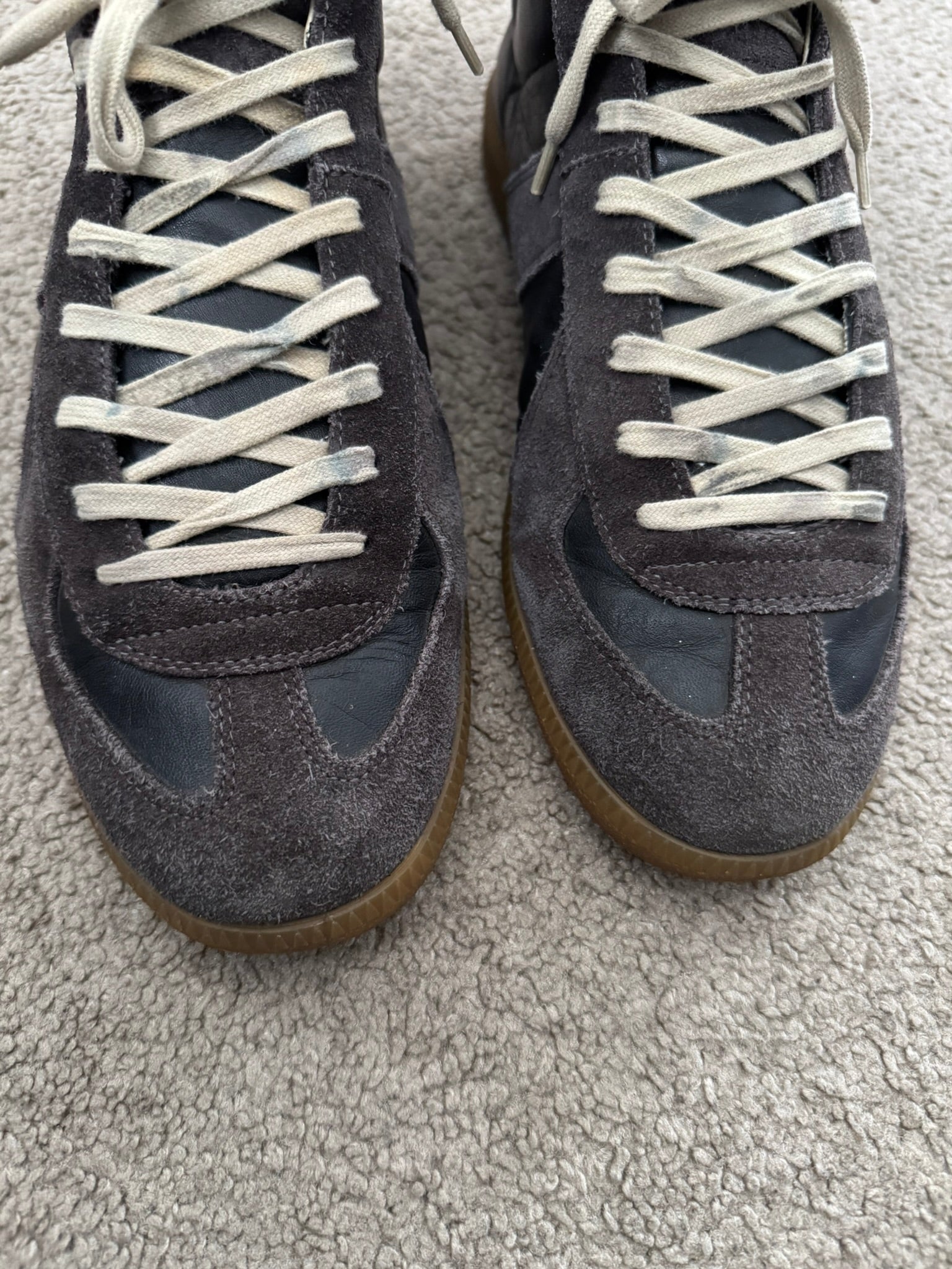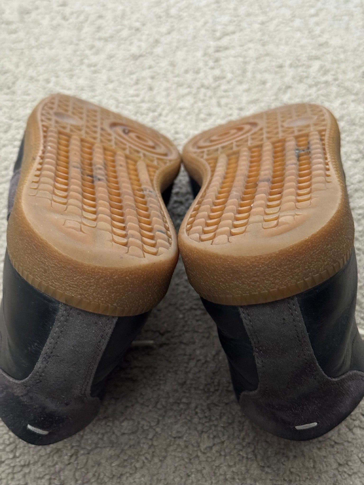 Maison Margiela's "Replica" line reinvents German Army Trainers that were first created by the Dassler brothers (Adidas and Puma) to make these classic sneakers. Made from black calf leather & suede for the upper with gum soles and cream laces. Needs no real description. Older model, harder to find nowadays. In good condition, worn throughout with scuffs & marks as well as heel drag. Everything as pictured. Made in Italy. No box. Tagged a size EU 41/U.S. 8, fits about TTS.