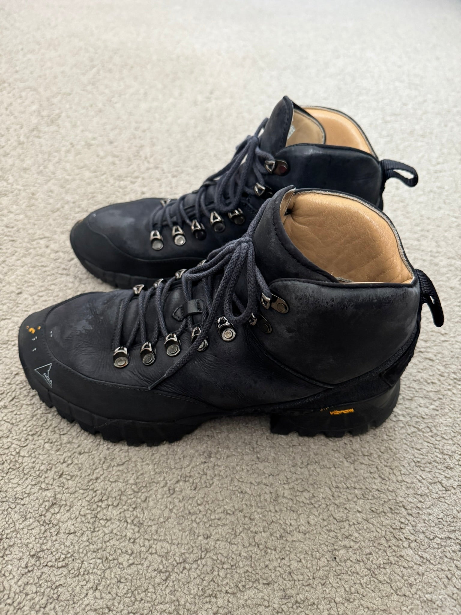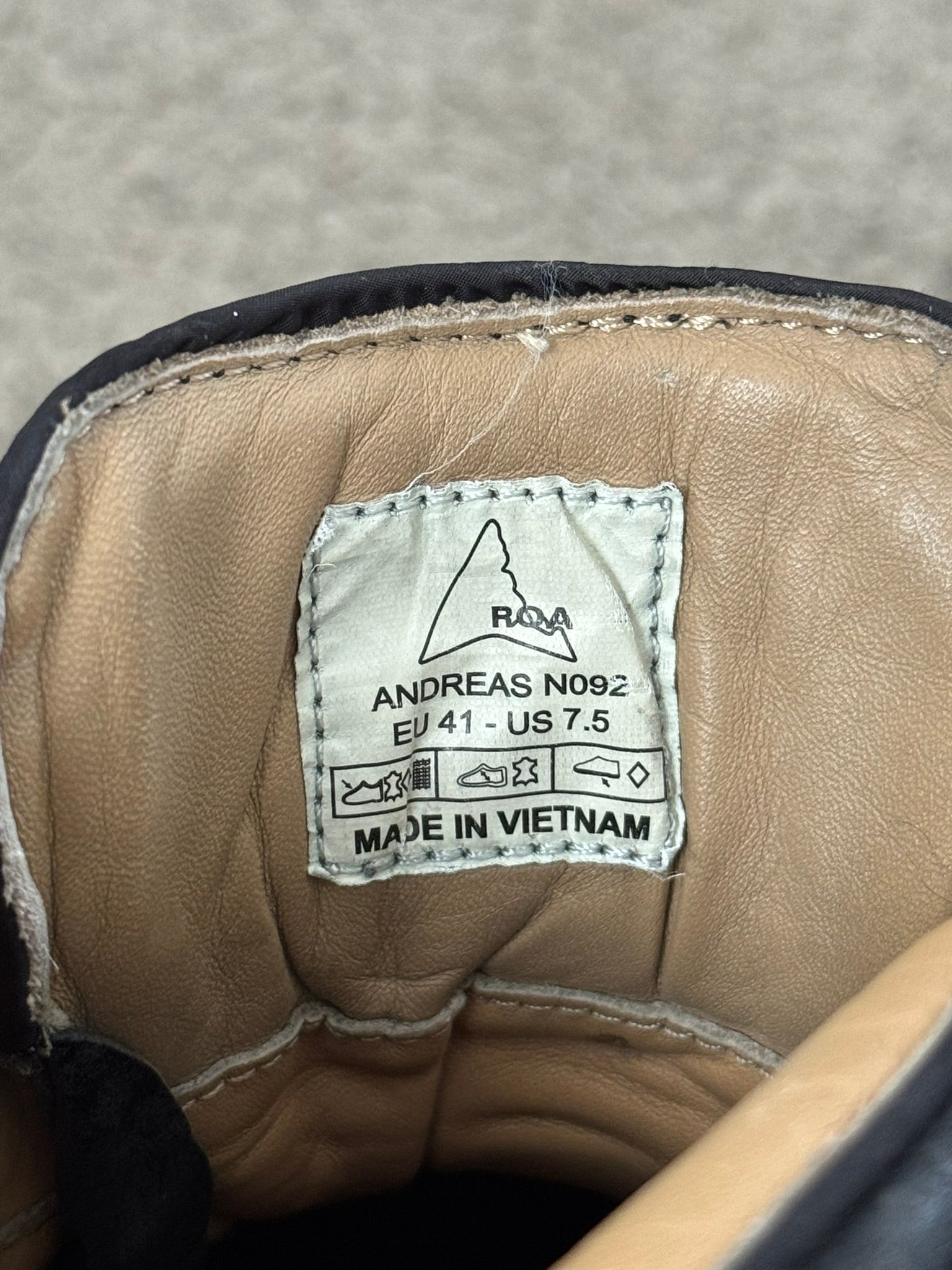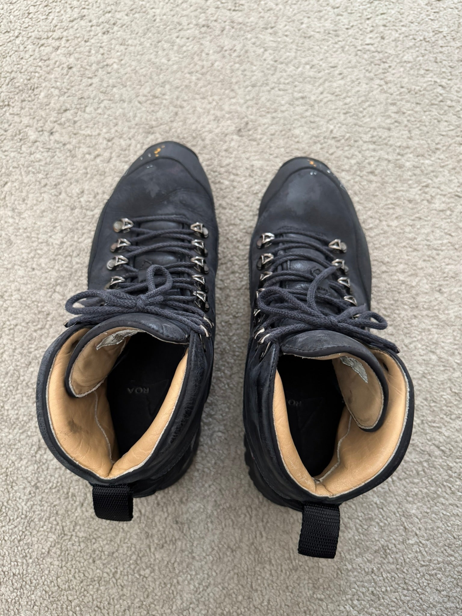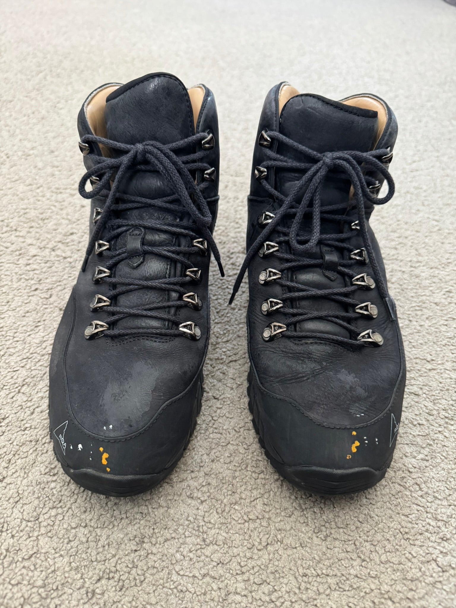 From Italian outdoor fashion label and footwear brand ROA. These high top "Andreas VAR N.092" hiking boots made from a black leather feature intentional subtle paint splatter details at the front & sides, ROA logo printed on toebox, embroidred ROA logo on the sides, two pull-loops, and Vibram Megagrip rubber soles. In great condition, some dirt, marks, and scuffs but is generally clean. Comes in original box. Tagged a size 41, fits around a U.S. size 8.