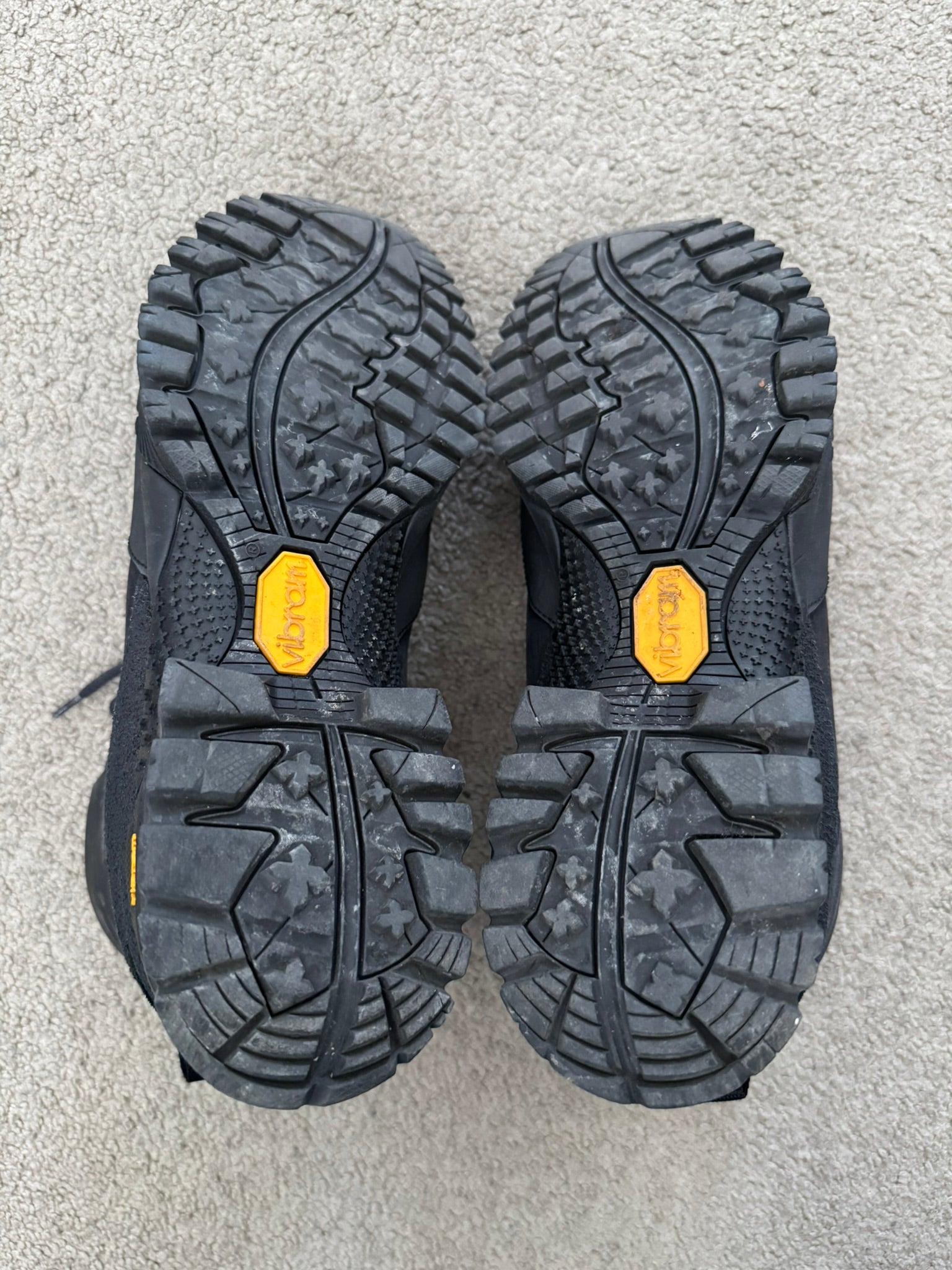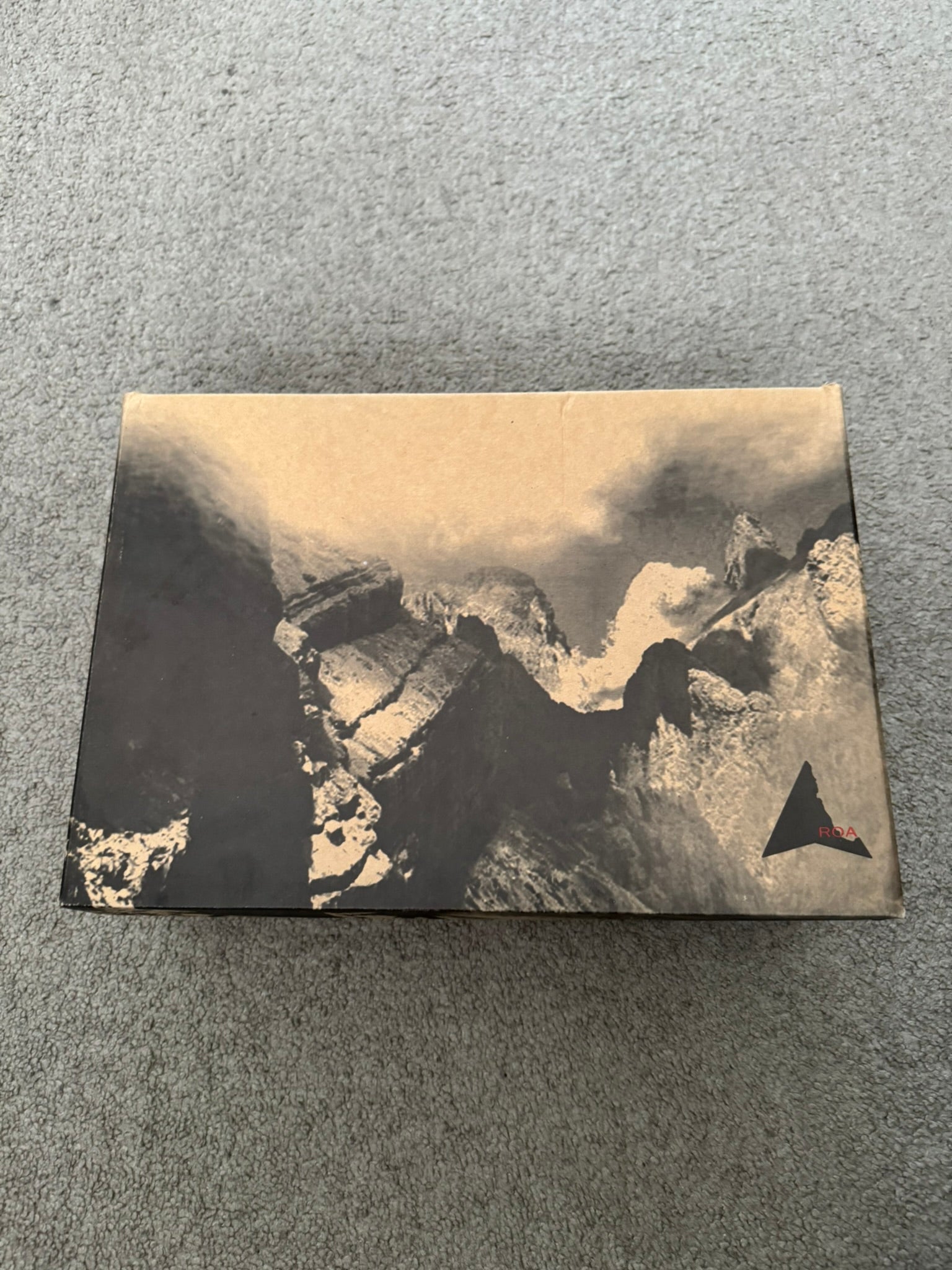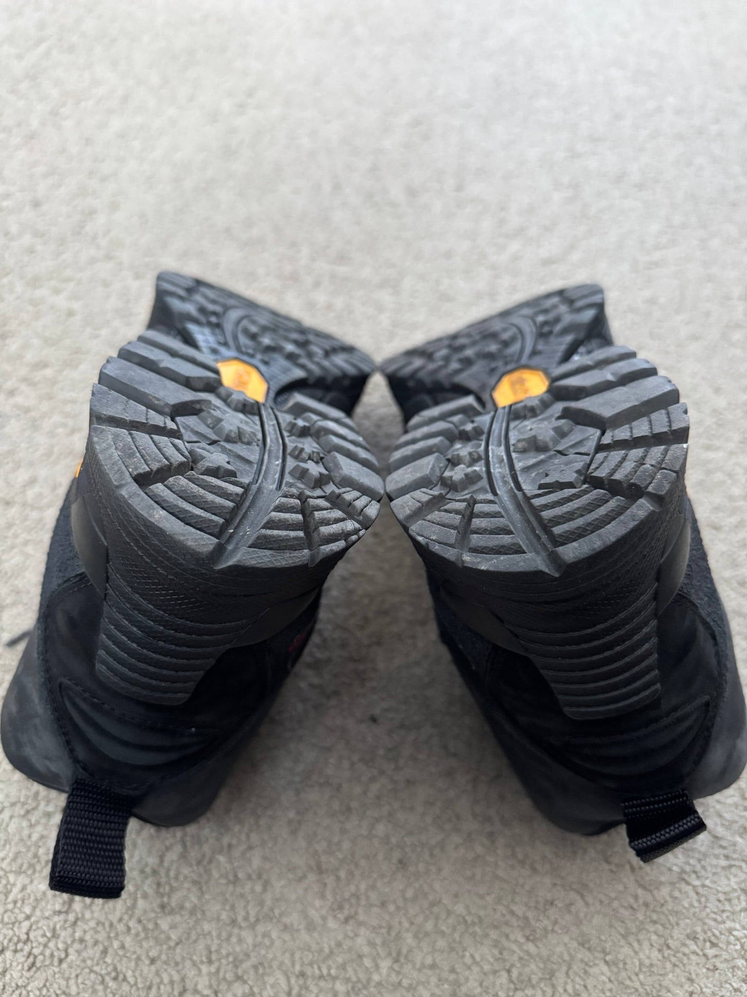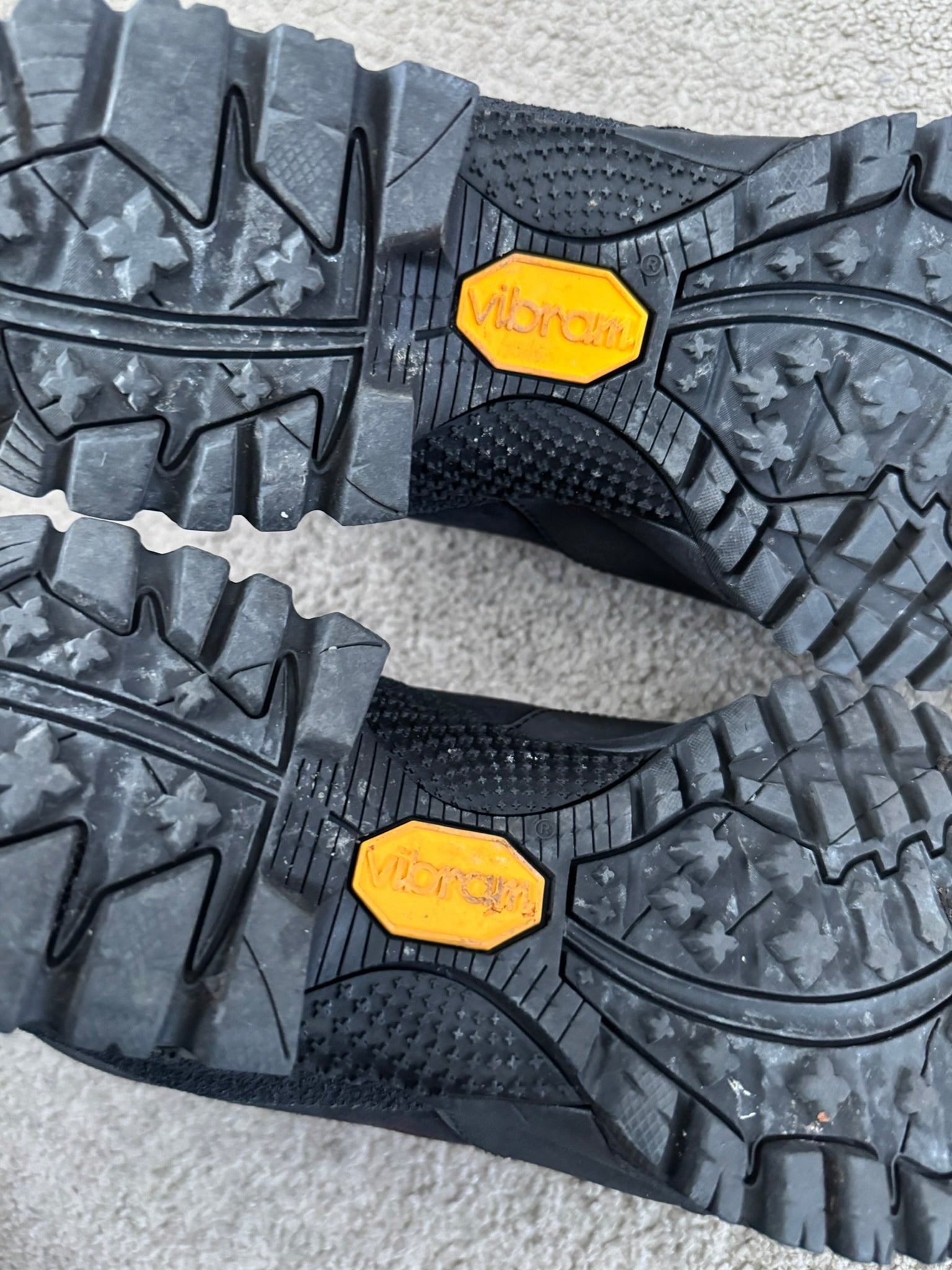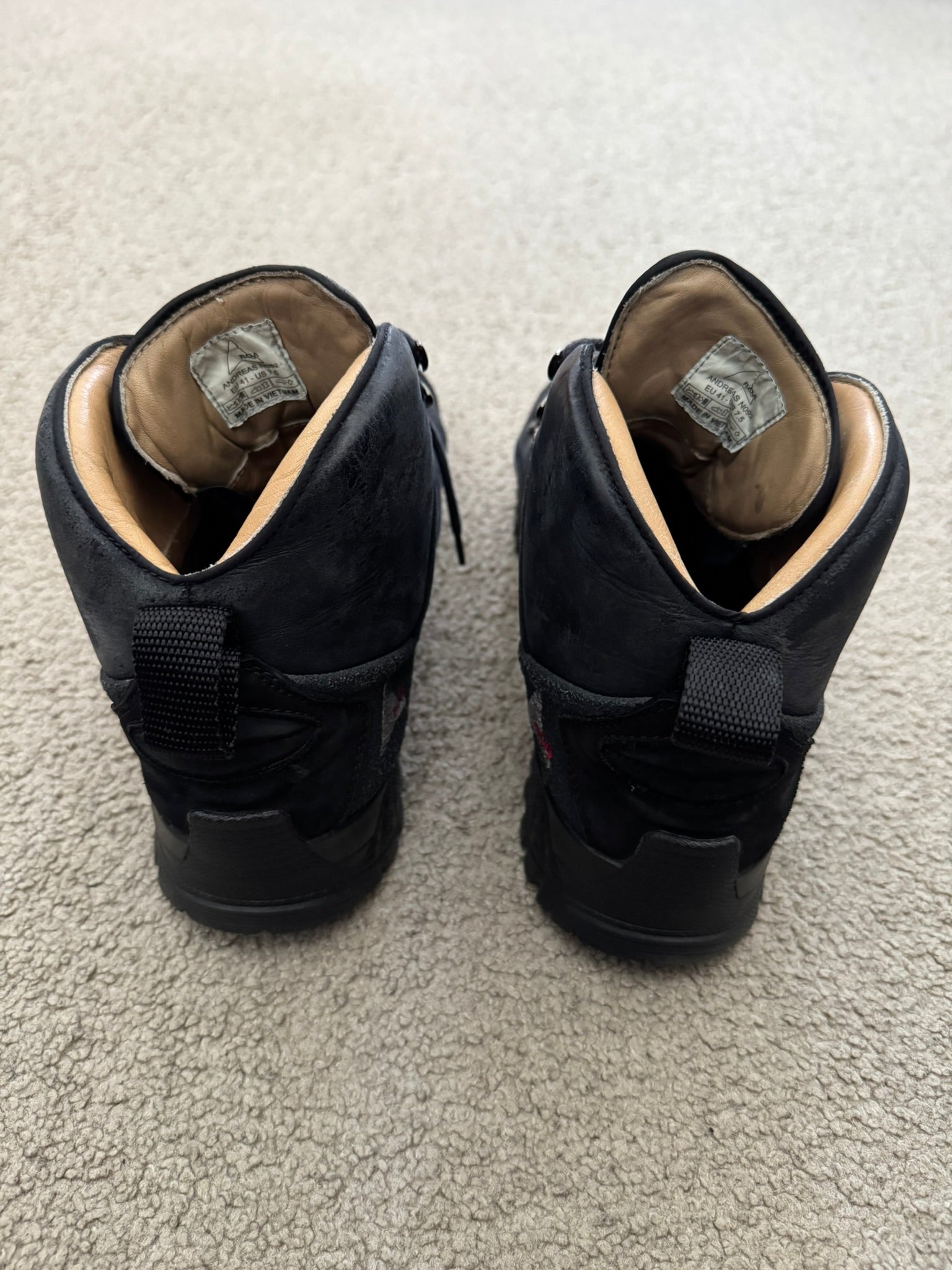 From Italian outdoor fashion label and footwear brand ROA. These high top "Andreas VAR N.092" hiking boots made from a black leather feature intentional subtle paint splatter details at the front & sides, ROA logo printed on toebox, embroidred ROA logo on the sides, two pull-loops, and Vibram Megagrip rubber soles. In great condition, some dirt, marks, and scuffs but is generally clean. Comes in original box. Tagged a size 41, fits around a U.S. size 8.