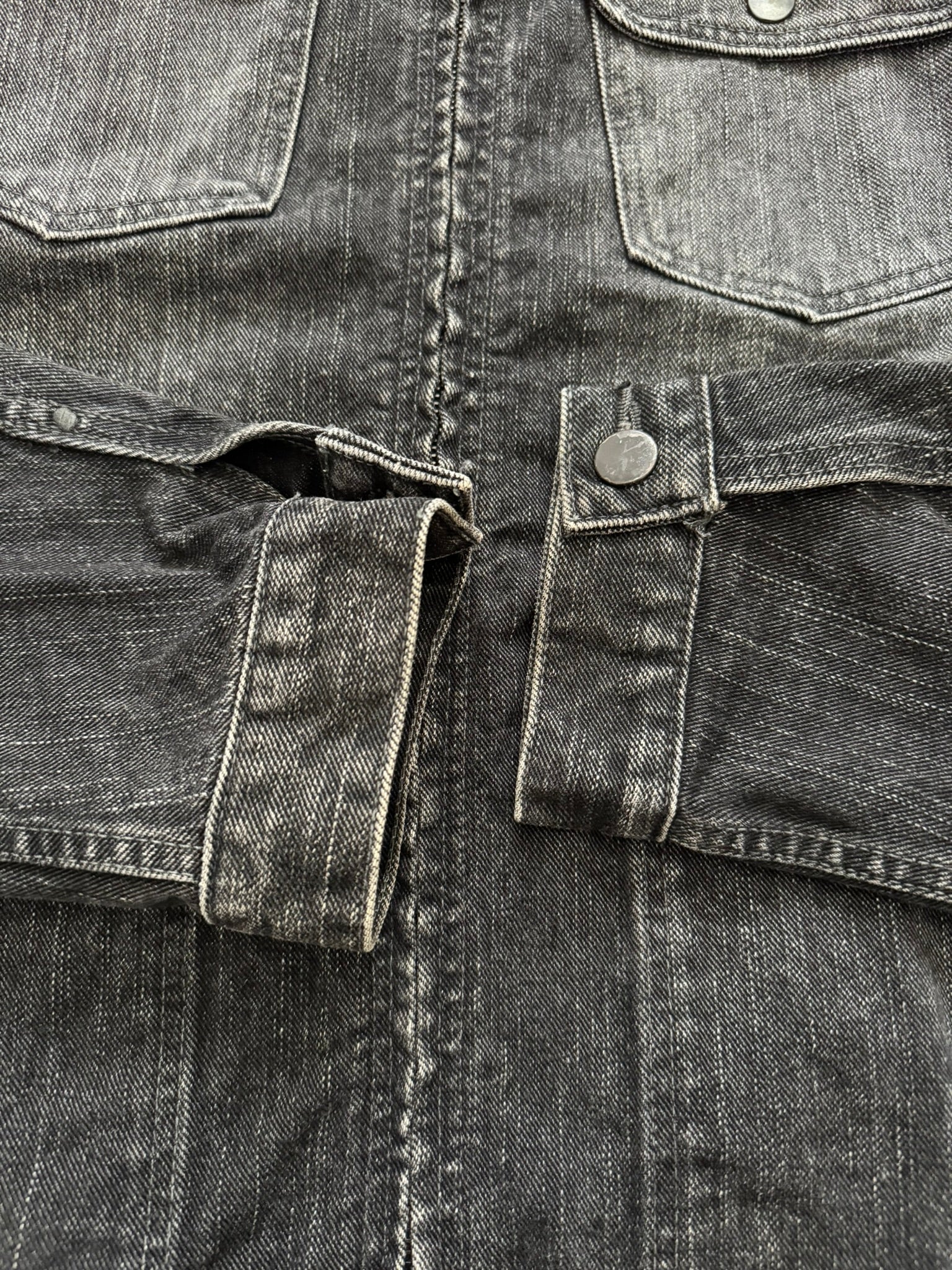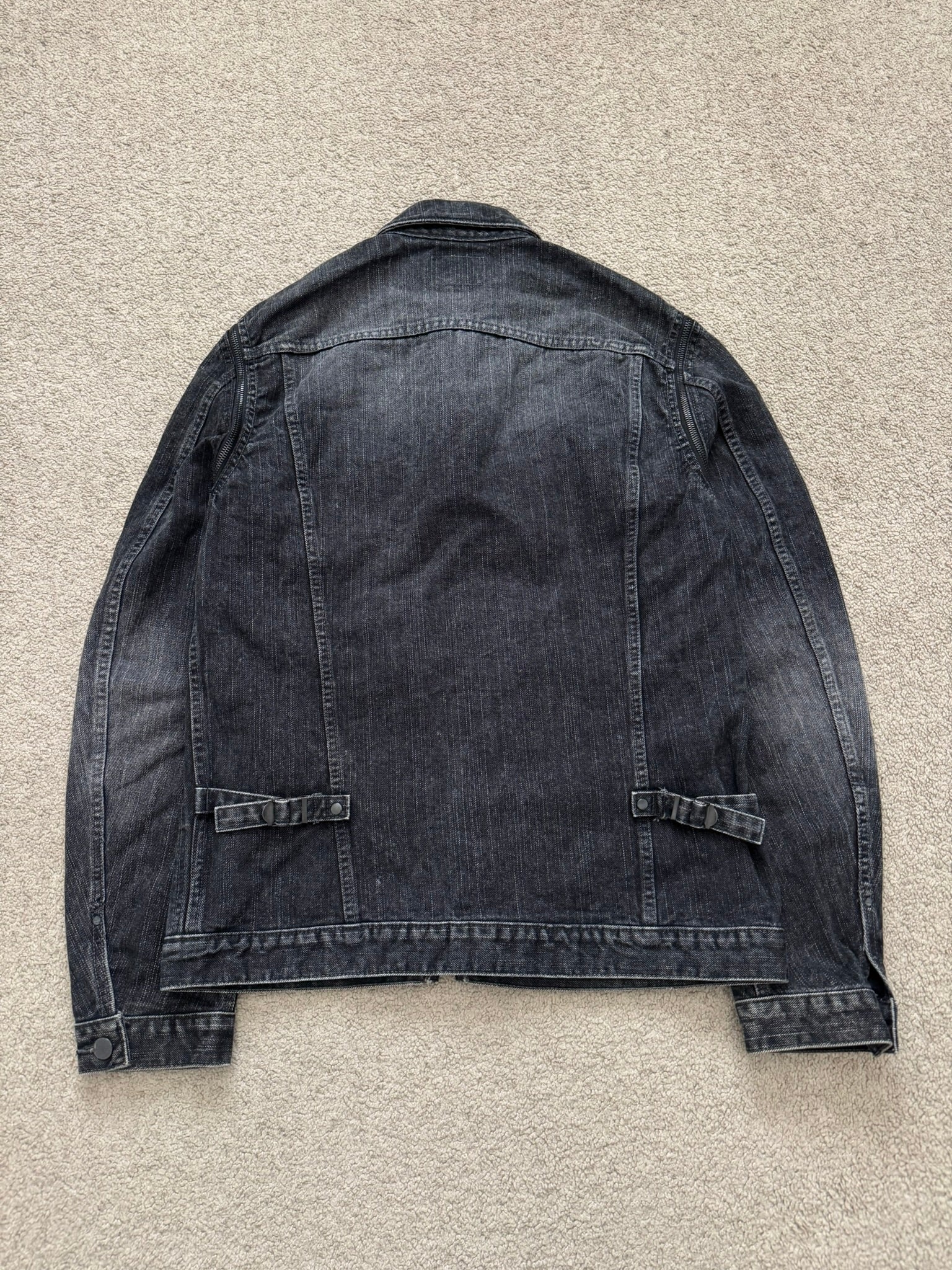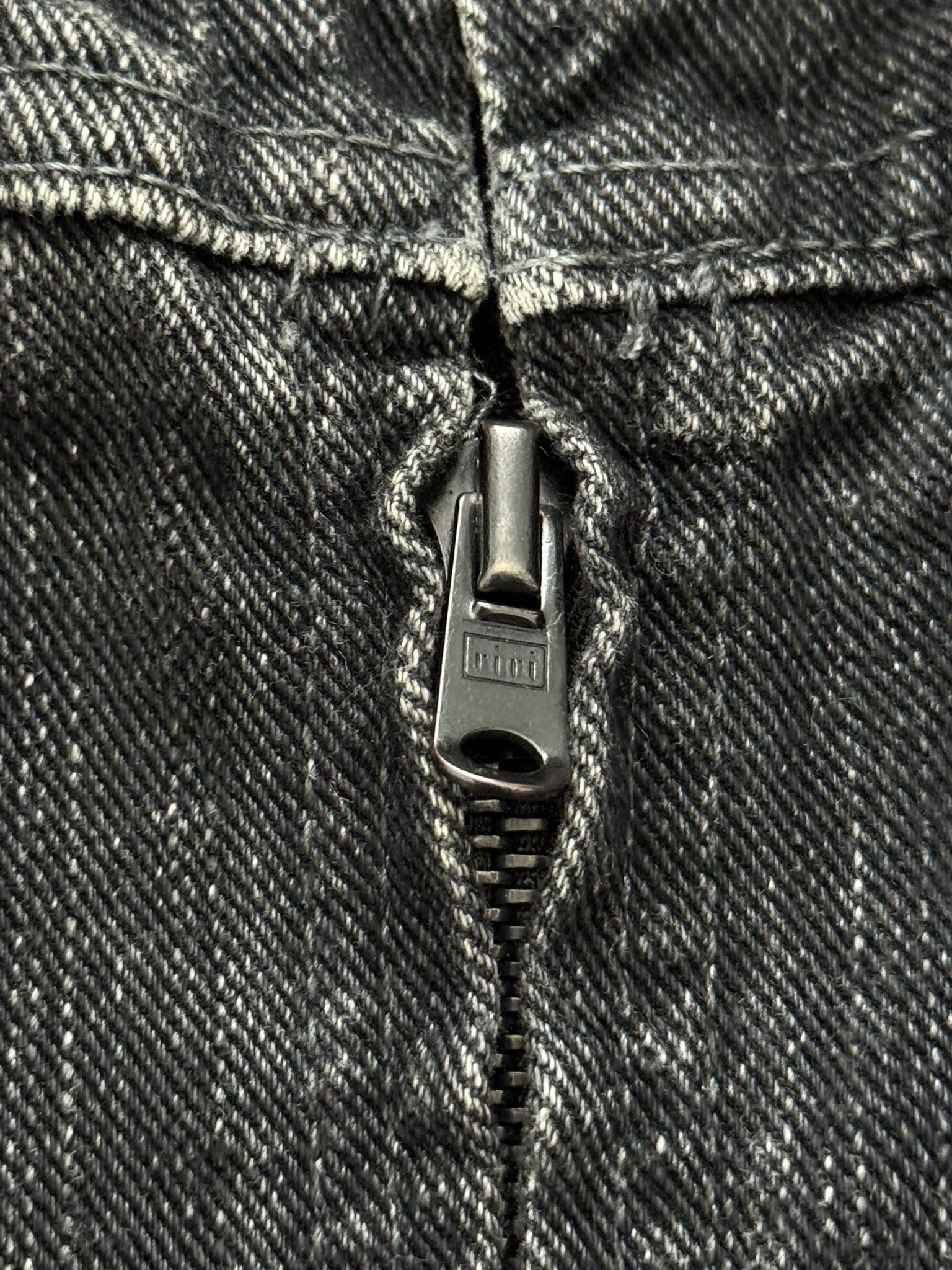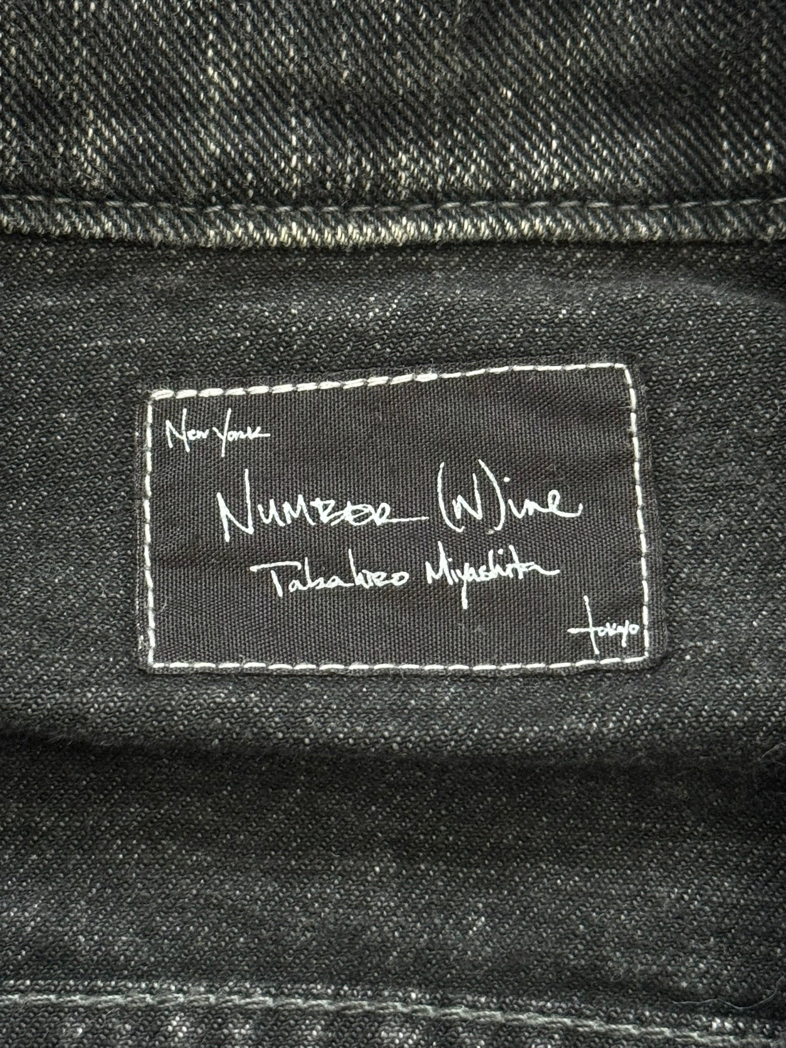 From Takahiro Miyashita's Number (N)ine and their SS04 collection titled "Dream Baby Dream." This rare faded black/grey denim jacket features two front chest pockets with the iconic PAIN text tab, two zipper pockets, a zipper + button closure, back cinches, and removable zipper sleeves that turns the jacket into a vest. In great condition, no real flaws. Made in Japan. Tagged a size 3.