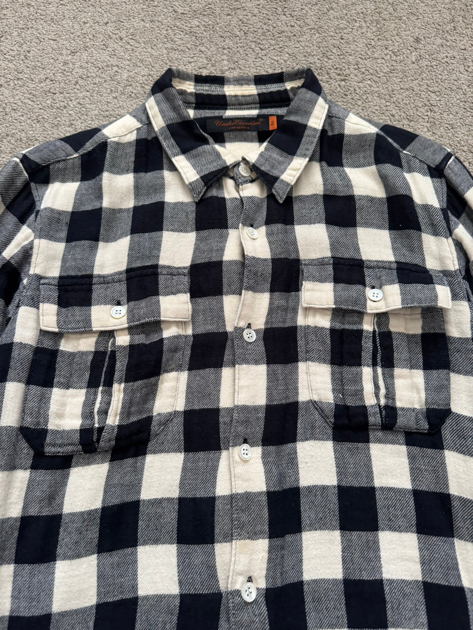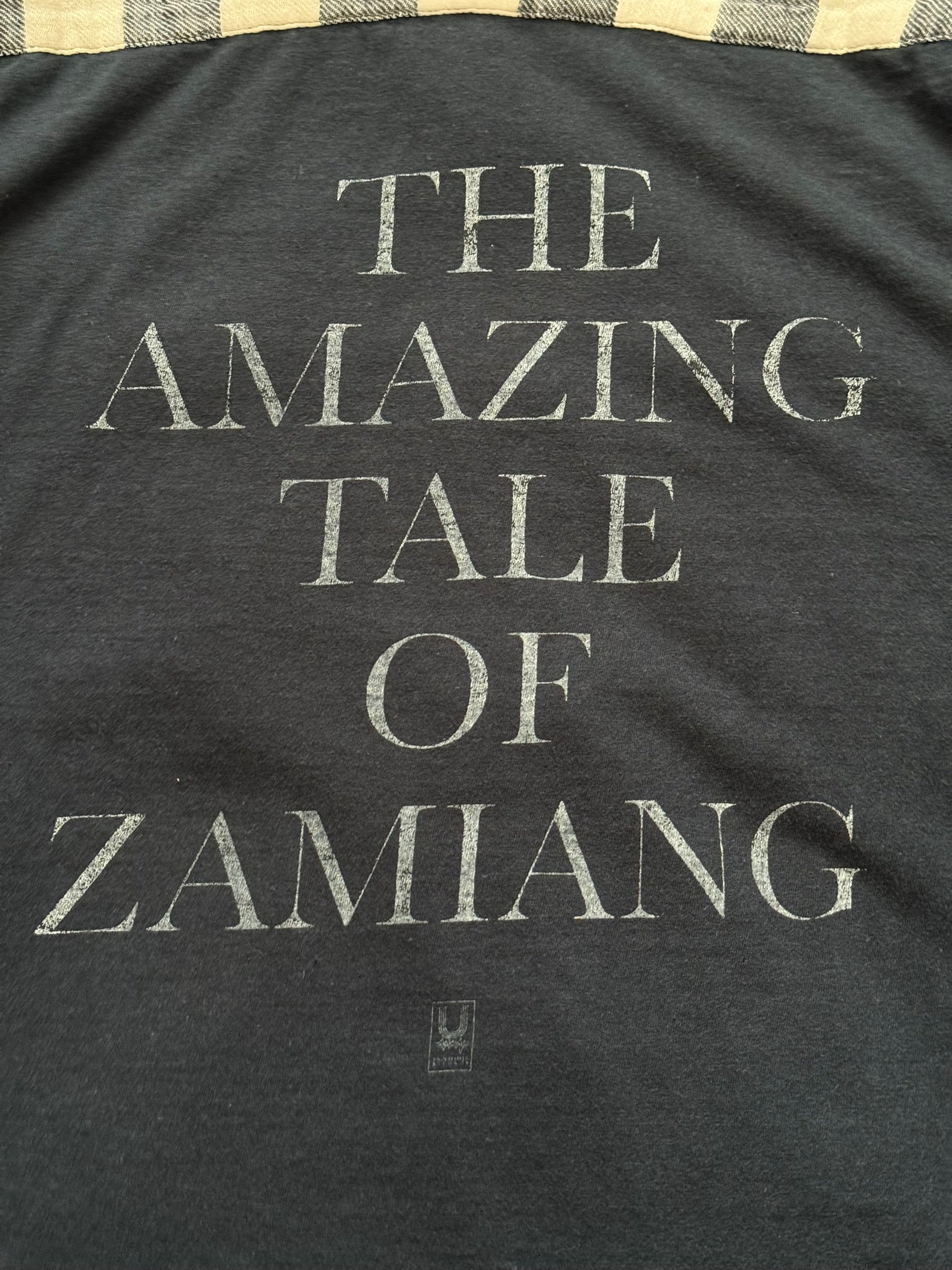From Jun Takahashi's Undercover and their SS06 collection titled "T." This hybrid flannel shirt features a black & white check pattern throughout with two cargo flap front pockets and a black cotton back with a graphic print that reads "The Amazing Tale of Zamiang." In good condition, minor wear throughout that is hardly noticeable; everything as pictured, no real flaws. Made in Japan. Tagged a JP size 2.