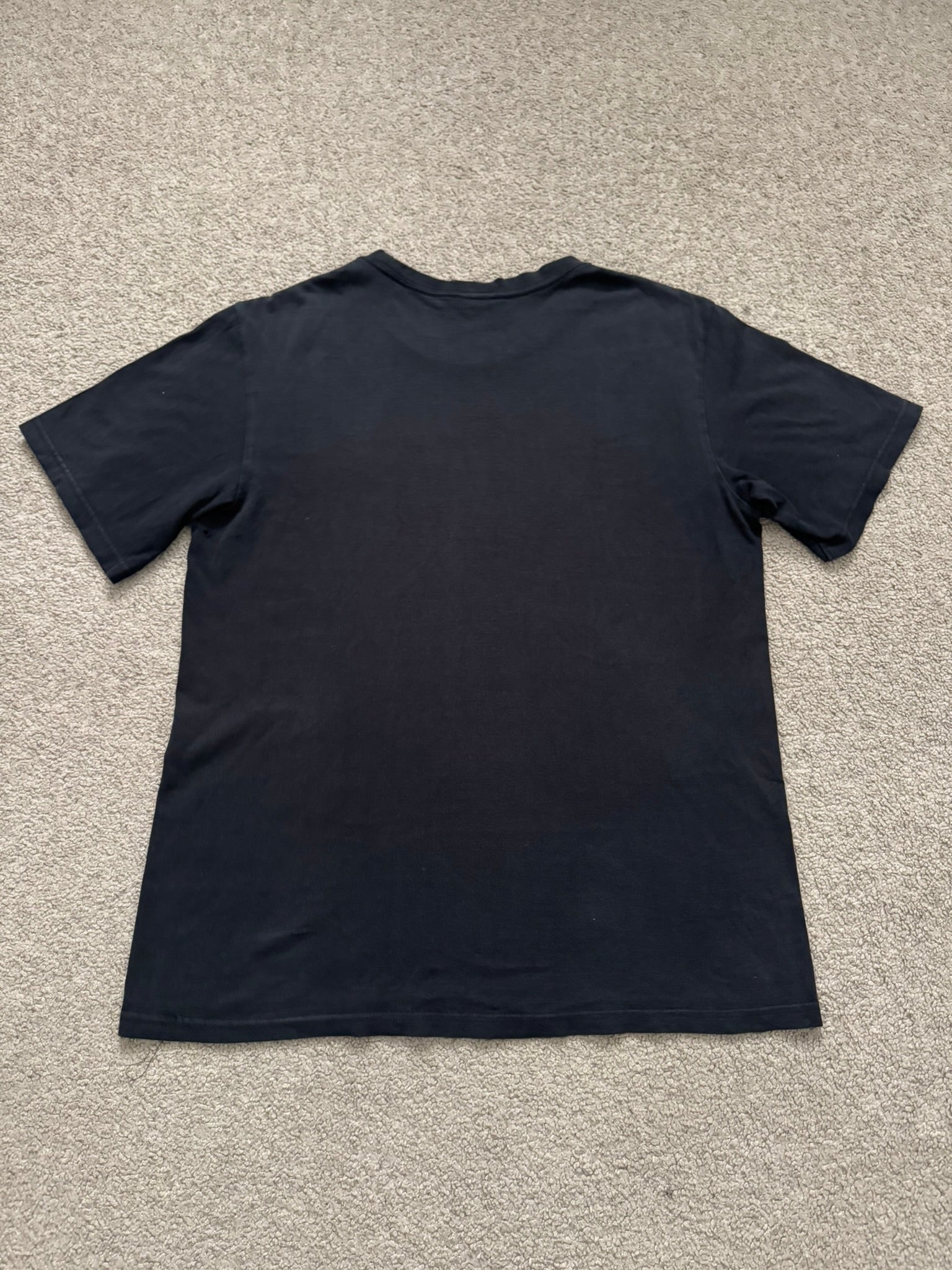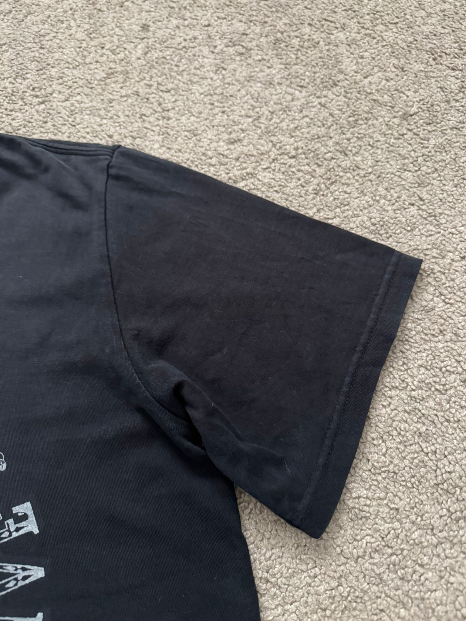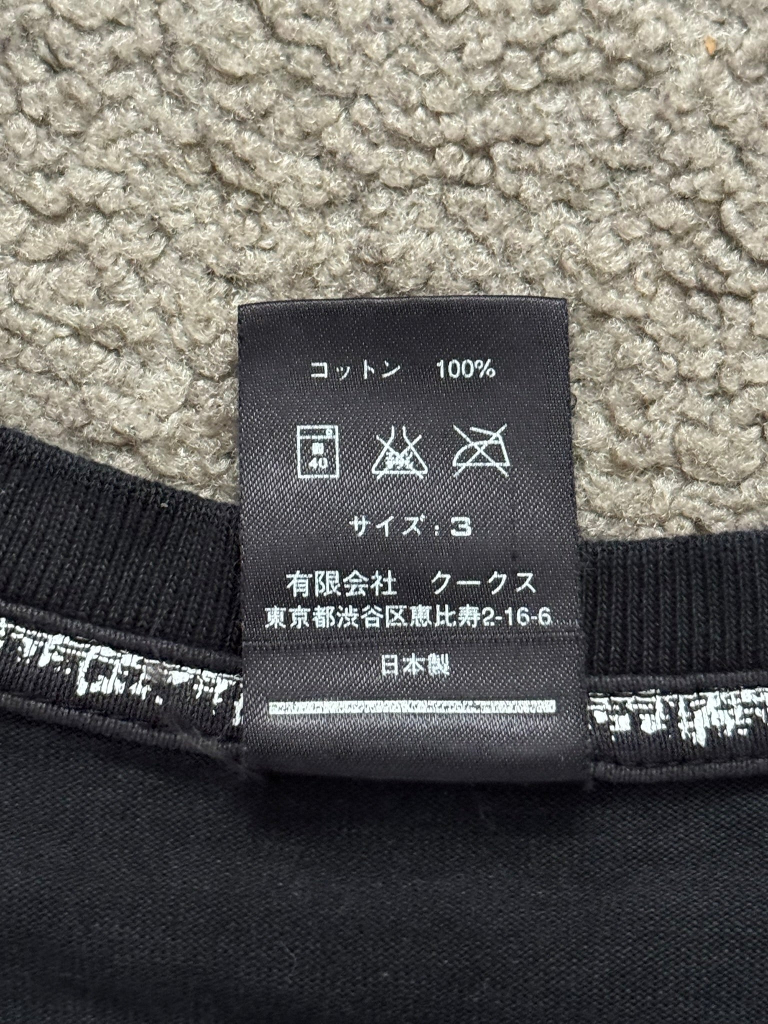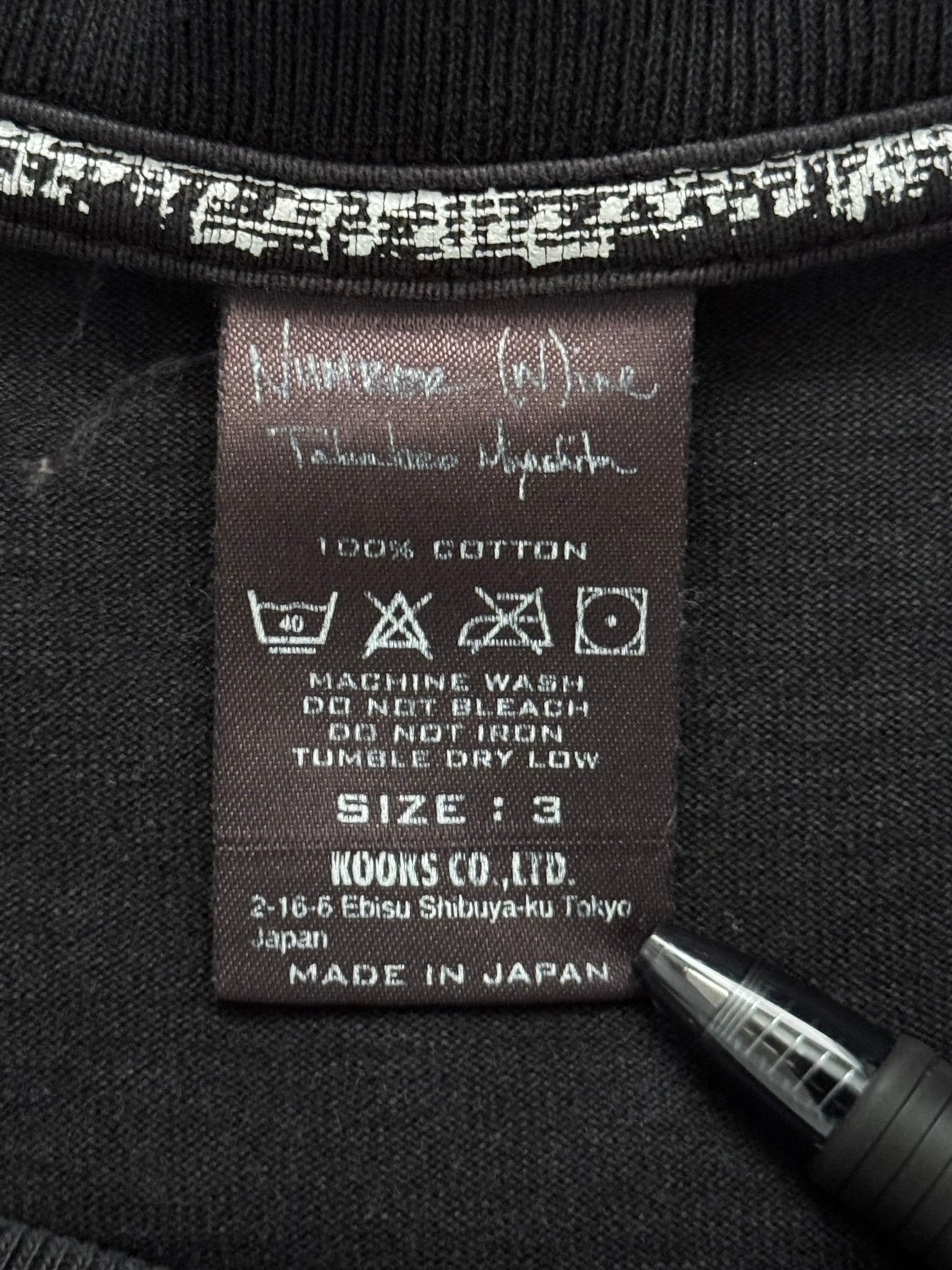 From Takahiro Miyashita's Number (N)ine and their SS07 collection titled "About A Boy." This black tee features a white front graphic with a skull motif (cowboy silhouettes inside the holes and text logo as the teeth), the collection title around it, and their iconic crying heart motifs. Made in Japan. In great condition, no real flaws. Tagged a size JP 3.