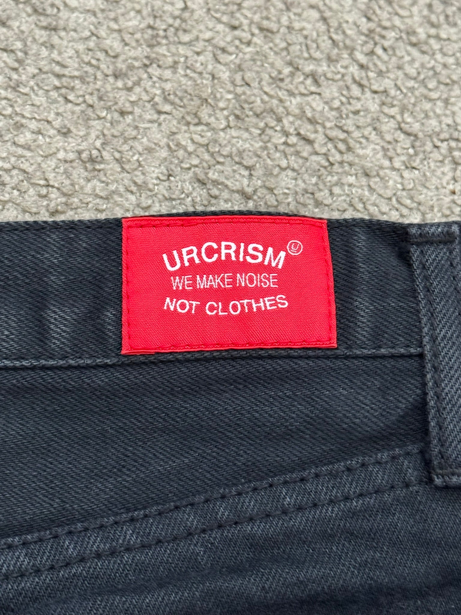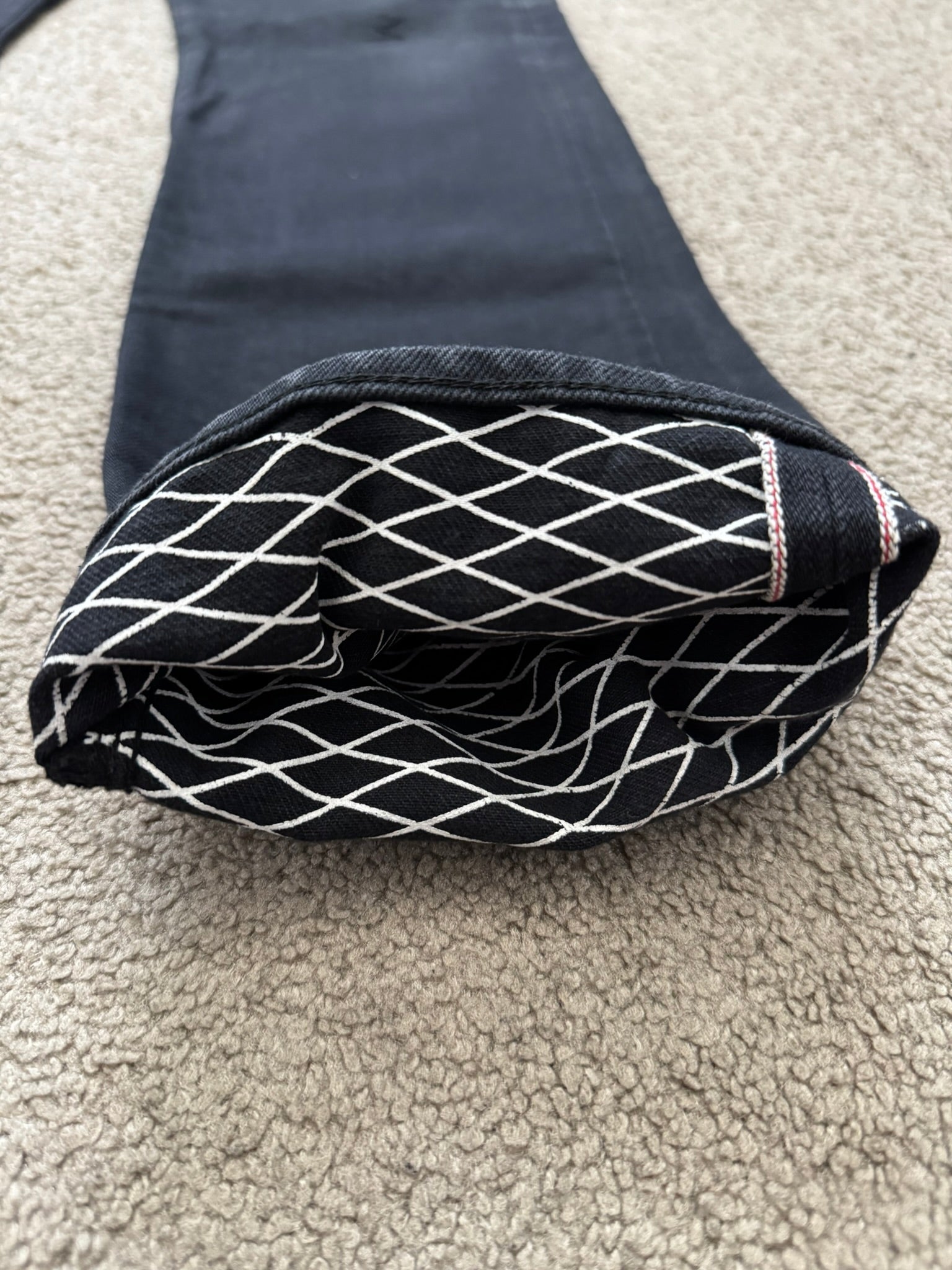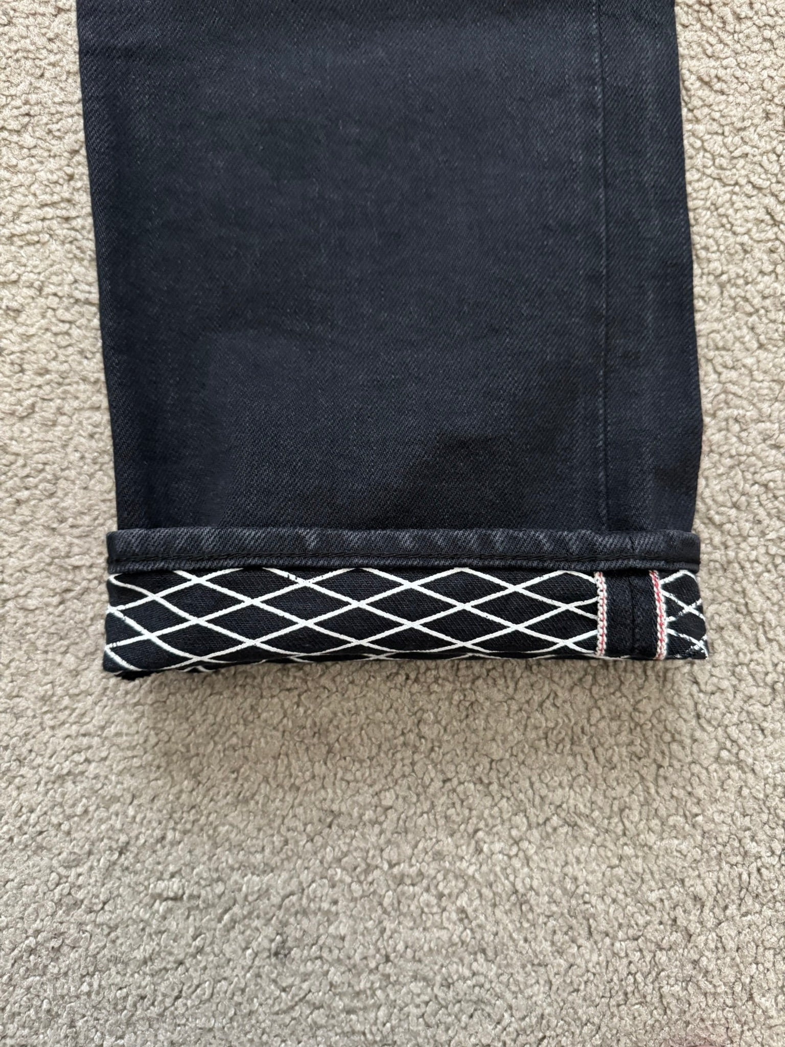 From Jun Takahashi’s Undercover and their SS08 collection titled “Summer Madness.” These black selvedge denim jeans feature the iconic Patti Smith lightning bolt on the knee, side fringe tassel details, red logo patch on the back, five pocket construction, a button + zipper fly, and a diamond grid pattern on the inside that can be seen when cuffed. In great condition, no real flaws. Made in Japan. Tagged a size 2.
