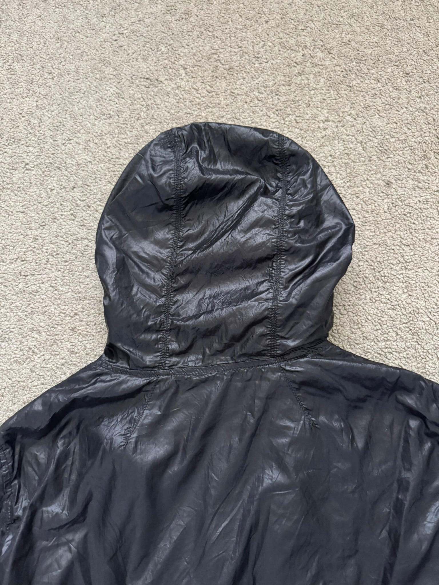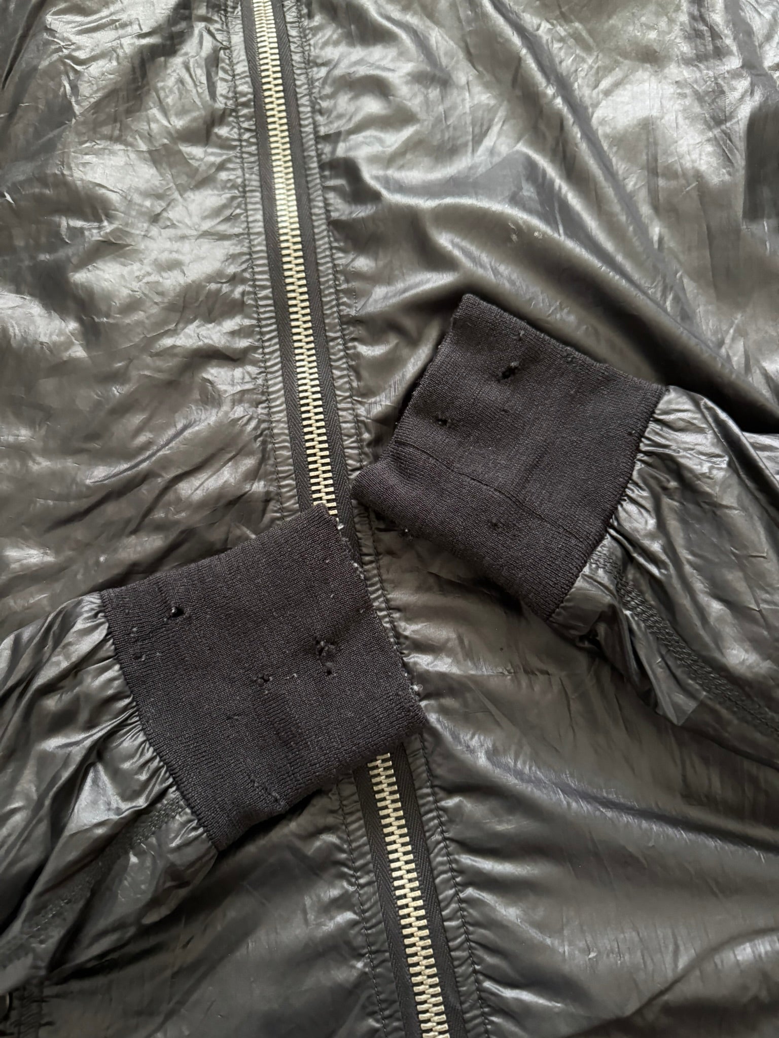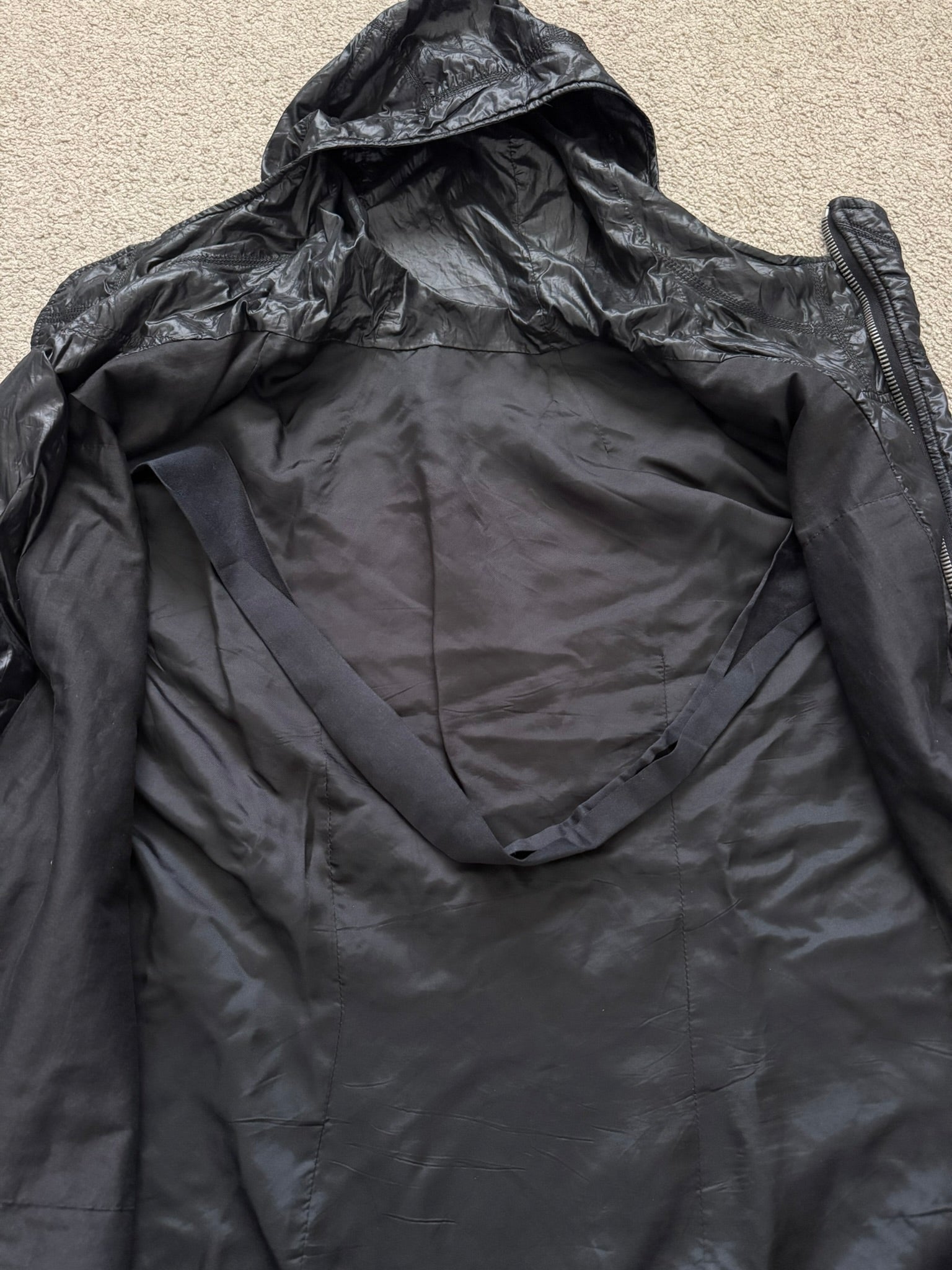 From Rick Owens’s namesake mainline label and his SS10 collection titled "Release." This extremely rare all black "scuba" bullet style jacket made from a shiny nylon material at the outer with a light synthetic padding features an asymmetrical silver RY zipper with an encompassing hood, two front pockets, two inside zipper pockets, and an internal carrying strap. In good condition, distressing at cuffs and minor distressing at zipper lining fabric (pictured); no other real flaws. Made in Italy. Tagged a size small.