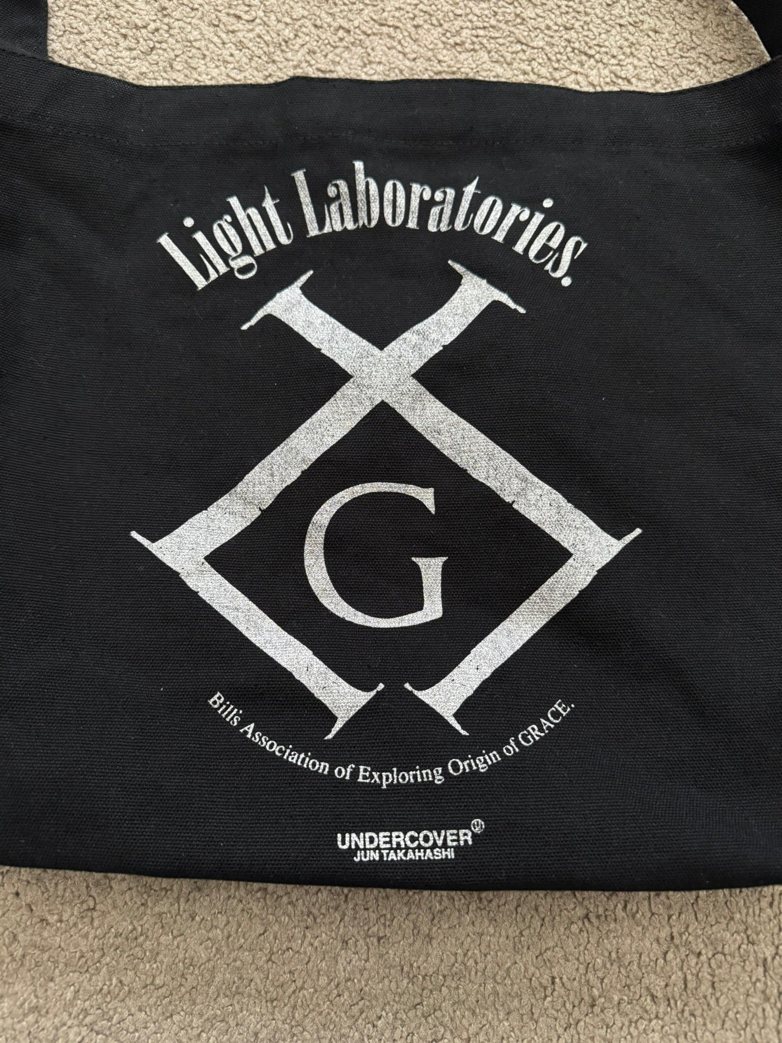 From Jun Takahashi's Undercover and his SS10 collection titled "Less But Better." This simple black shoulder sling bag made from a heavyweight cotton features a silver graphic print on the side with the text "Light Laboratories" (relating to the Grace motifs used in the collection) and one large compartment with a Velcro closure. In great condition, no flaws. Made in Japan. Measures to about 12 inches in height and 15 inches in width.