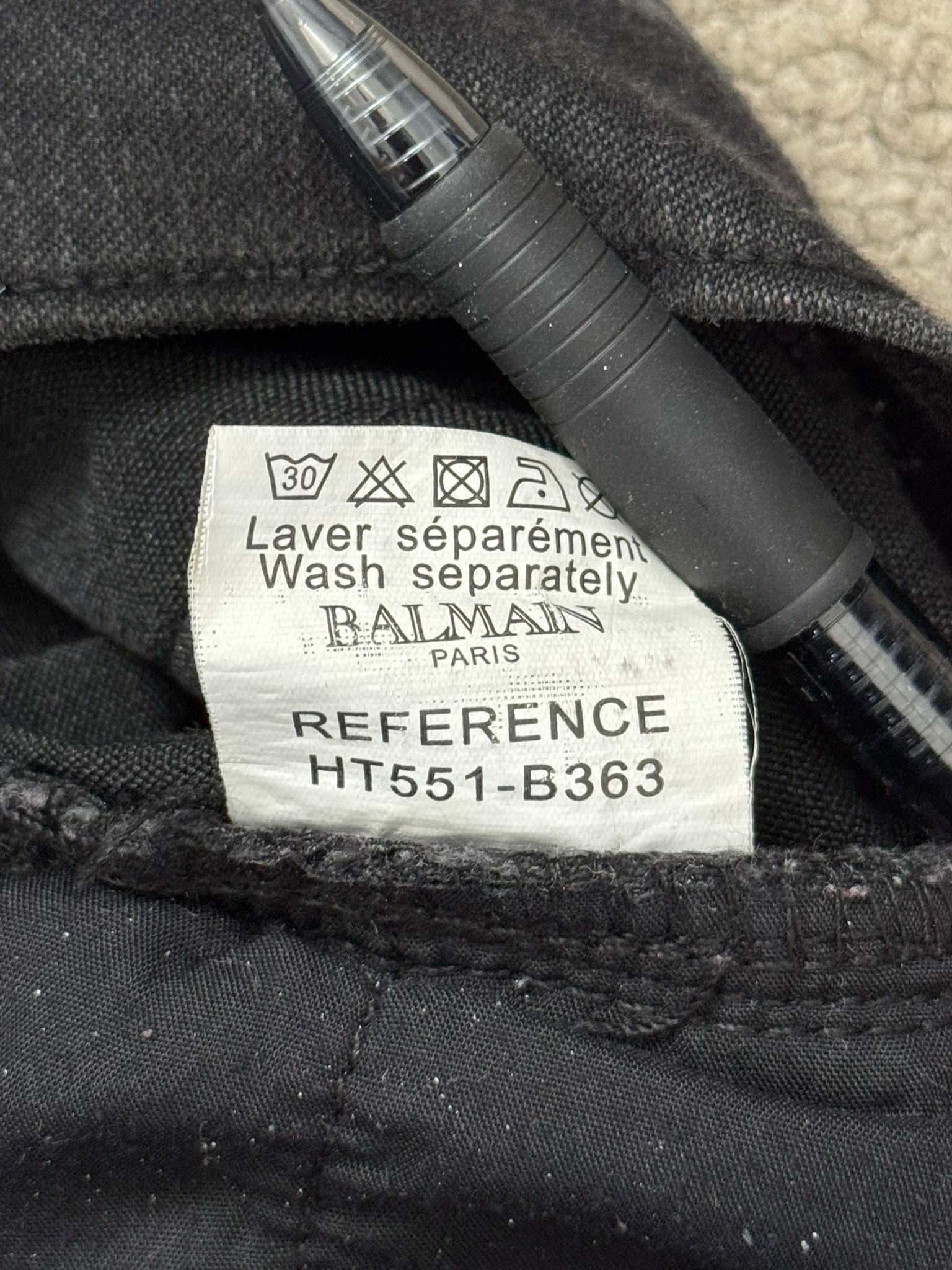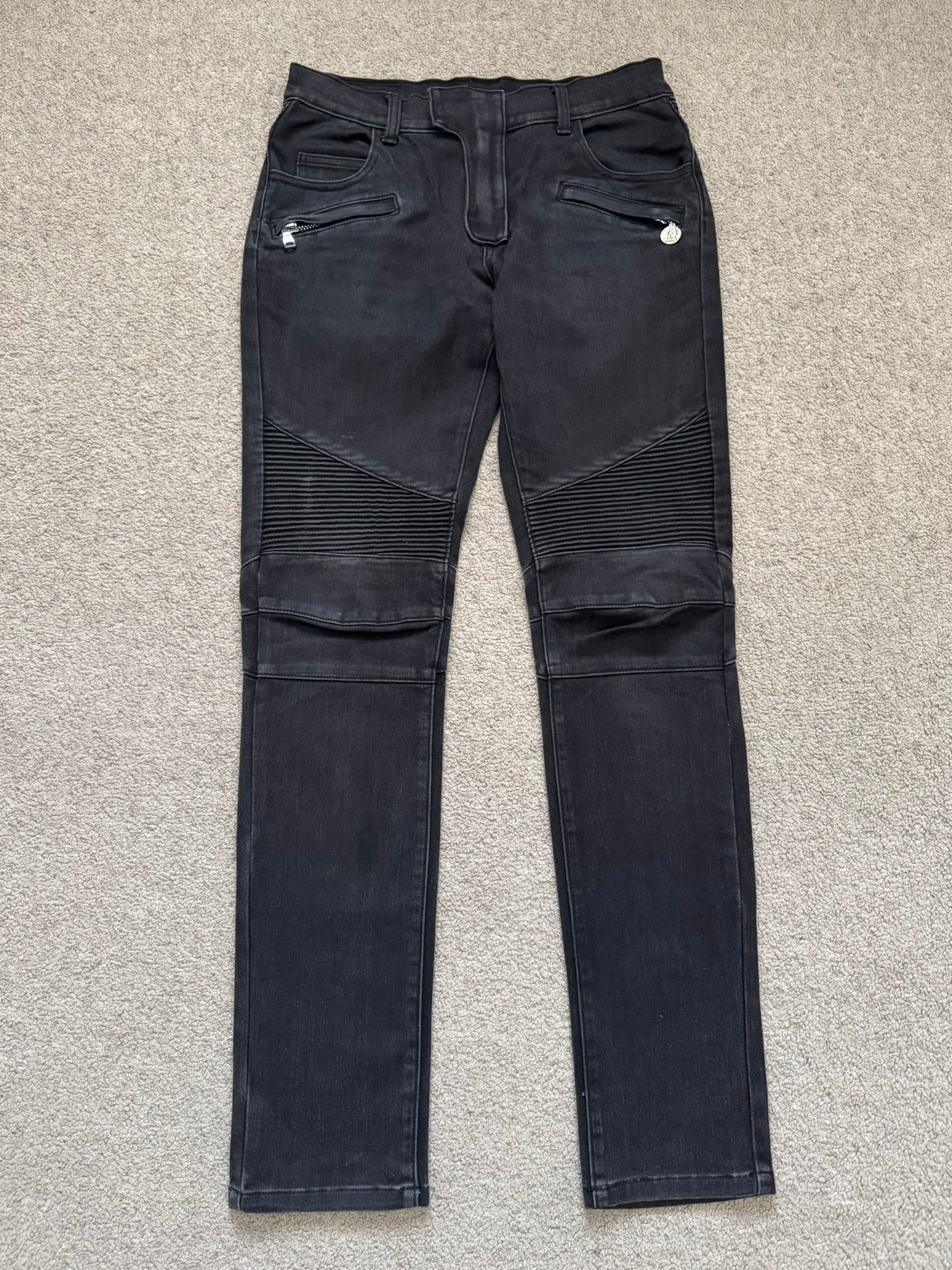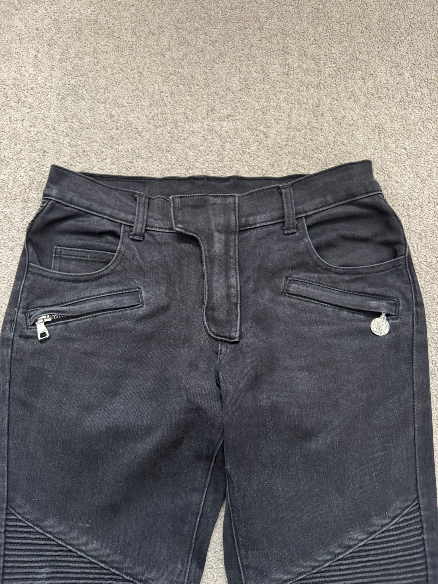 From Christophe Decarnin's tenure at luxury French fashion house Balmain and his SS11 collection. These classic biker style stretch denim jeans in a faded black color features two front zipper pockets with an eagle coin on one of them, back text logo patch, ribbing at the knee areas, and a zipper fly + double clasp closure. All zippers are quality silver Lampo zips. In great condition, all fading is intentional; no real flaws. Everything as pictured. Made in Italy. Tagged a size 30.