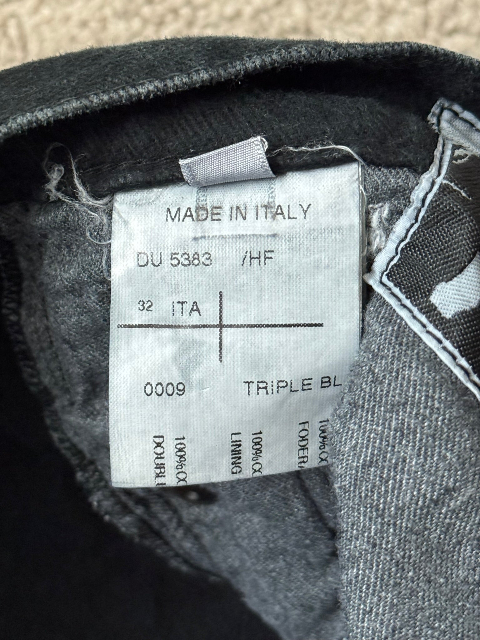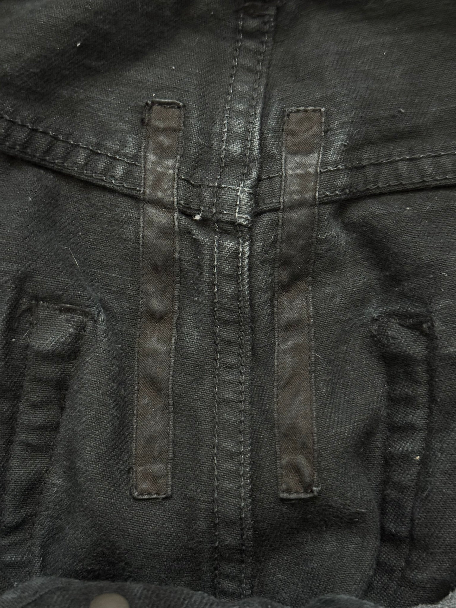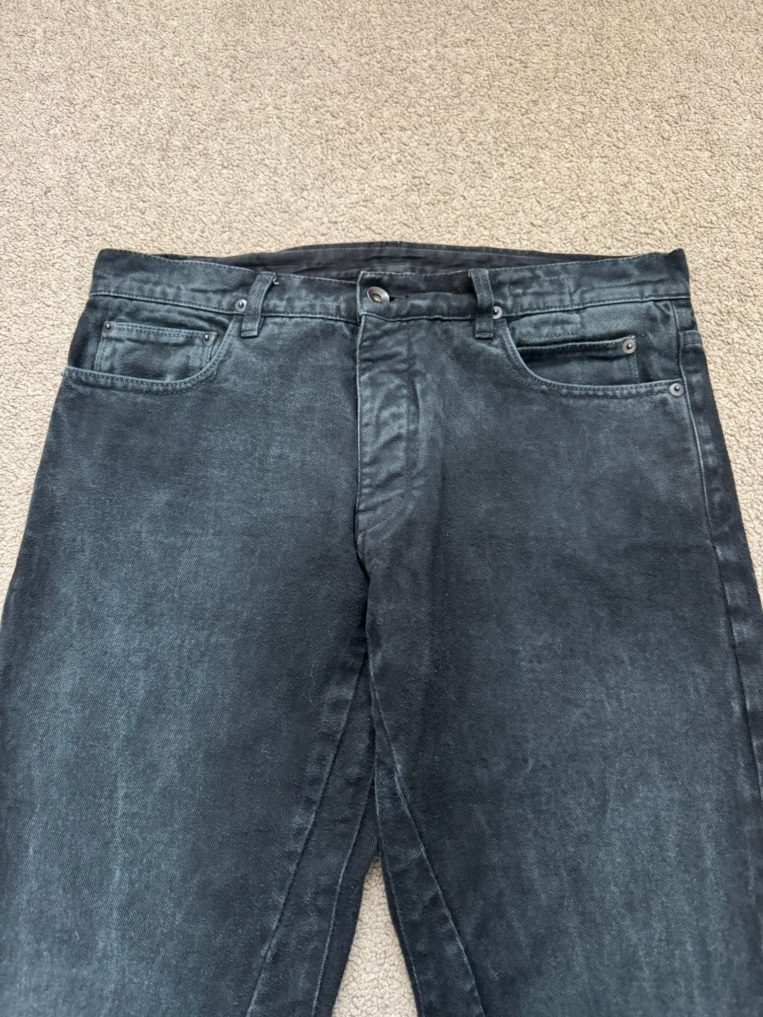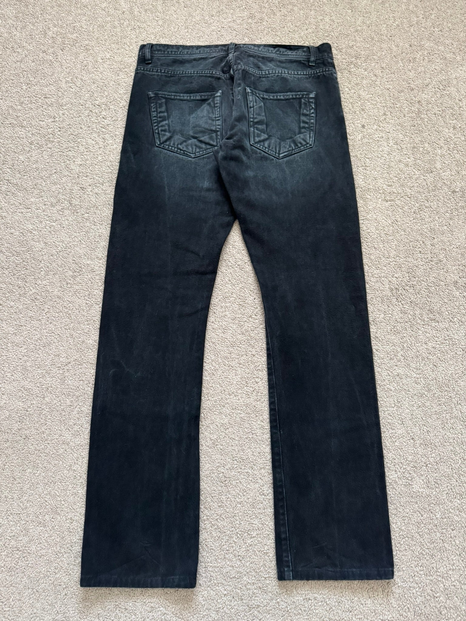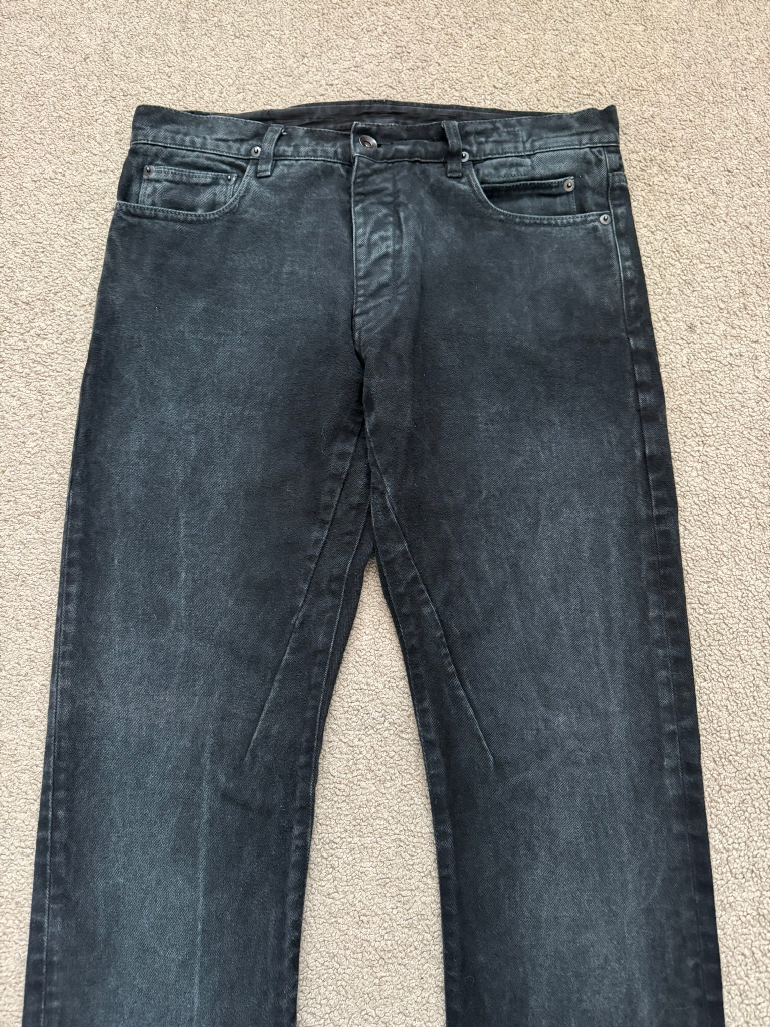 From Rick Owens’s DRKSHDW line and his SS11 collection titled "Anthem." These triple black "Detroit" cut jeans made from a thick heavy felted denim cotton material, made prior to 2013 with the old Olmar & Mirta tags, feature a special sporadic faded gradient color, six pocket construction, darting details at the front, and a button fly. In good condition, no real flaws. Everything as pictured. Made in Italy. Tagged a size 32.