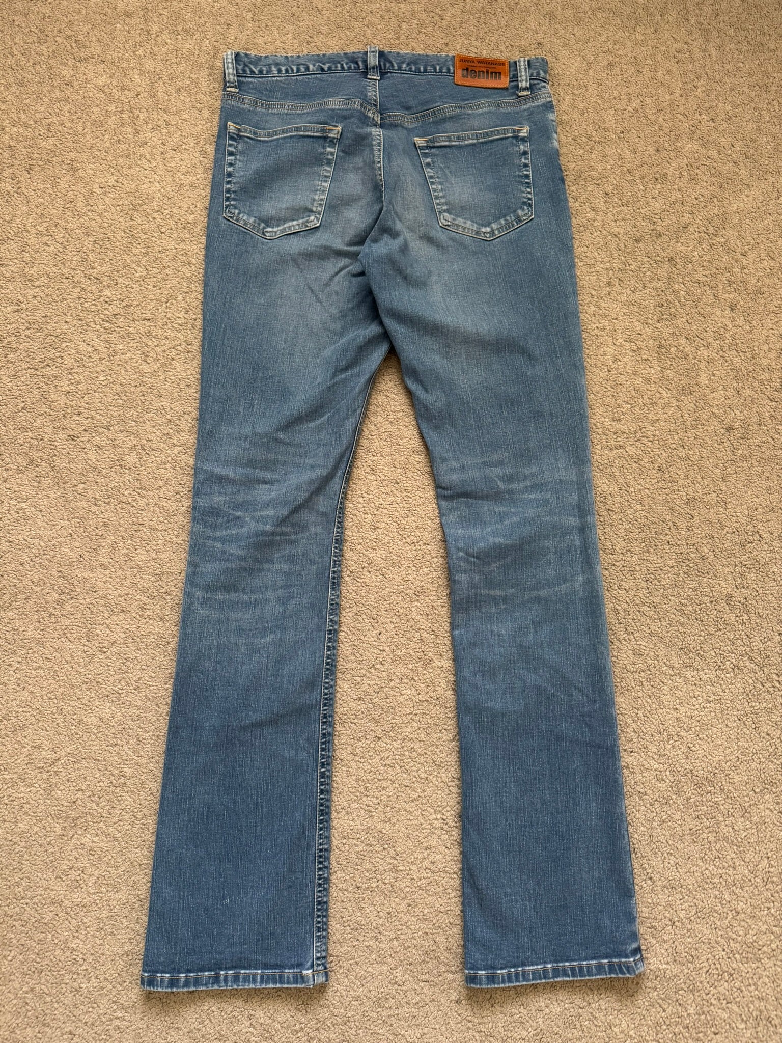 From Comme Des Garcons for Junya Watanabe's denim line and their SS12 collection. These light washed skinny flared bootcut denim jeans feature a five pocket design, and a zipper fly with an embossed button closure. In great condition, no real flaws as all fading is intentional. Made in Japan. Tagged a size medium.
