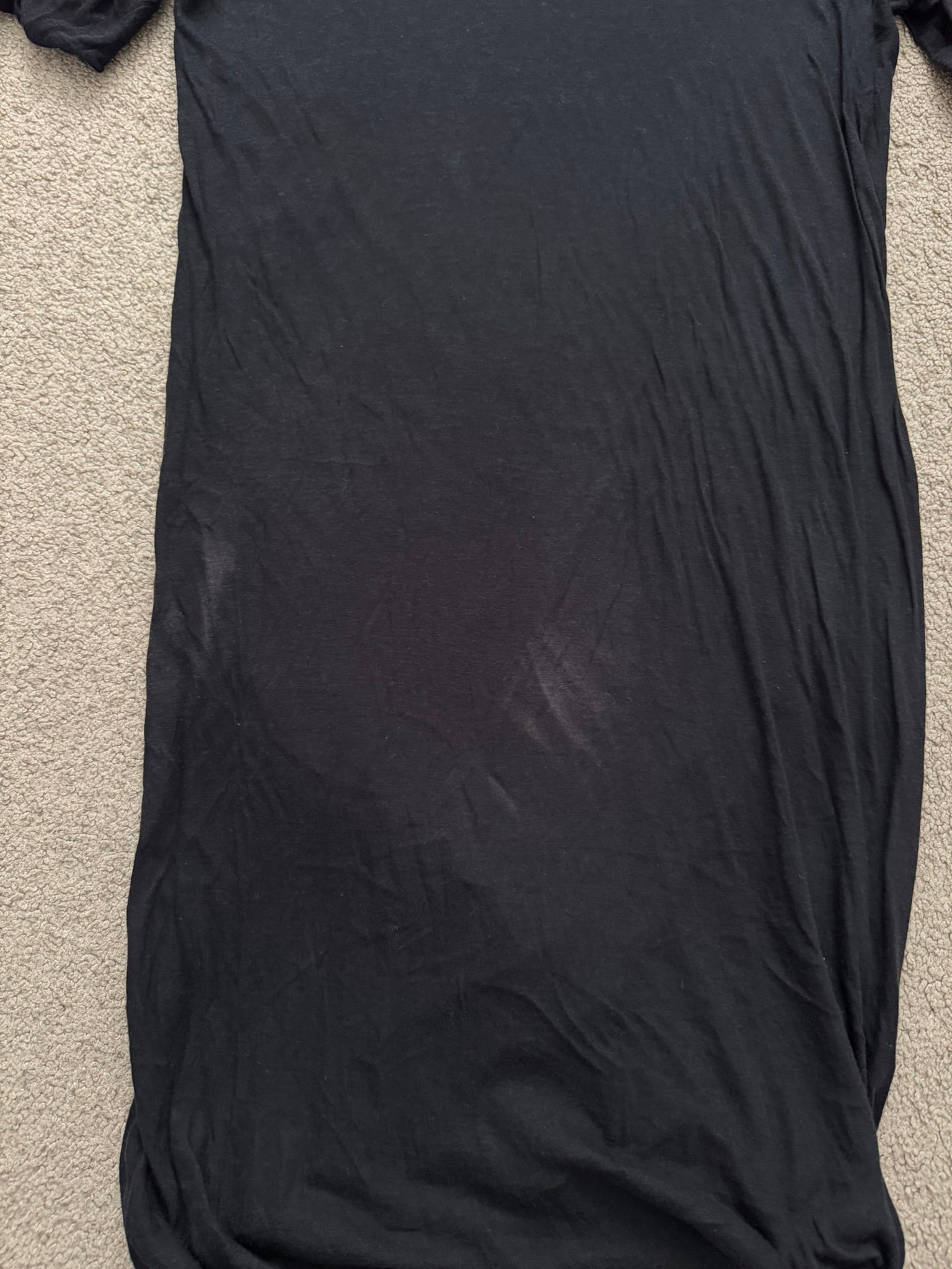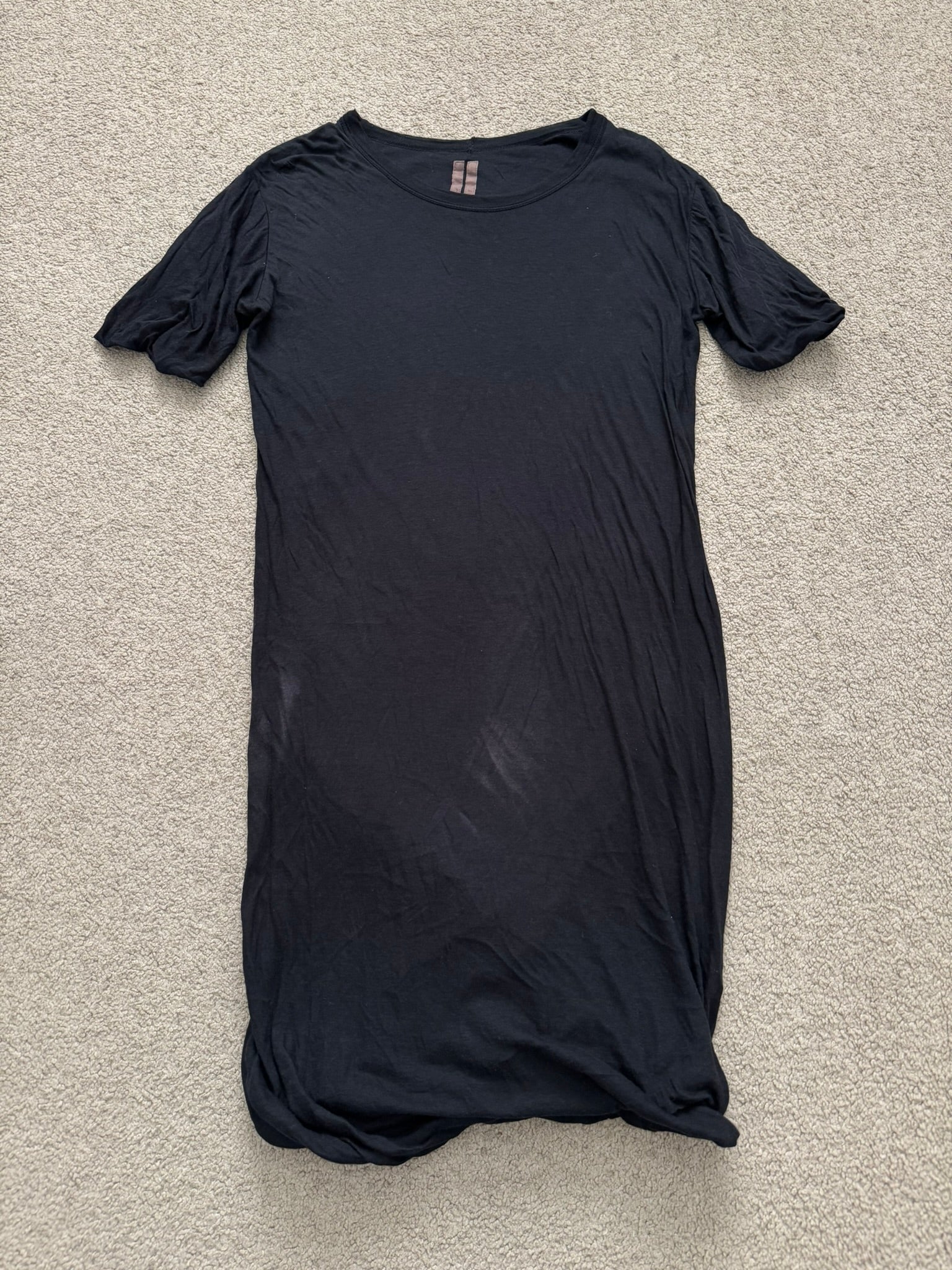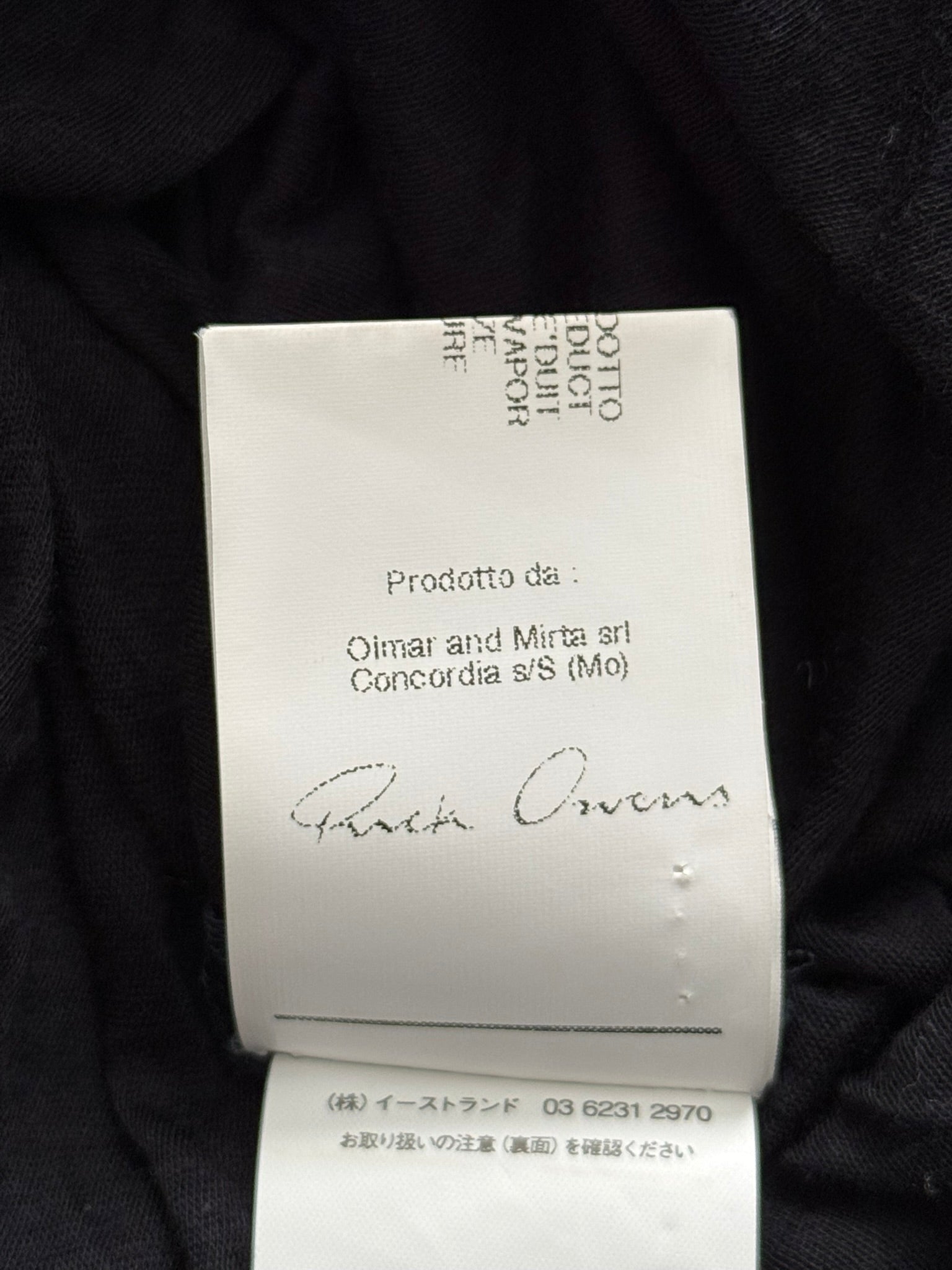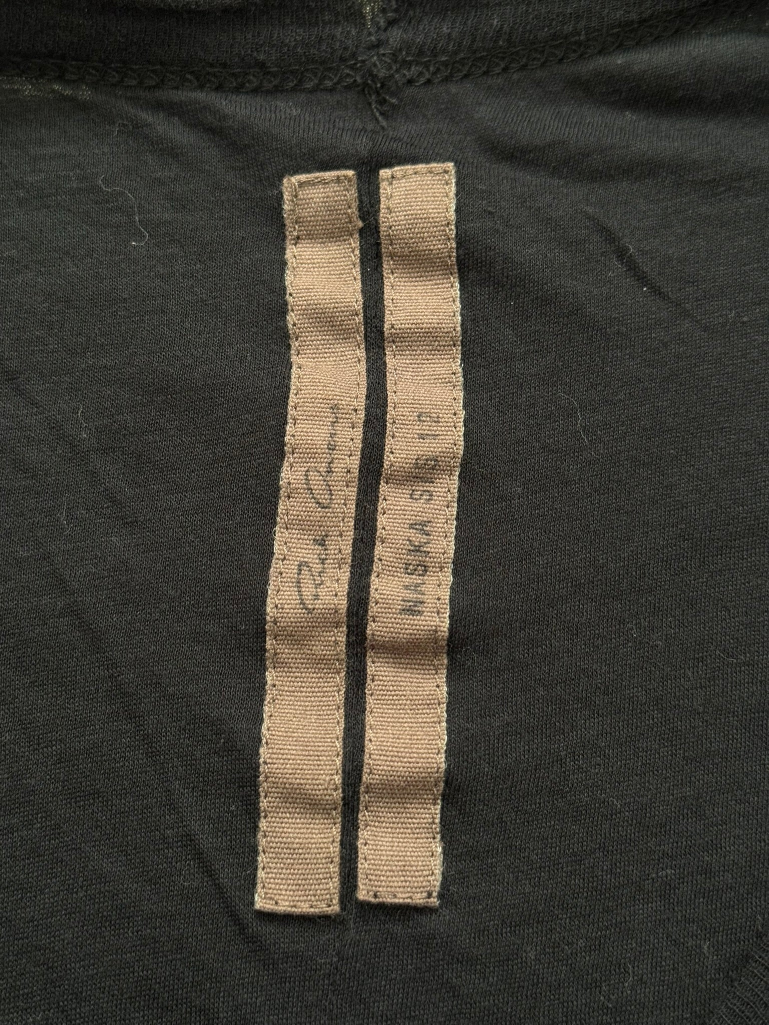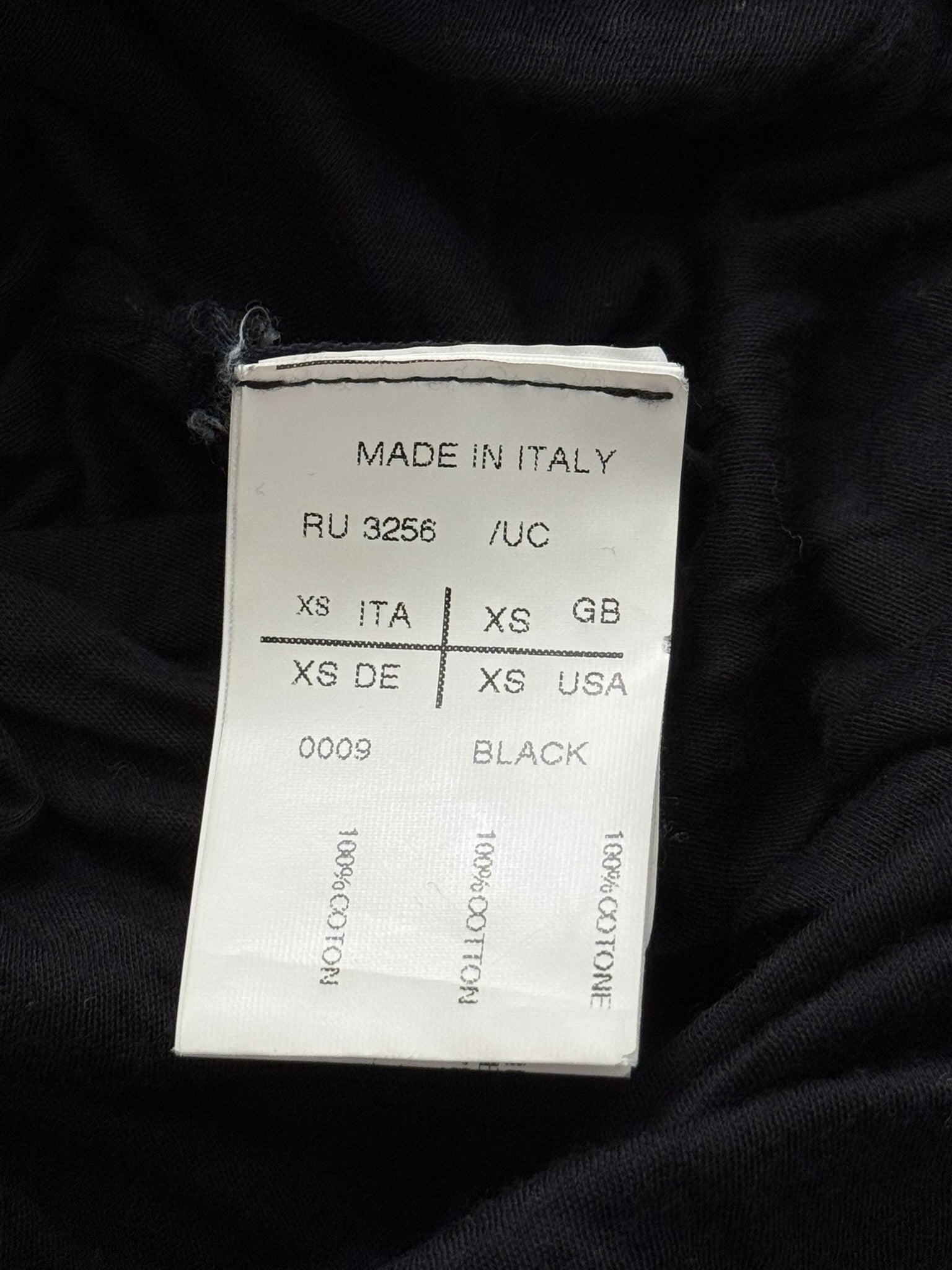 From Rick Owens’s namesake mainline label and his SS12 collection titled "Naska." A staple piece in a Rick wardrobe, this long black shirt features a double layer construction in their "unstable cotton" material that is meant to tightly attach and outline to your body. In good condition, minor fading on front; no other real flaws. Made in Italy. Tagged a size extra-small.
