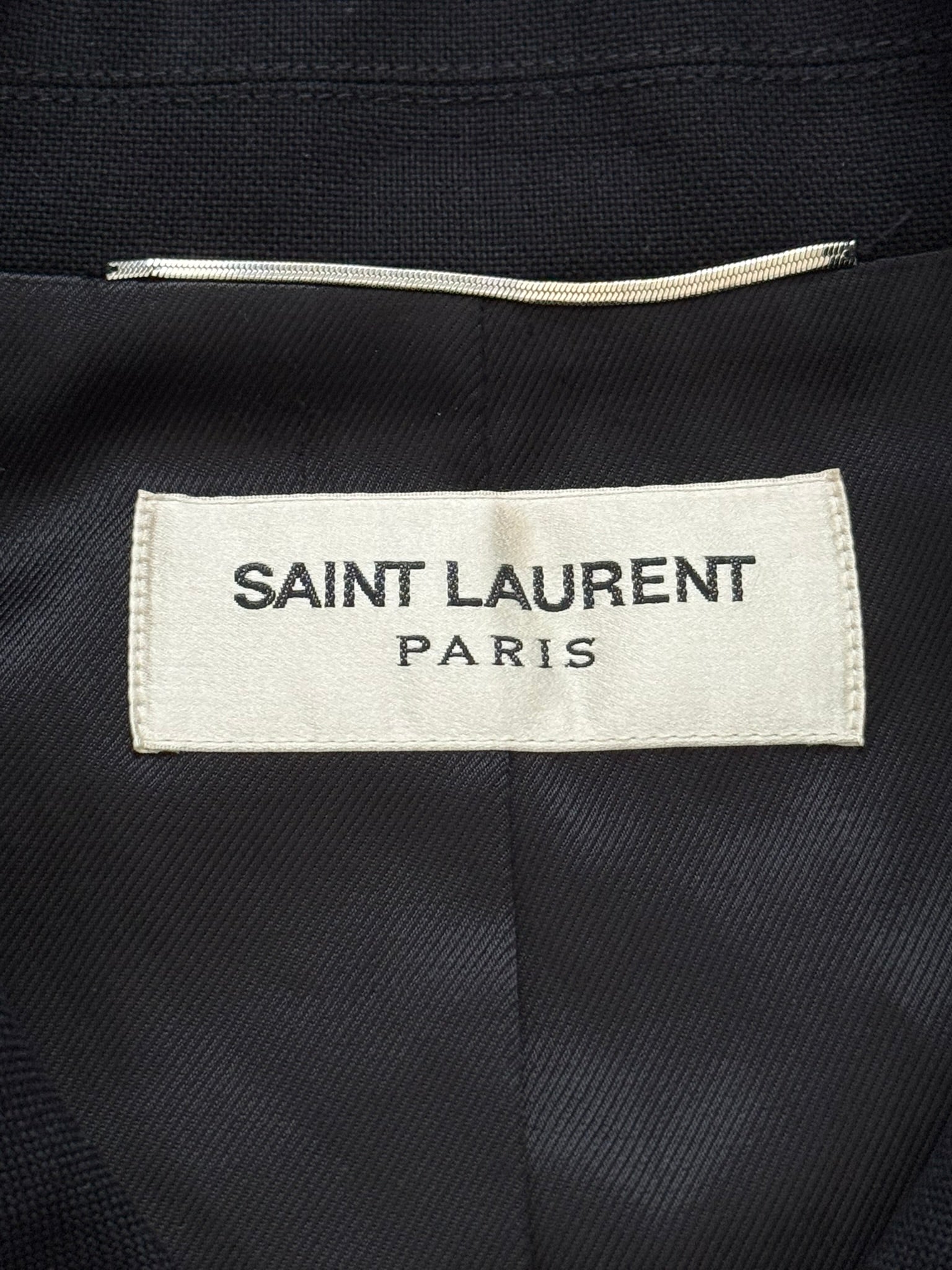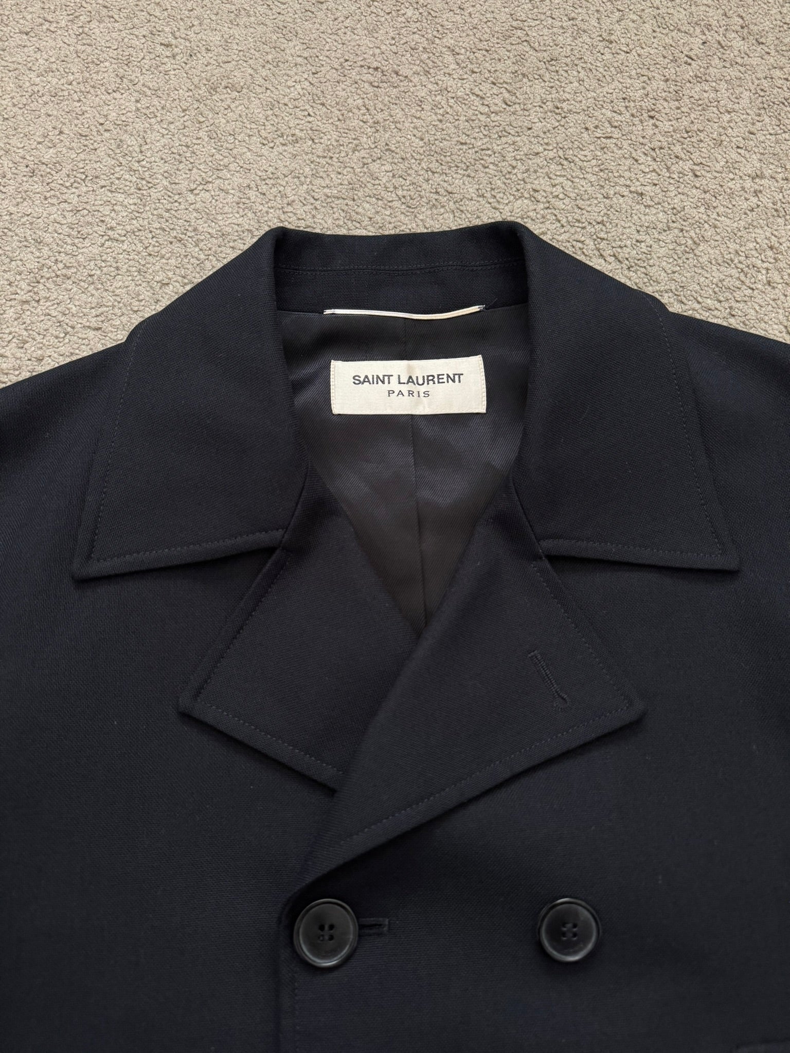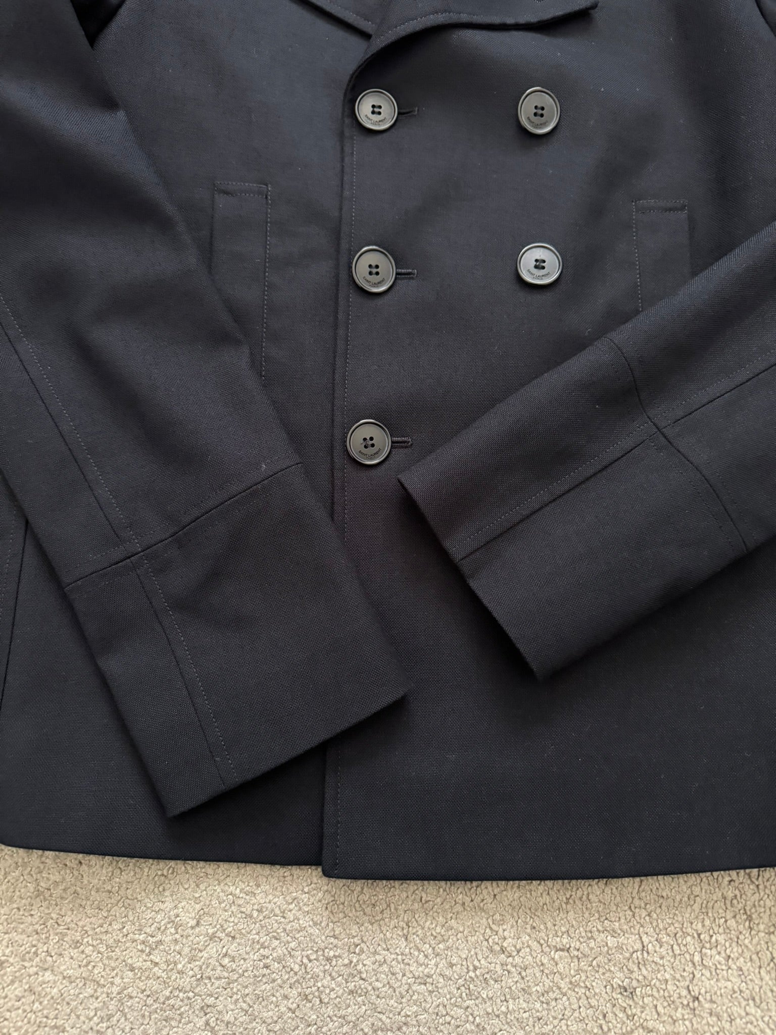 From Hedi Slimane's tenure at Saint Laurent Paris and his SS13 collection. This rare black short peacoat made with a cotton twill fabric outer features a double breasted button closure, notched lapels, two front pockets, and one inside button pocket. All buttons has embossed Saint Laurent Paris logos. In great condition, no other real flaws besides missing wash tag. Made in Italy. Previous owner said it was a size EU 46.