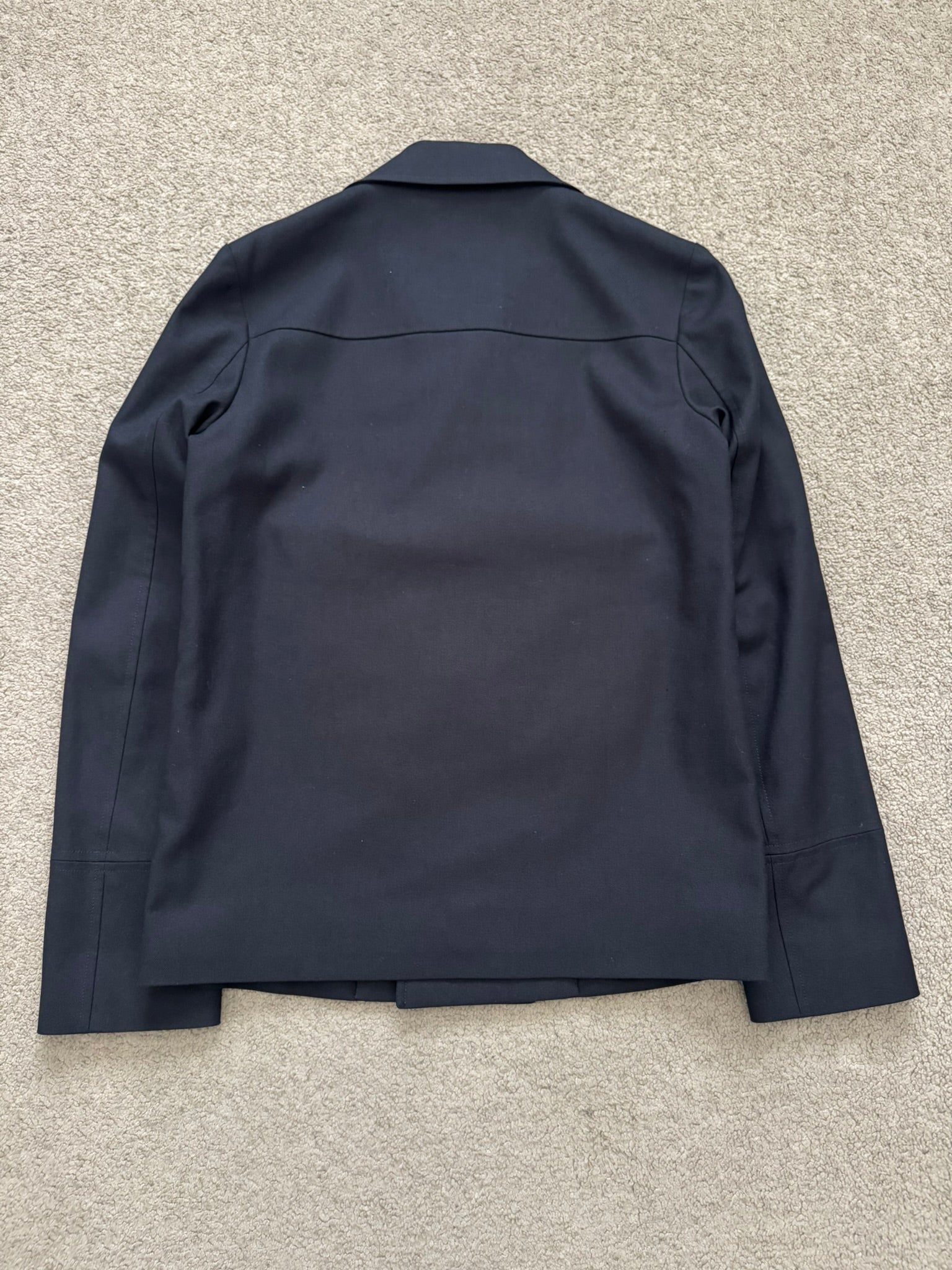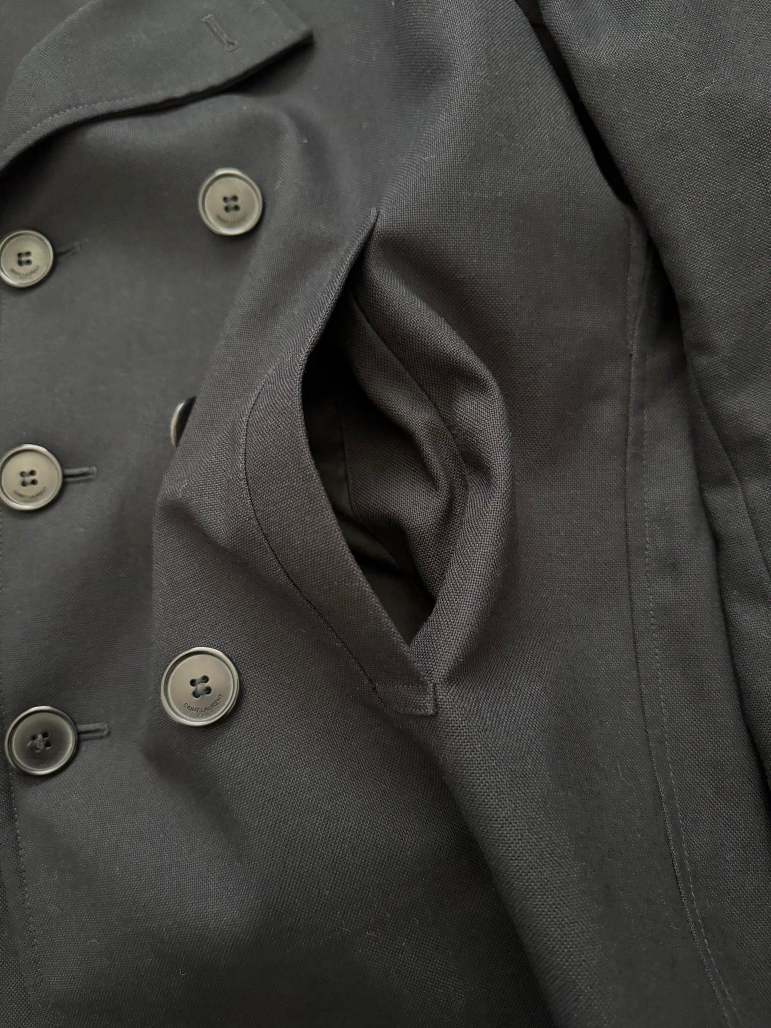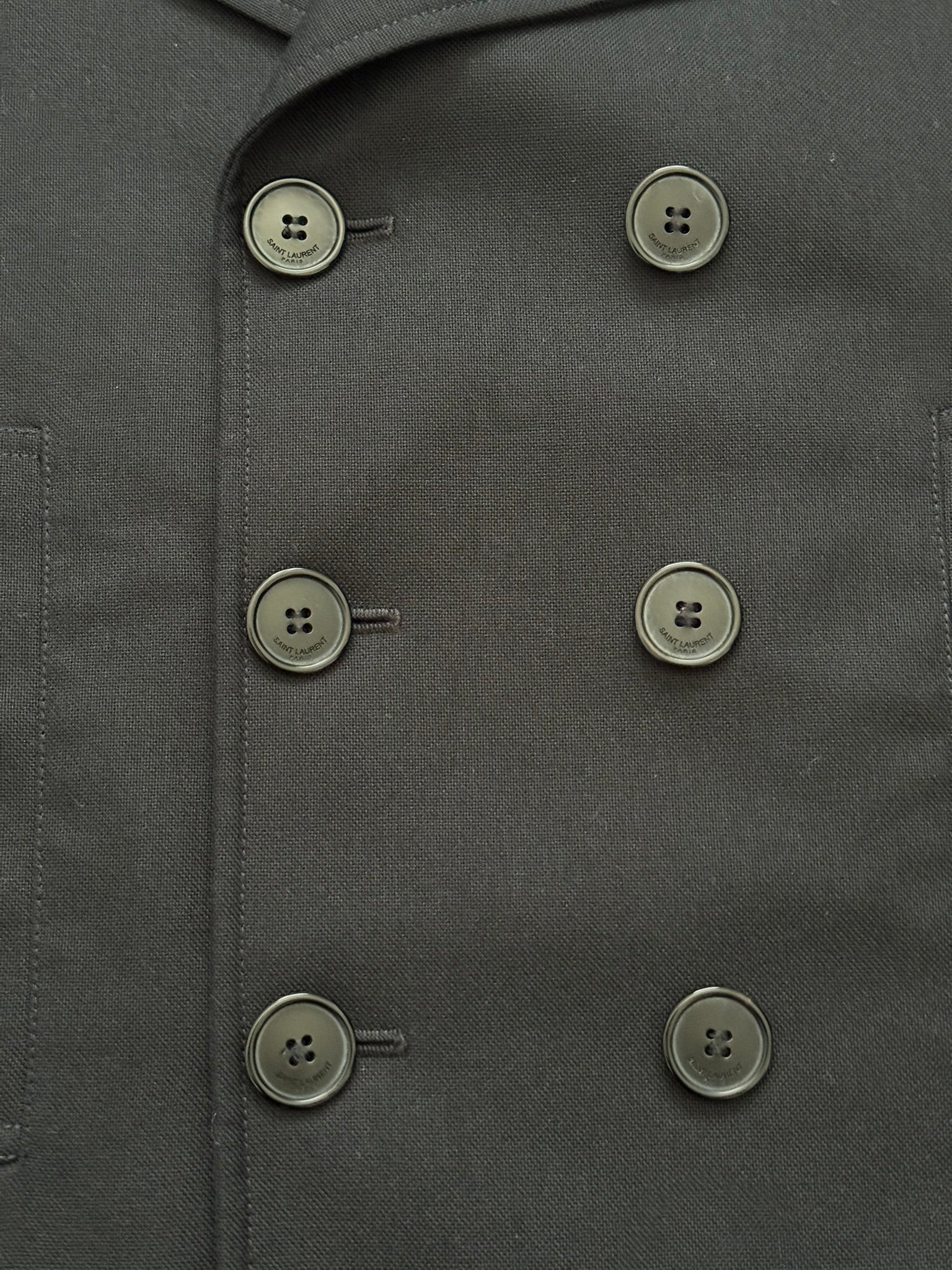 From Hedi Slimane's tenure at Saint Laurent Paris and his SS13 collection. This rare black short peacoat made with a cotton twill fabric outer features a double breasted button closure, notched lapels, two front pockets, and one inside button pocket. All buttons has embossed Saint Laurent Paris logos. In great condition, no other real flaws besides missing wash tag. Made in Italy. Previous owner said it was a size EU 46.