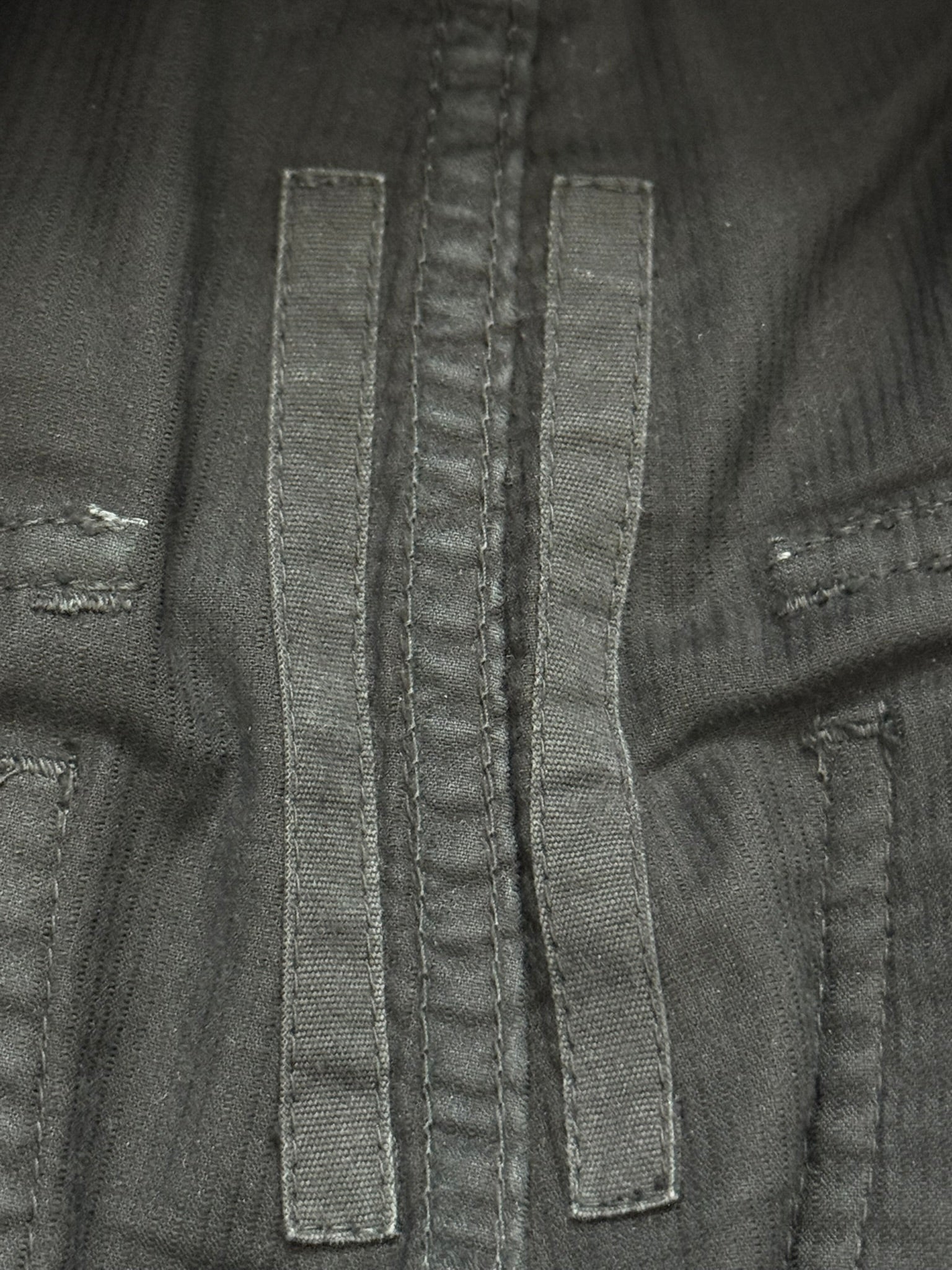From Rick Owens’s DRKSHDW line and his SS16 collection titled “Cyclops.” These black “Creatch” cargo pants made from their ribbed cotton "CN" material features an elasticated waistband that can be adjusted by its elongated drawstrings, two front pockets, two front cargo pockets with Velcro closures, and two back Velcro flap pockets. In good condition, minor tears at bottom of front pockets that can easily be fixed (does not go all the way through, items will NOT fall out of pockets); no other real flaws. Everything as pictured. Made in Italy. Tagged a size extra small, fits many sizes.