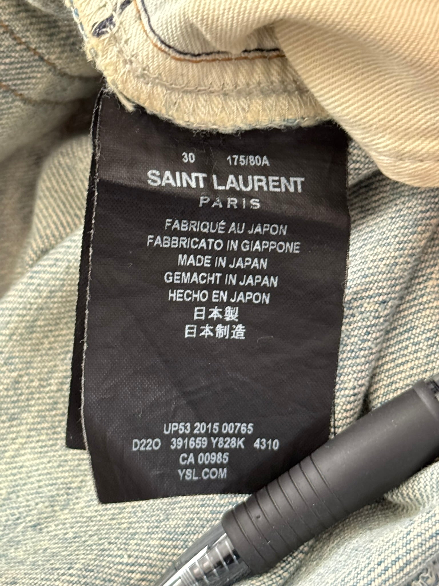 From Hedi Slimane's tenure at Saint Laurent and his SS16 collection. These light wash blue D02 slim/skinny stretch denim jeans feature a dirty mudwash throughout, crash style distressing & holes on the front, a classic five pocket design, a button + zipper fly, and the inner leather tag + chain detail. In great condition, no real flaws as all wear is intentional. Made in Japan. Tagged a size 30.
