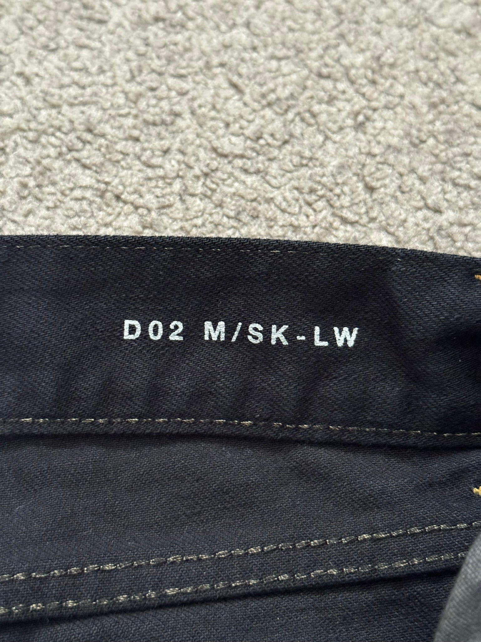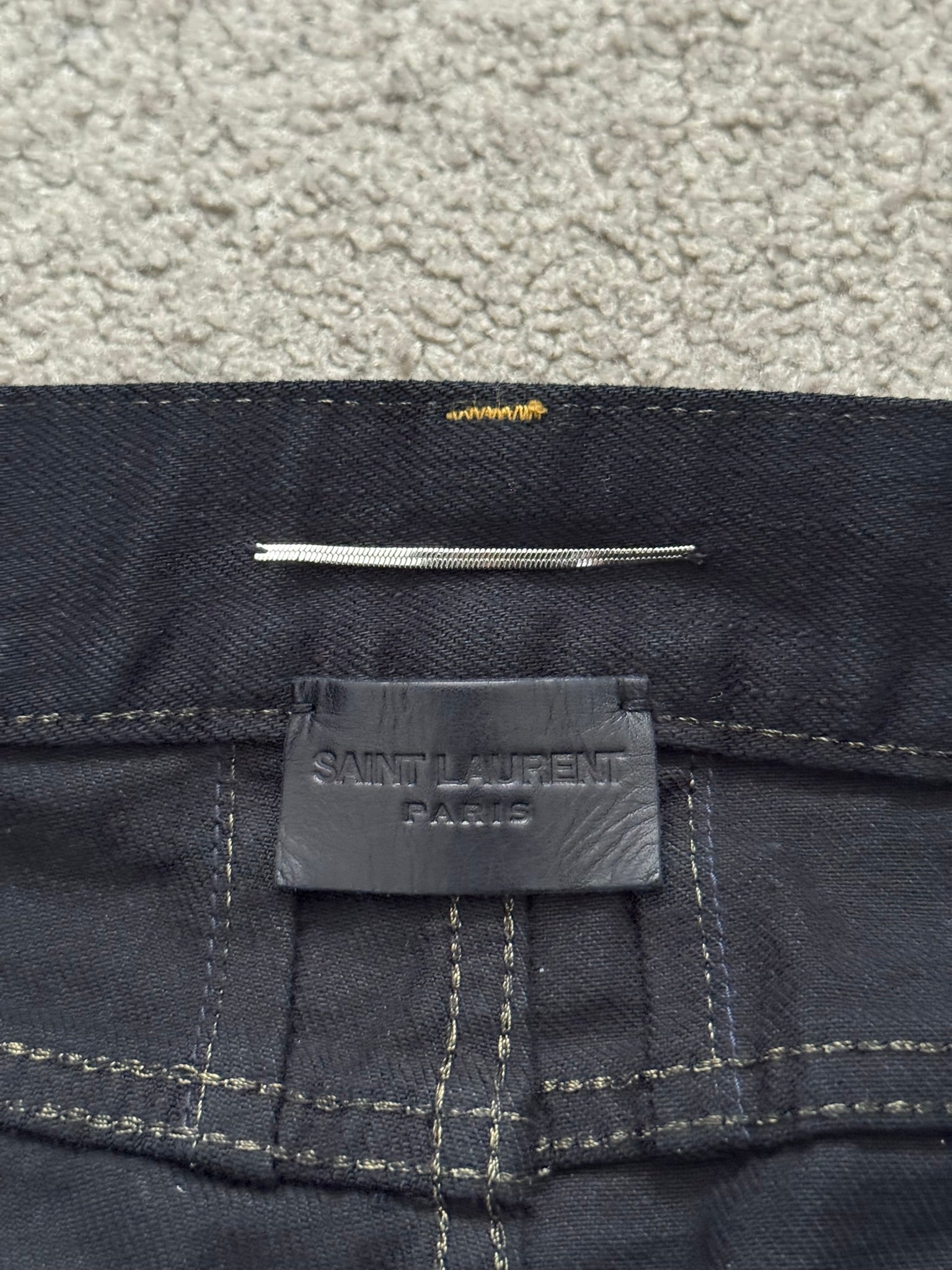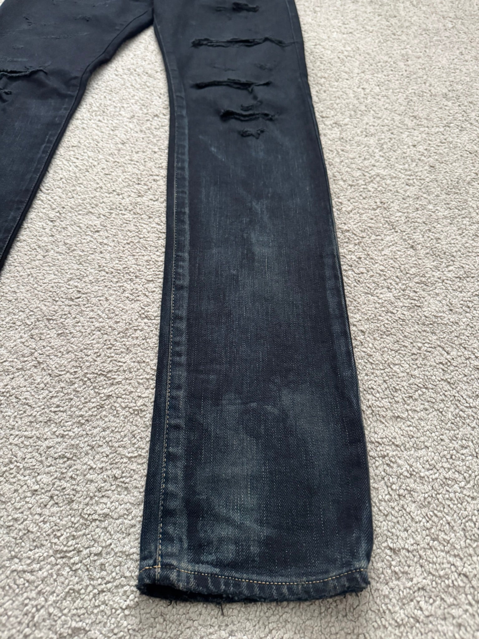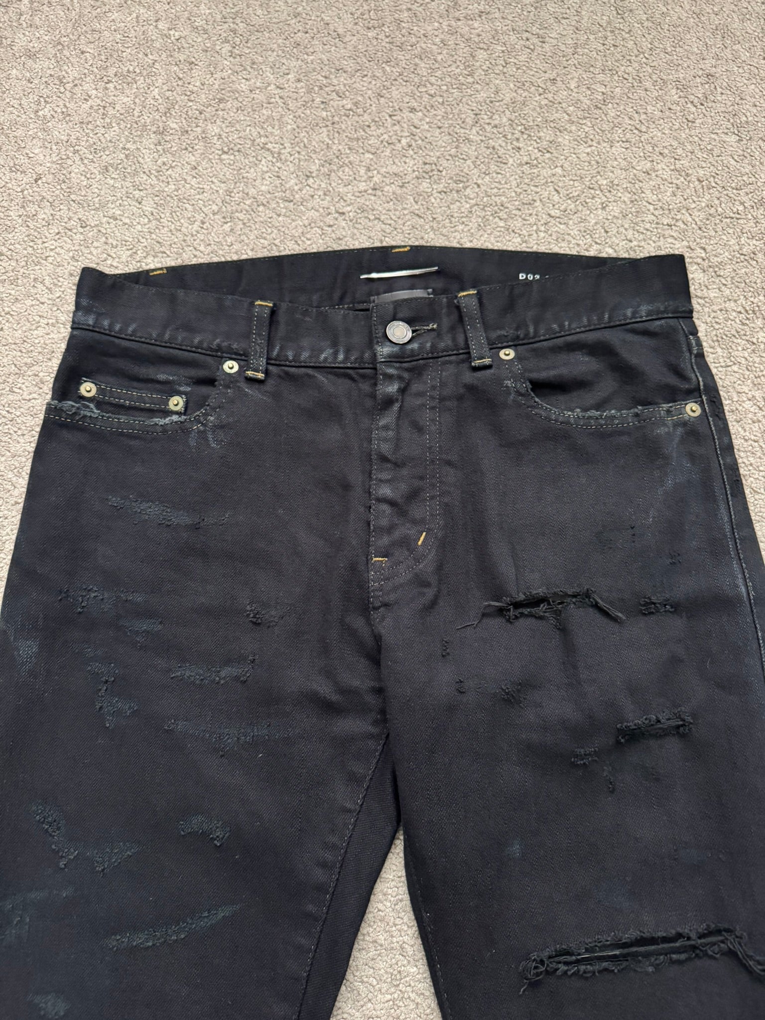 From Hedi Slimane's tenure at Saint Laurent and his SS16 collection. These black D02 slim/skinny stretch denim jeans feature crash style distressing and holes, oil stain wax coating detail at bottom of legs, contrast orange stitching, a classic five pocket design, a button + zipper fly, and the inner leather tag + chain detail. In great condition, no real flaws. Made in Japan. Tagged a size 30.