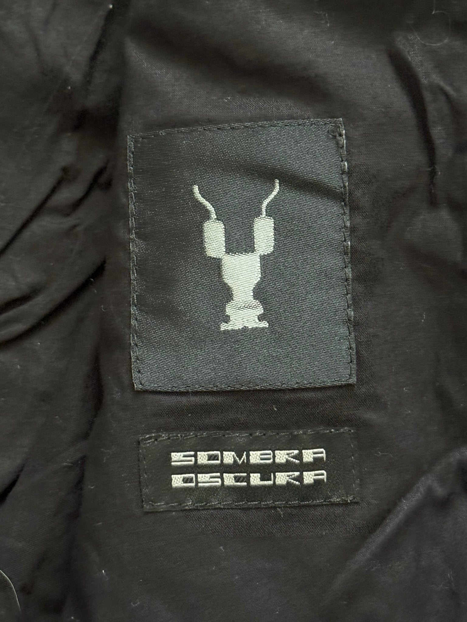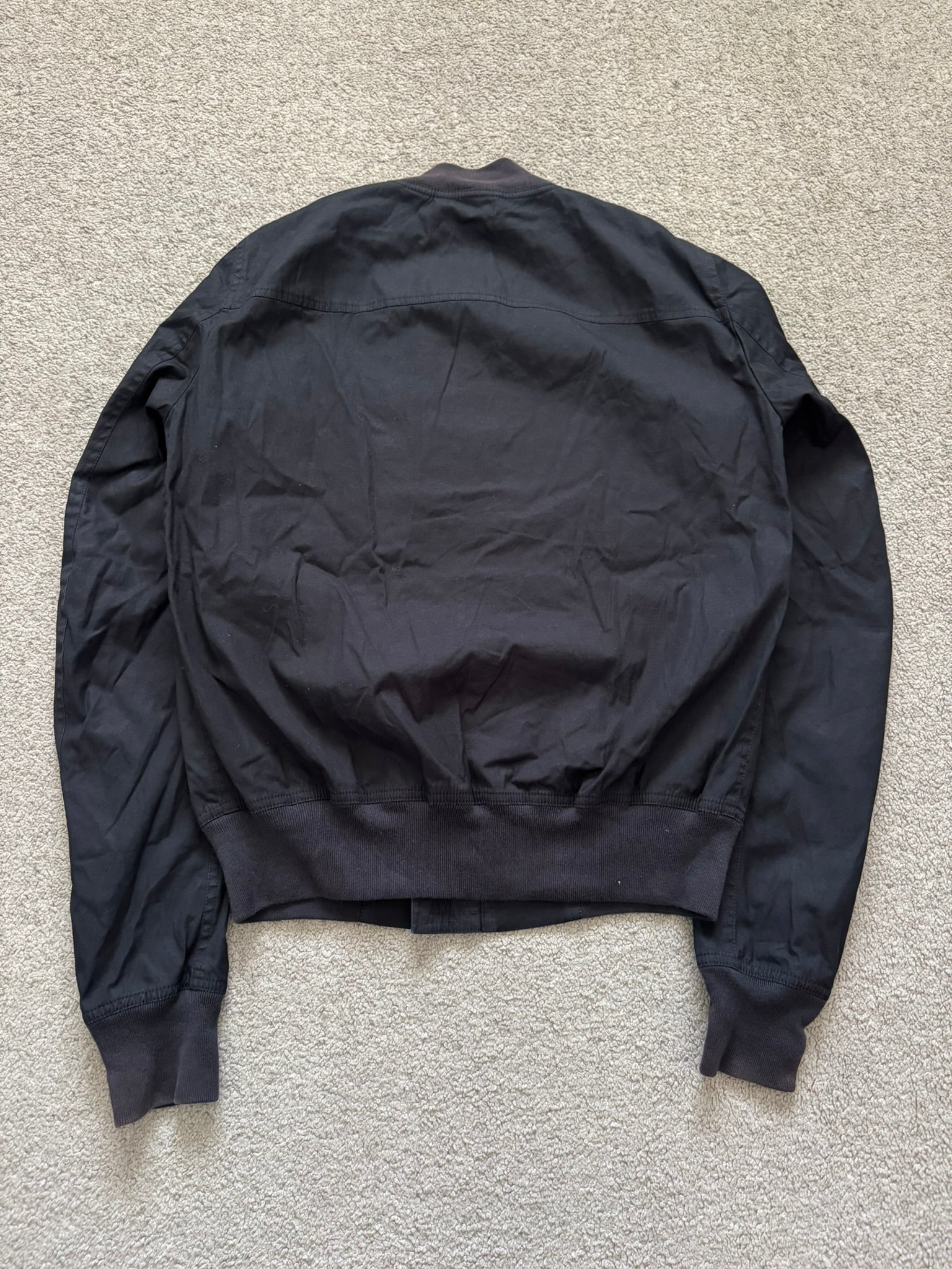 From Rick Owen’s DRKSHDW line and his SS20 collection titled “Tecuatl.” This all black bomber jacket mainly made from their cotton blend "TE" material features an extremely unique white embroidered pyramid motif at the front (used only during this collection), two pockets with snap button fasteners, a zipper pocket compartment on the arm, a zipper + button closure, and two inside button pockets. In great condition, no real flaws besides minor fading at cuffs and collar that turned the color to a brown-ish hue. Made in Italy. Tagged a size small.