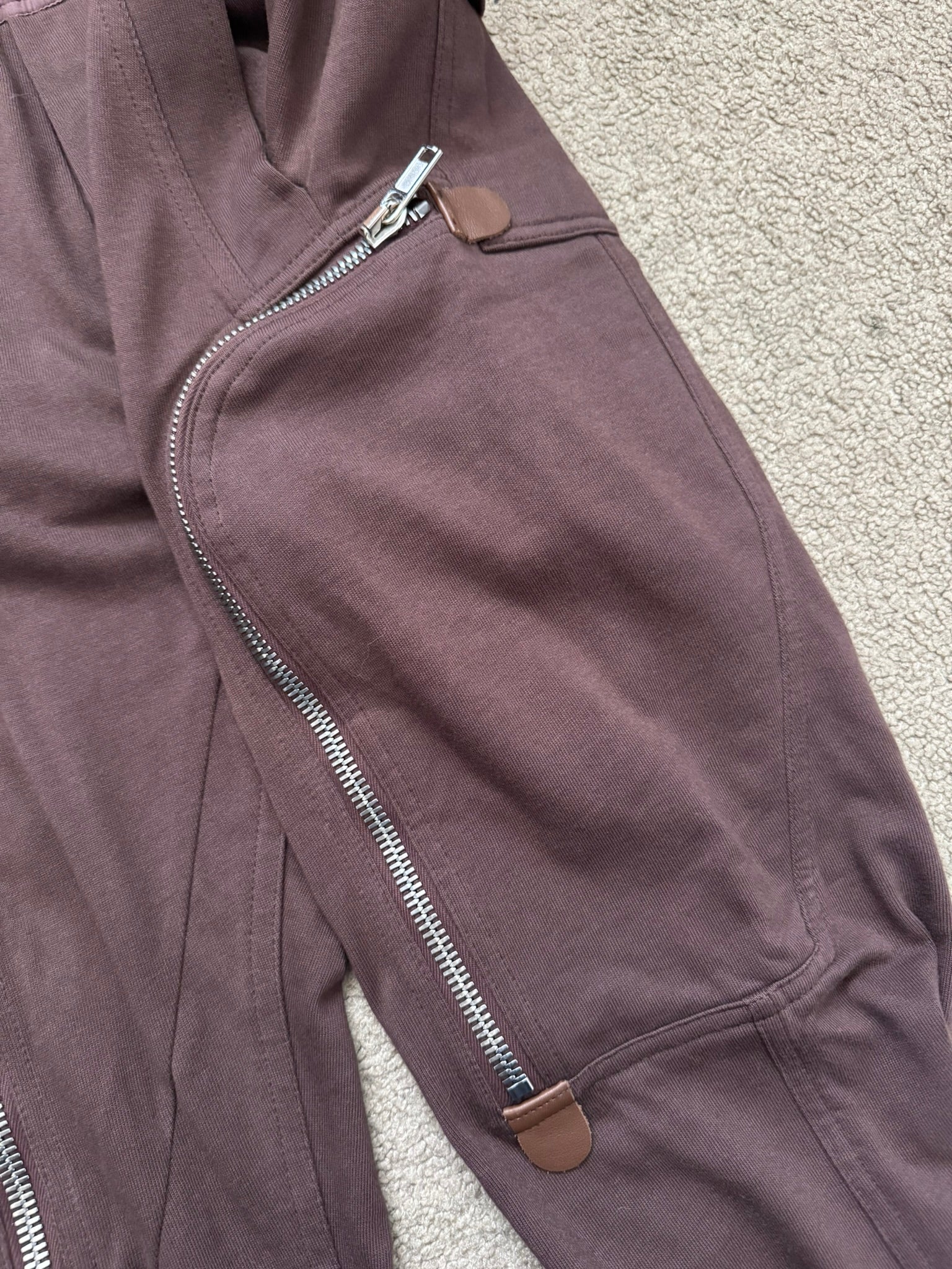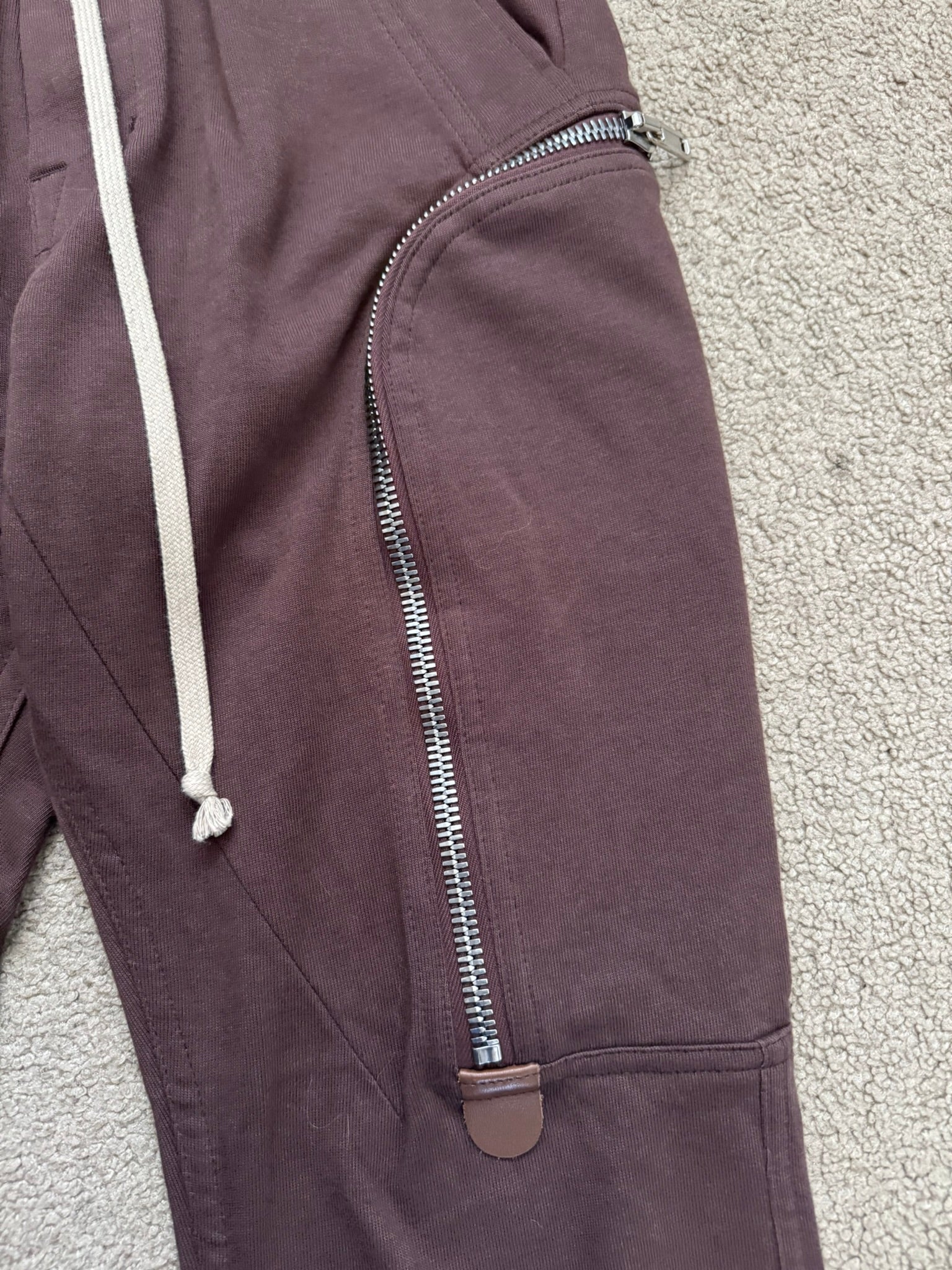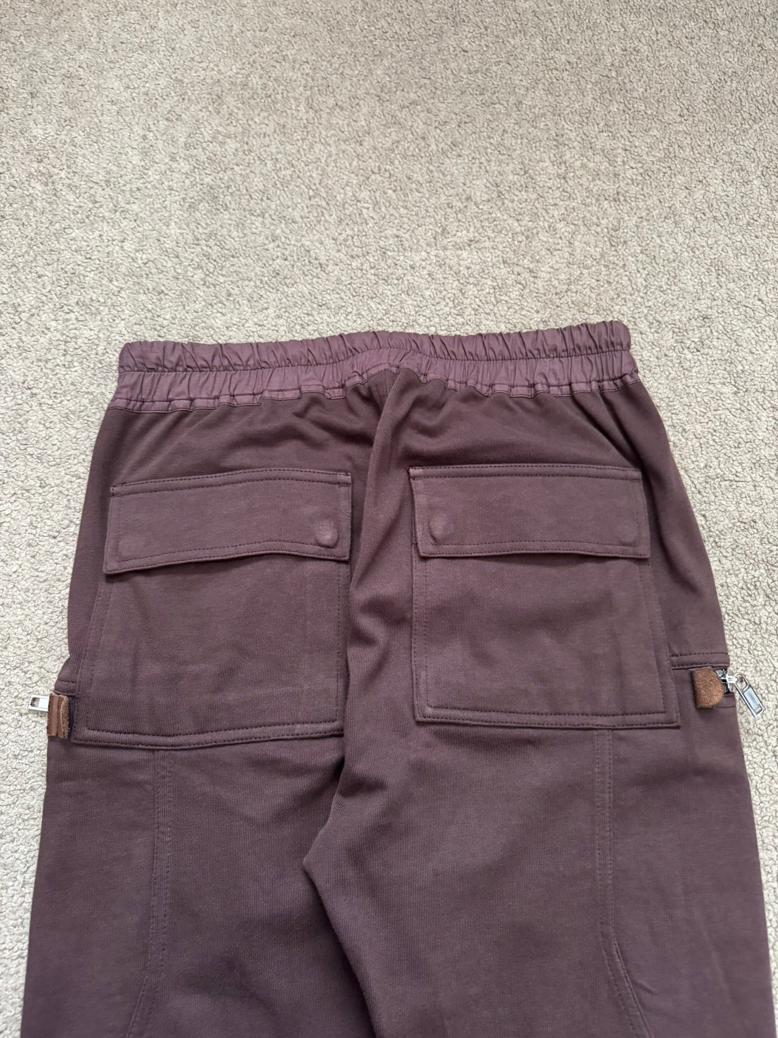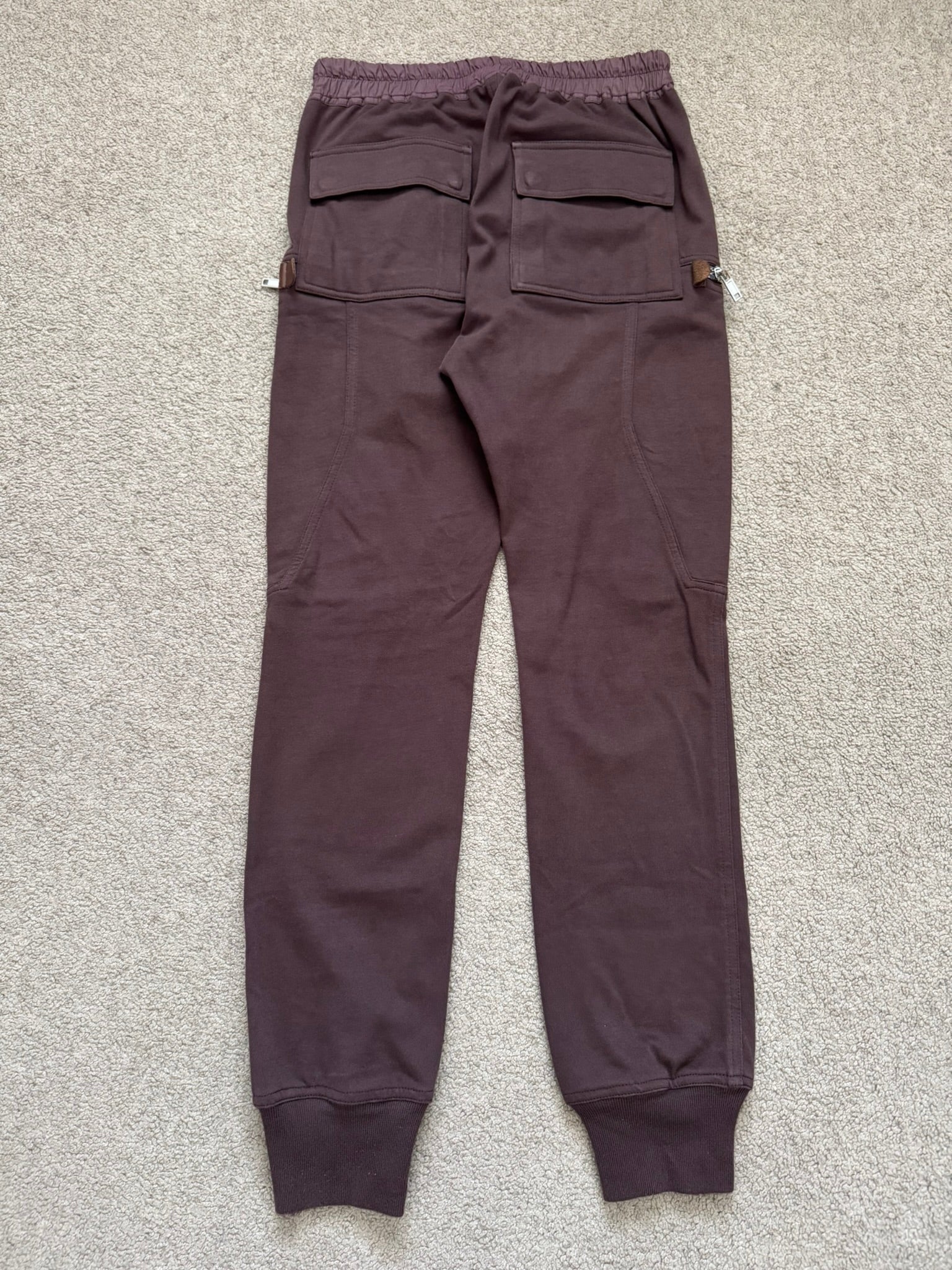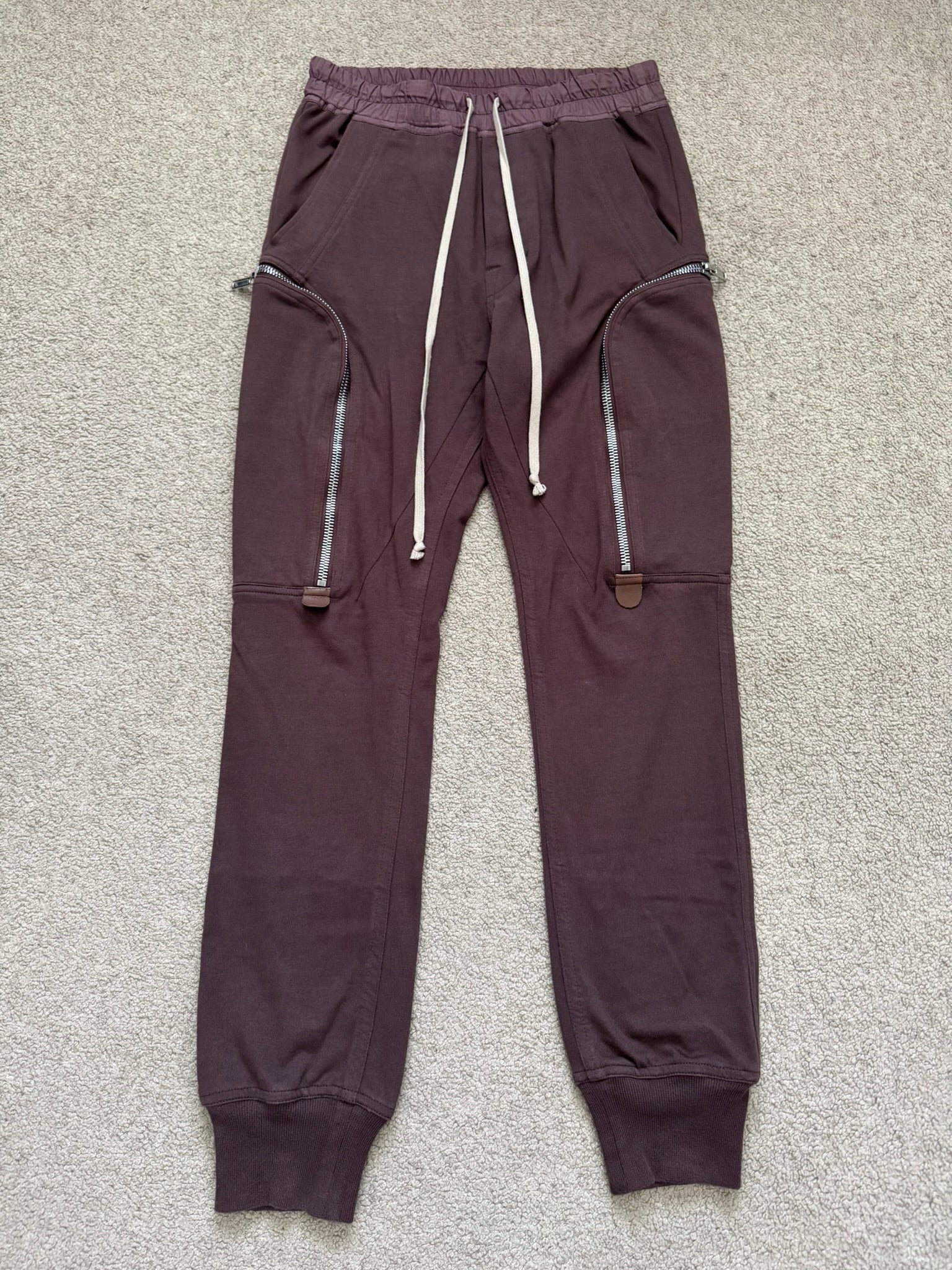 From Rick Owens’s namesake mainline label and his SS20 collection titled "Tecuatl." These red "blood" jogger style pants made from their "BA" midweight cotton material features an elasticated waistband that can be adjusted by the signature elongated drawstrings, two front pockets, their "Bauhaus" style zipper cargo pockets on both sides with brown calf leather tab details, elasticized cuffs, and two back cargo snap pockets. In great condition, no real flaws. Everything as pictured. Made in Italy. Tagged a size IT 46, fits many sizes due to waistband.
