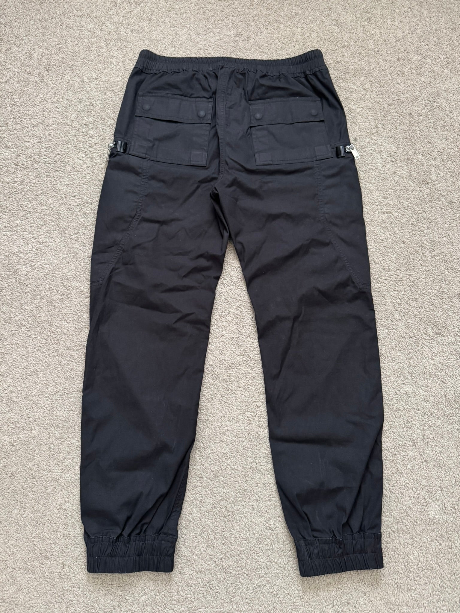 From Rick Owens’s DRKSHDW line and his SS20 collection titled "Tecuatl." These black jogger style pants made from their sturdy cotton blend "TE" material features an elasticated waistband that can be adjusted by the signature elongated drawstrings, two front pockets, their "Bauhaus" style zipper cargo pockets on both sides with calf leather tab details, elasticized cuffs, and two back cargo snap pockets. In great condition, no real flaws. Made in Italy. Tagged a size IT 52.