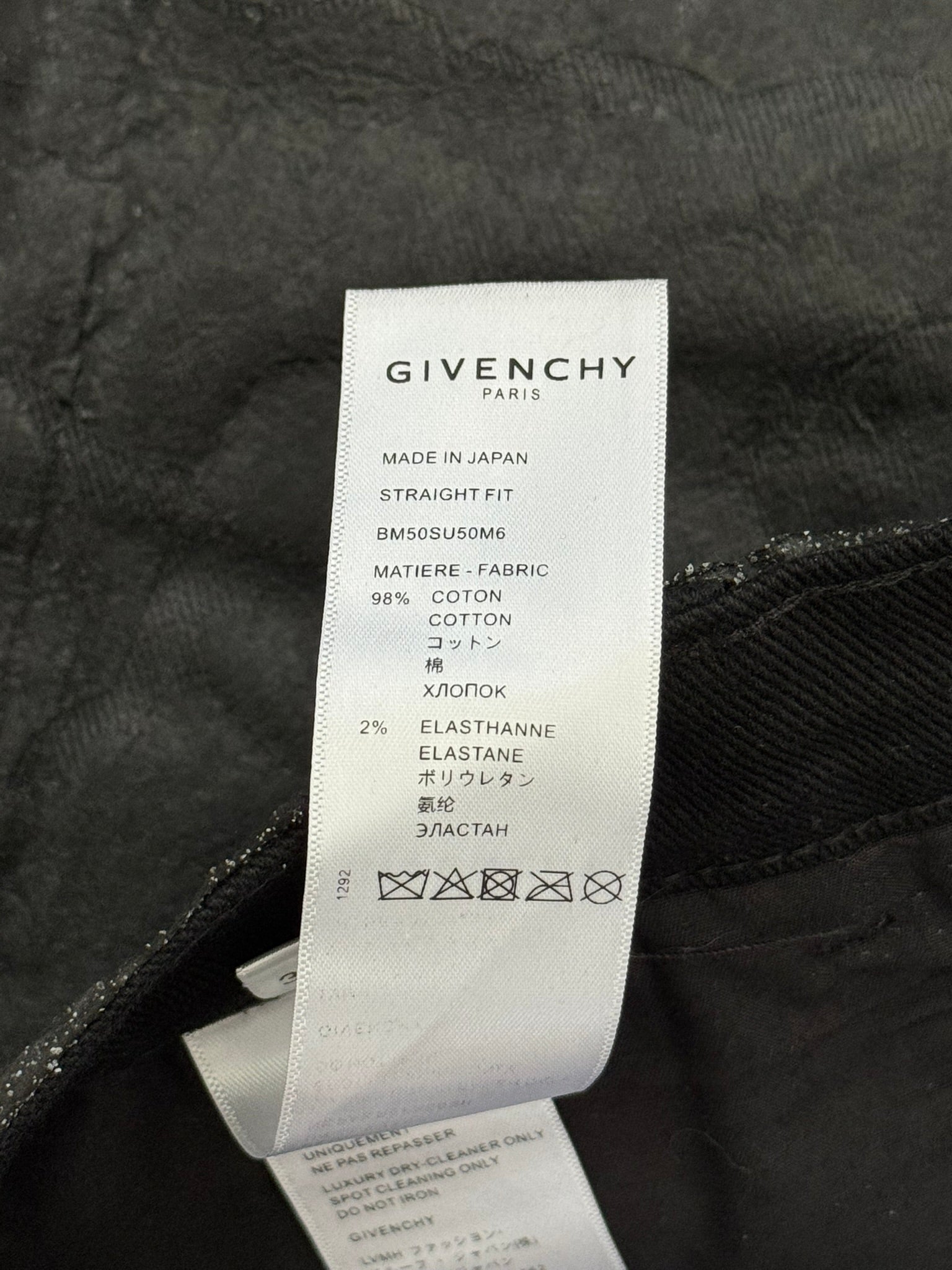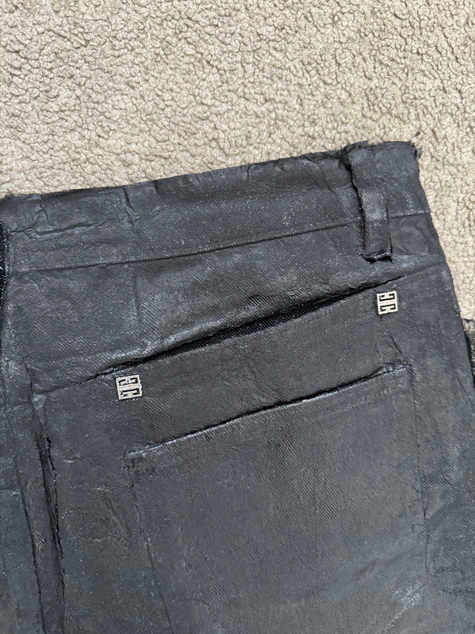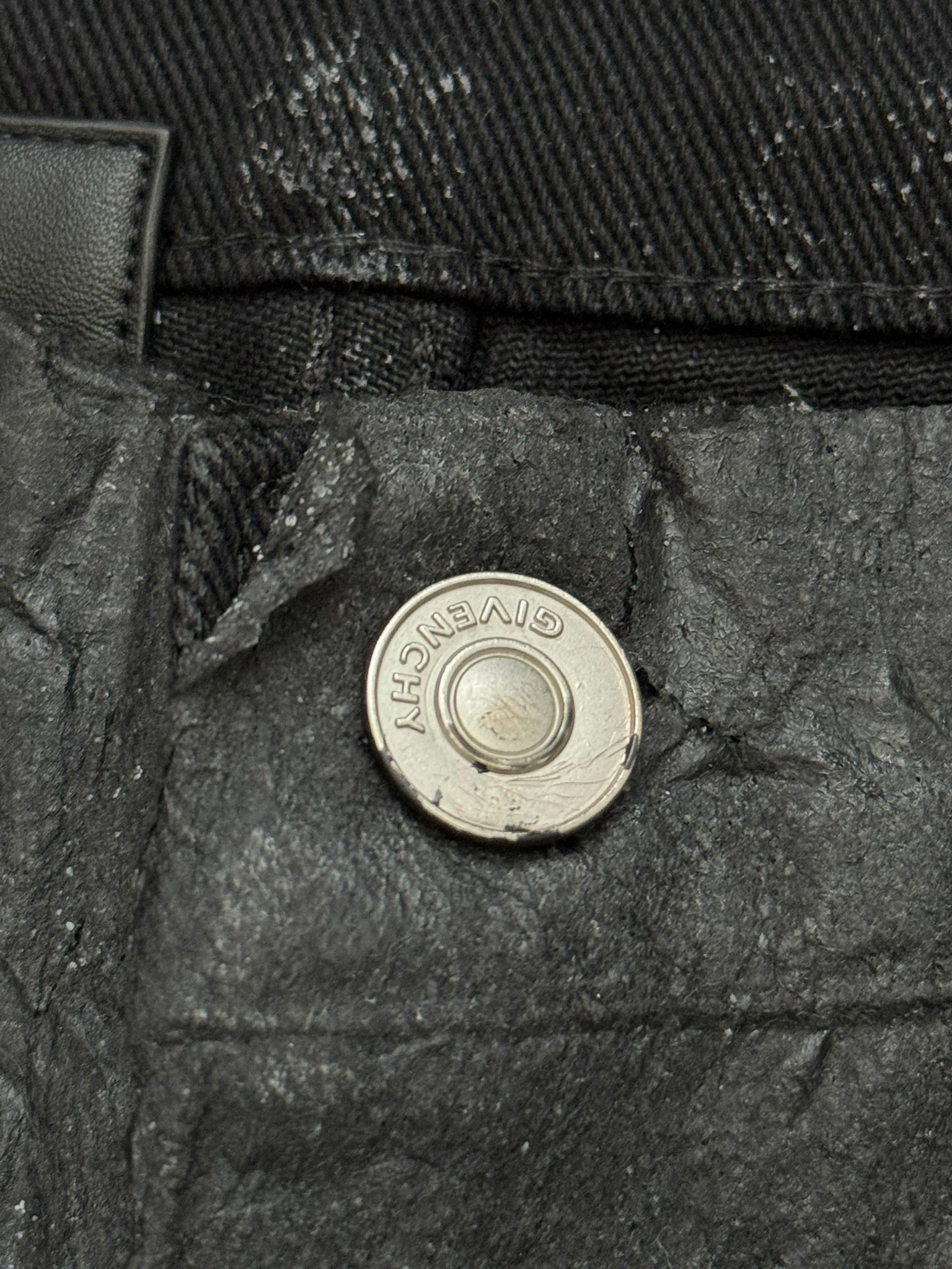 From Matthew William's tenure at Givenchy and his SS21 collection. These all black denim jeans have a special stiff paint coating throughout that is meant to soften and crackle through time as it is worn, creating a unique distressed looked that is catered towards the wearer. It also features a four pocket construction, two zipper pockets on the thighs, a hidden back pocket with Givenchy 4G logo rivets, and a button + zipper fly. In almost brand new condition, has only been tried on once with majority of the coating still intact. Does not have tags. Made in Japan. Tagged a size 30.