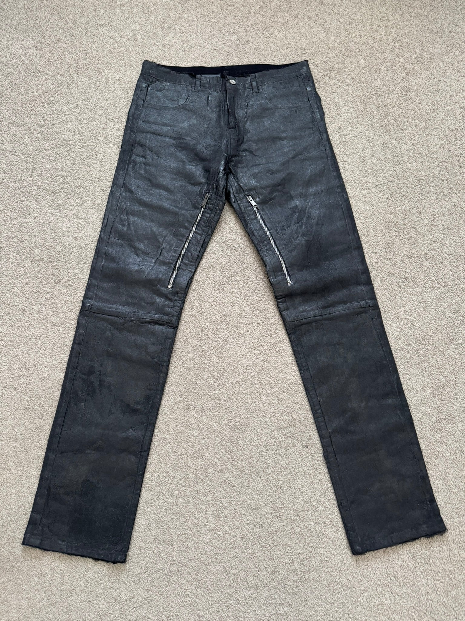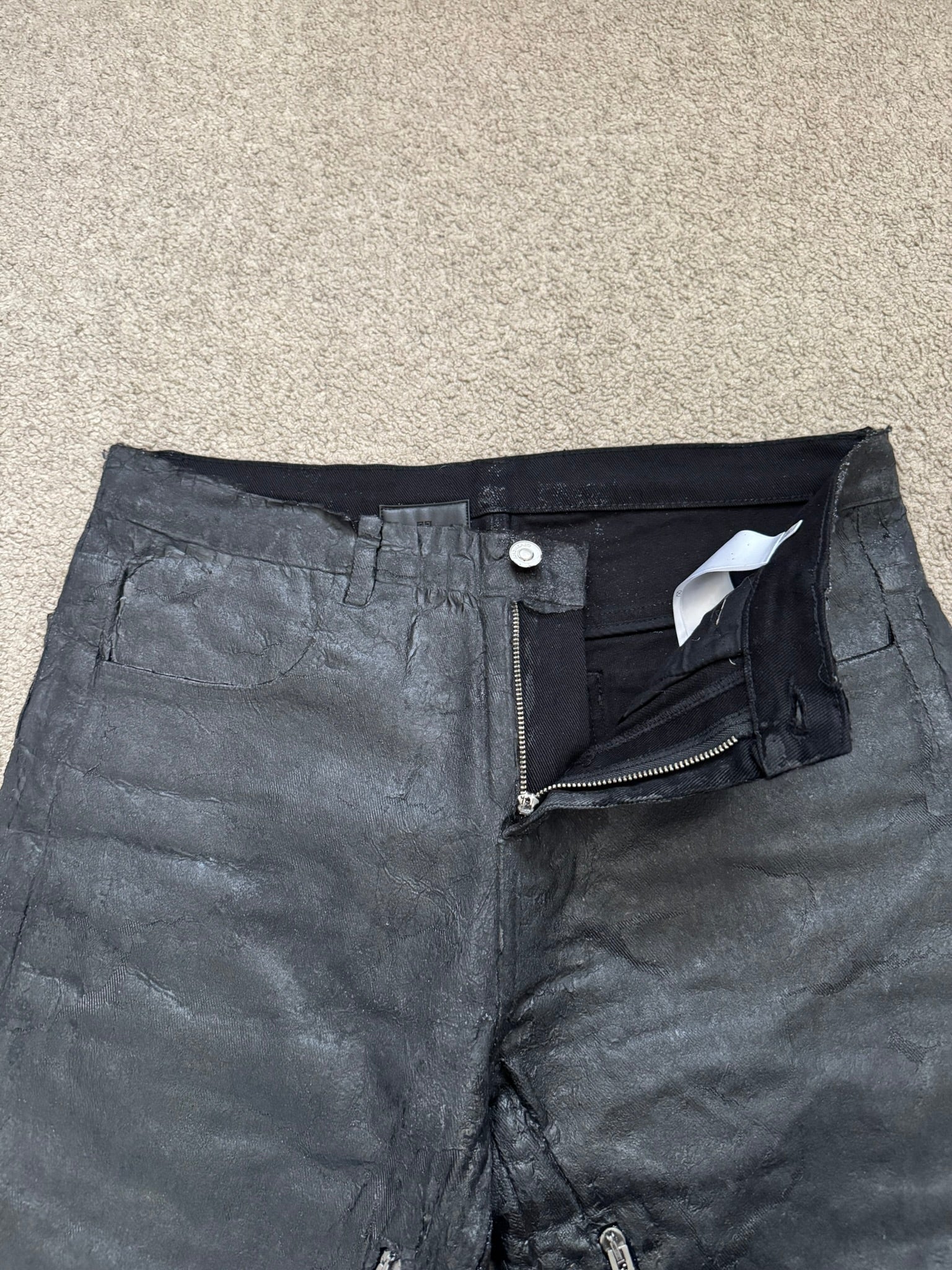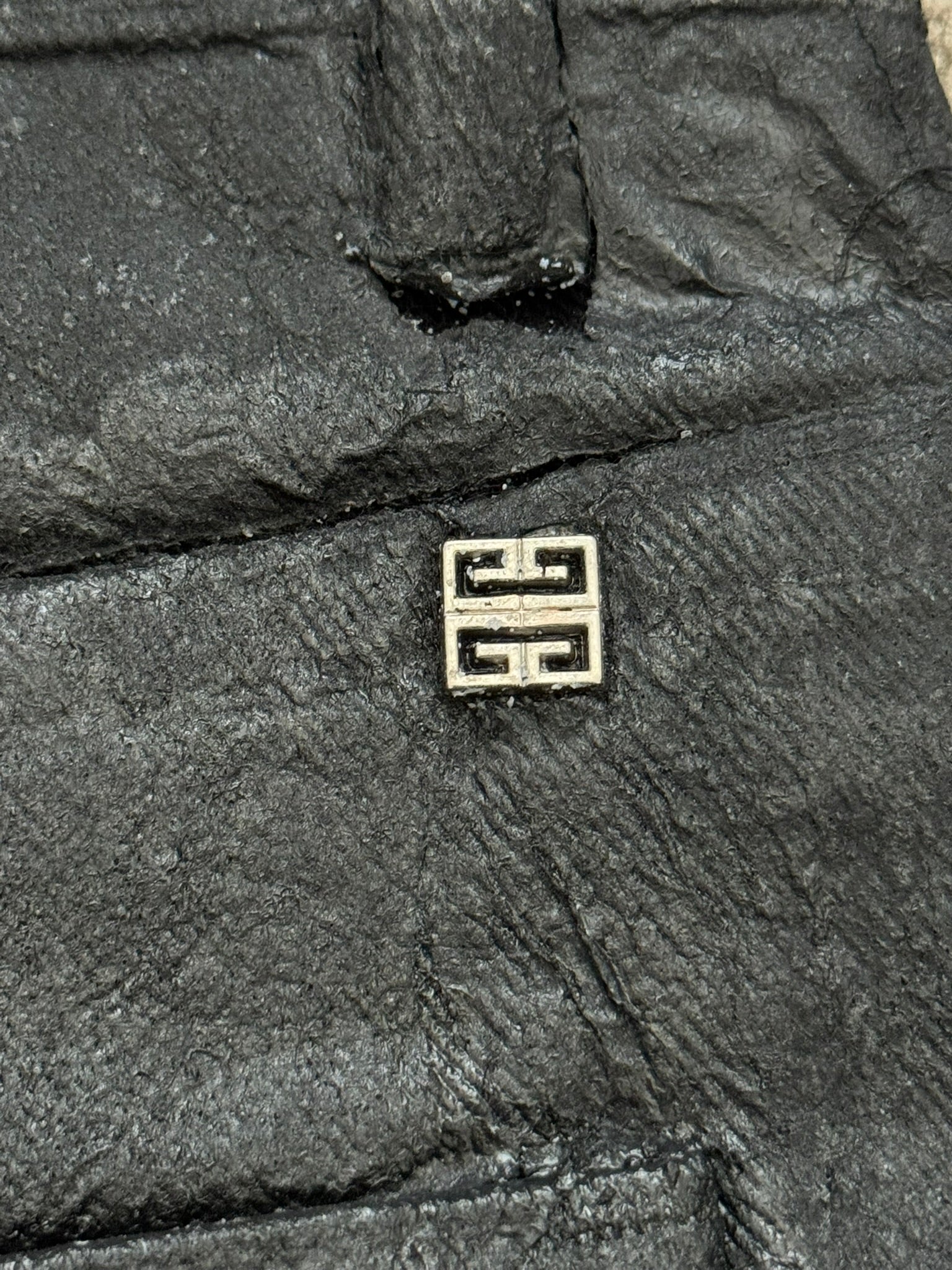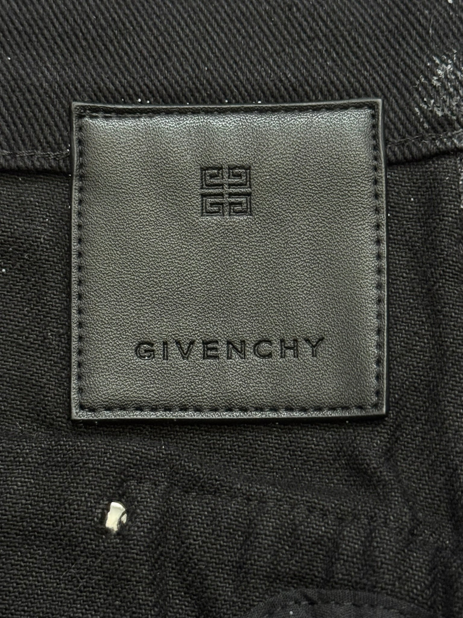 From Matthew William's tenure at Givenchy and his SS21 collection. These all black denim jeans have a special stiff paint coating throughout that is meant to soften and crackle through time as it is worn, creating a unique distressed looked that is catered towards the wearer. It also features a four pocket construction, two zipper pockets on the thighs, a hidden back pocket with Givenchy 4G logo rivets, and a button + zipper fly. In almost brand new condition, has only been tried on once with majority of the coating still intact. Does not have tags. Made in Japan. Tagged a size 30.