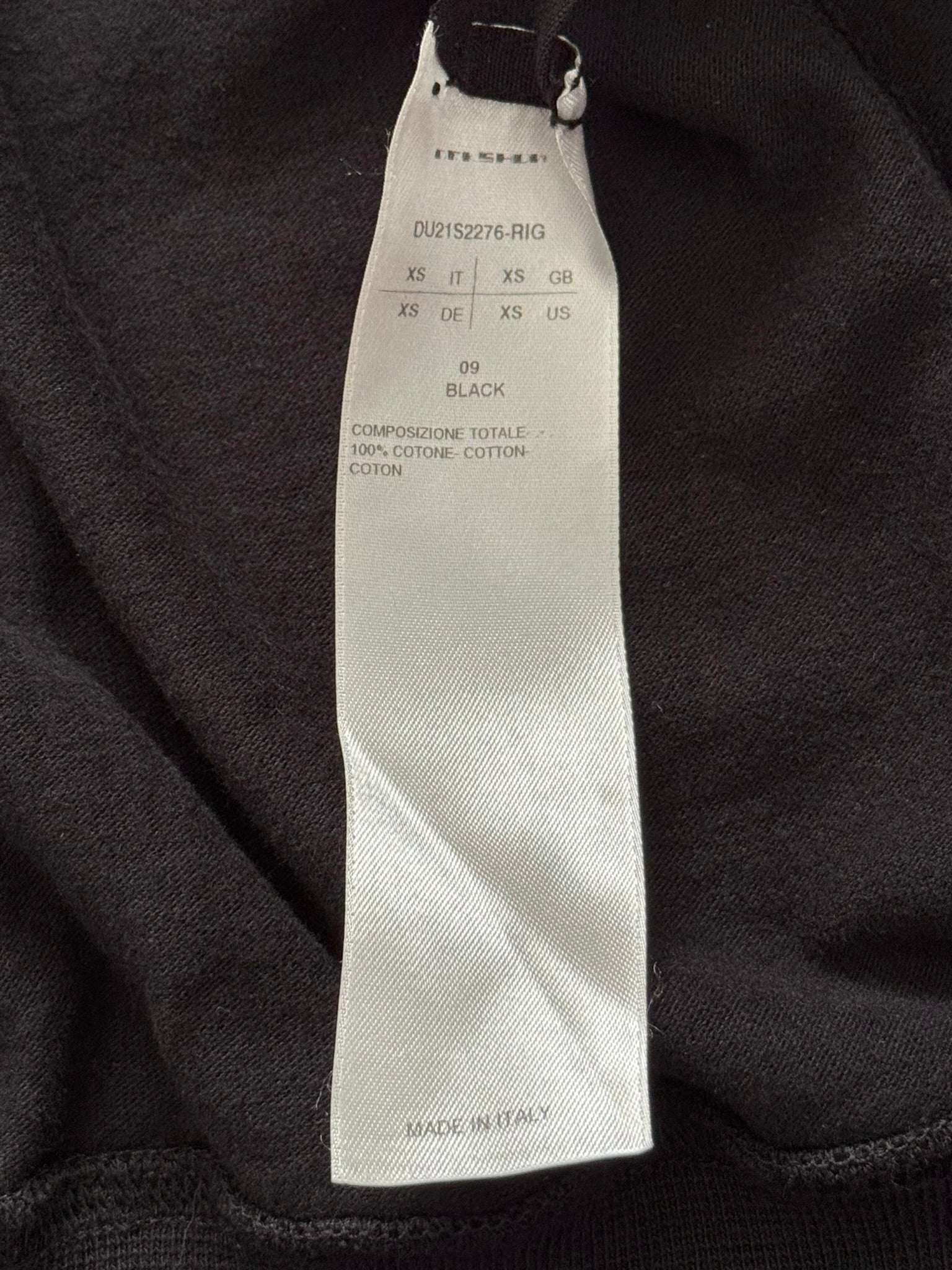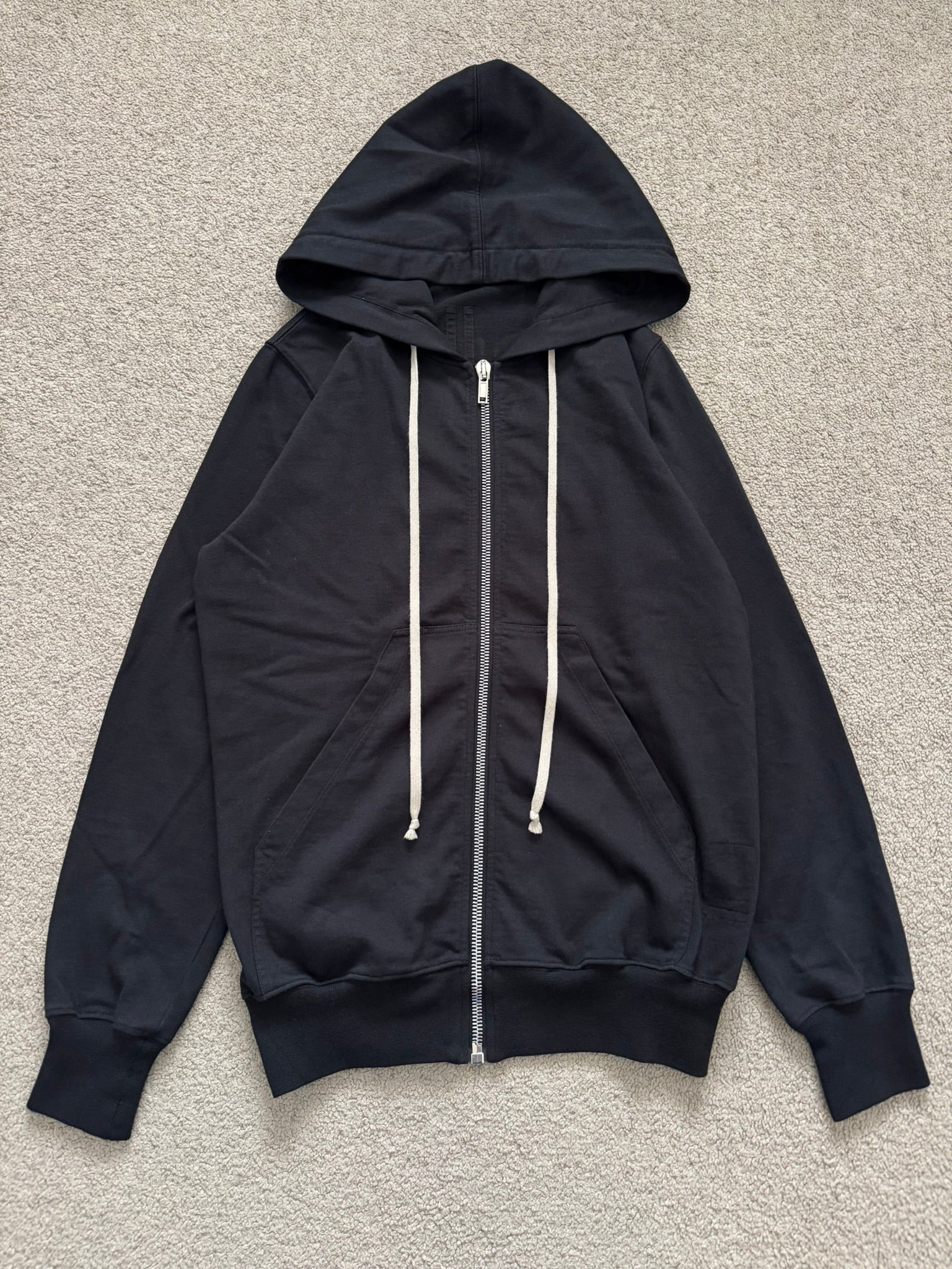 From Rick Owens's DRKSHDW line and his SS21 collection titled "Phlegethon." This midweight jersey cotton black zip up hoodie made from their "RIG" material in their "Jason" style features the signature elongated drawstrings at the hood, and a silver Raccagni zipper. Pretty much brand new without tags, no real flaws. Made in Italy. Tagged a size extra-small.