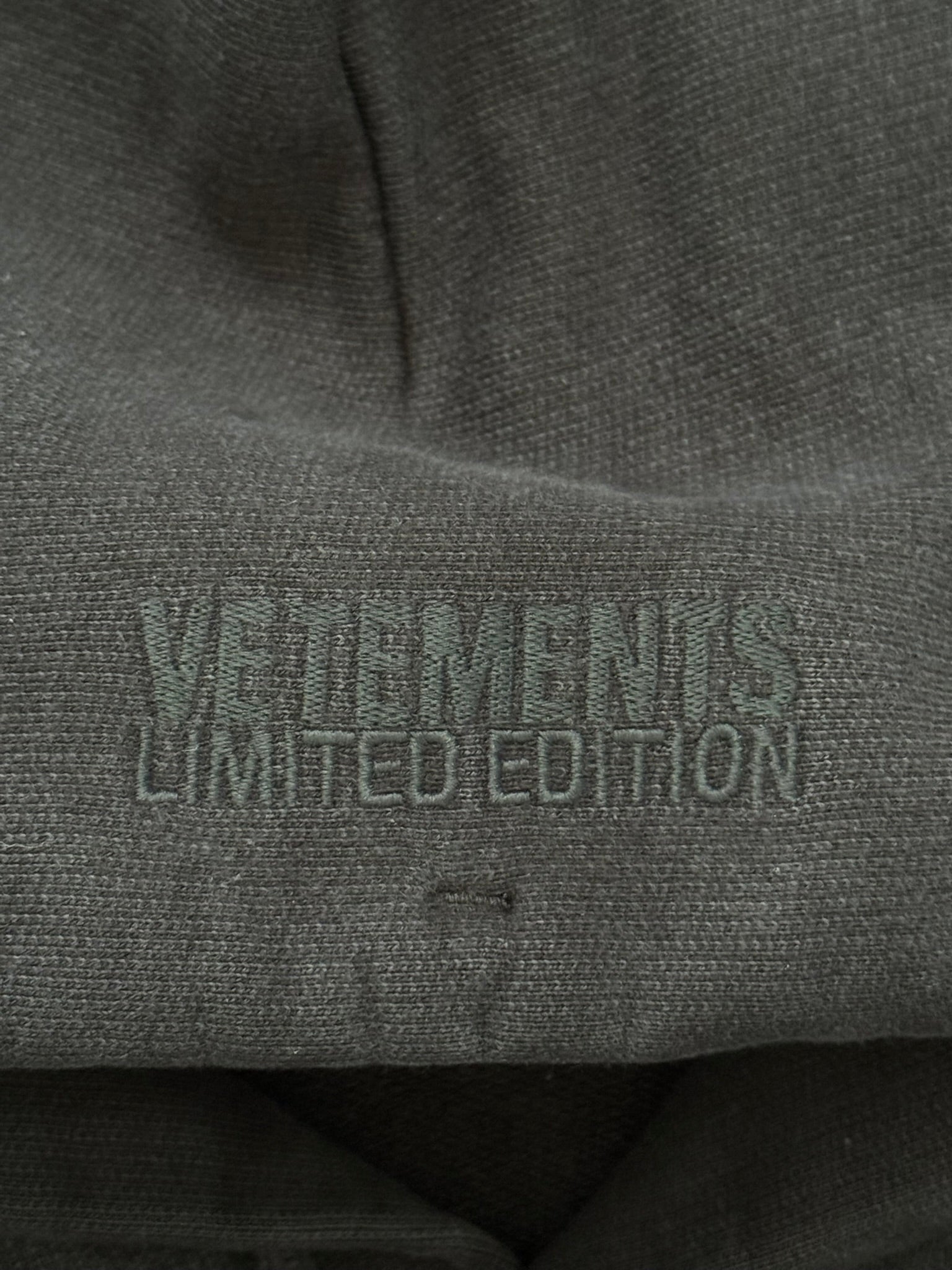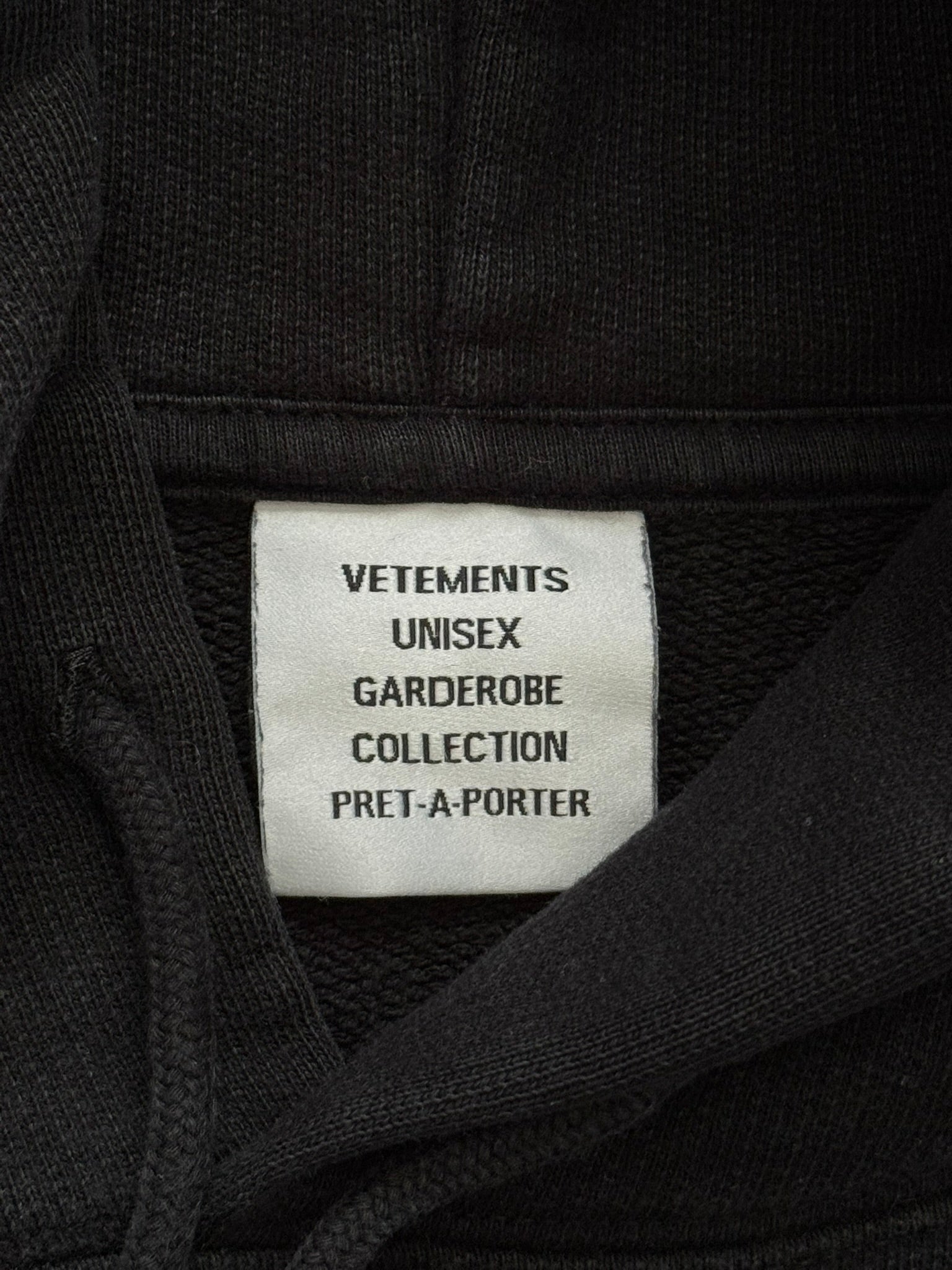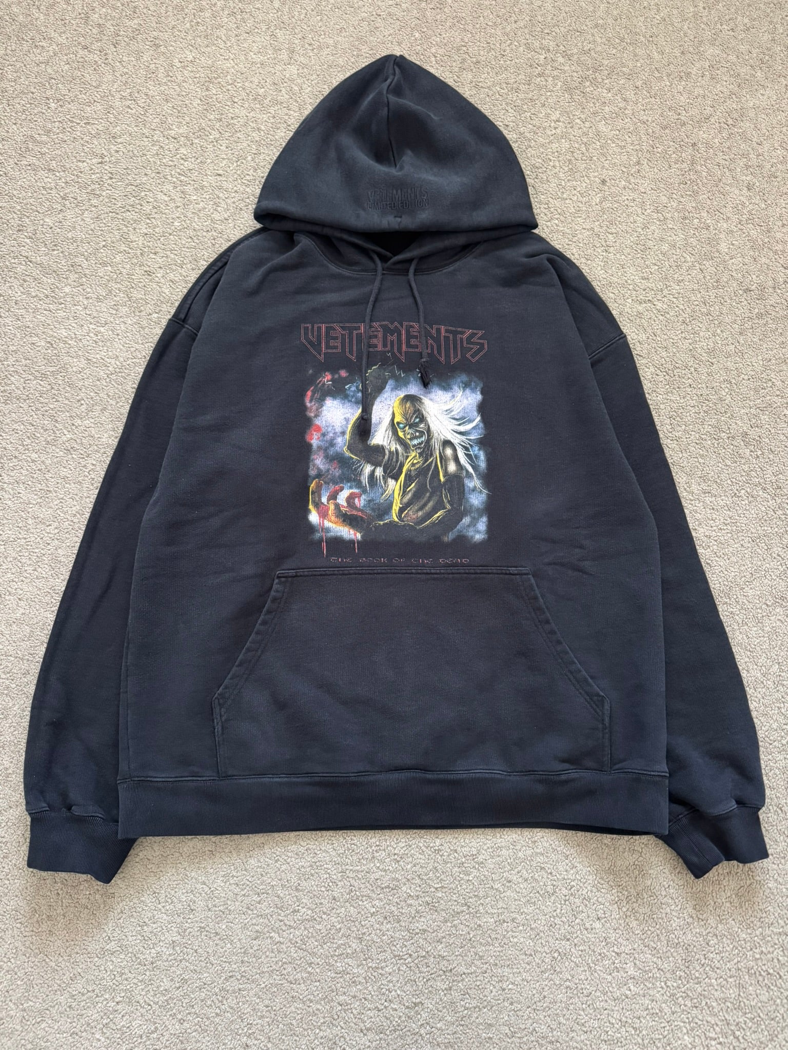 From Vetements and their SS21 collection. This thick all black hoodie features an Iron Maiden inspired graphic on both sides with the text "The Book Of The Dead," the iconic Vetements embroidery logo on the hood, and a kangaroo pocket. In great condition, no real flaws besides tiny pinhole at shoulder that is hardly noticeable when worn and faded tags. Made in Portugal. Tagged a size extra small, fits oversized like most Vetements.