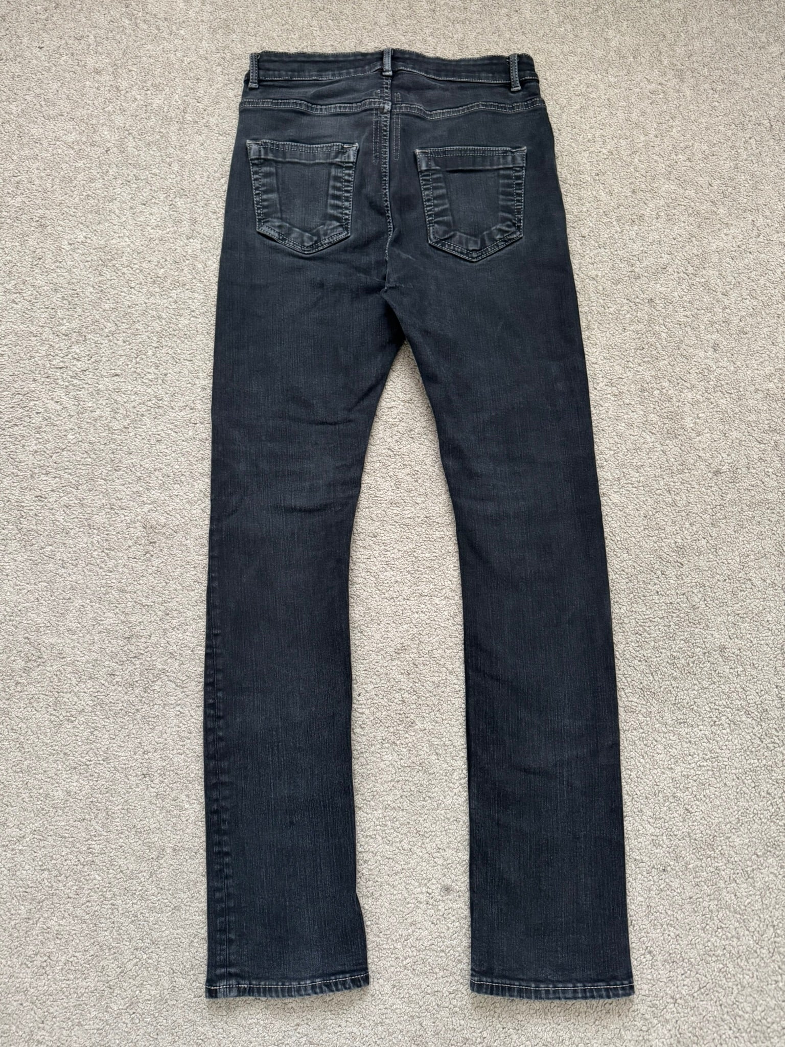 From Rick Owens's DRKSHDW line and his SS22 collection titled "Fogachine." This pair of faded black/grey skinny stretch denim jeans in their "Detroit" cut feature a six pocket layout, and a button fly. In great condition, no real flaws besides minor blemish at back (not a tear/hole). Everything as pictured. Made in Italy. Tagged a size 28, can fit many sizes due to stretchiness.