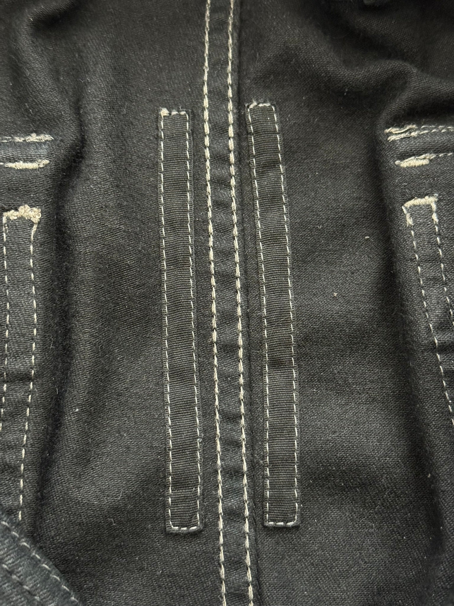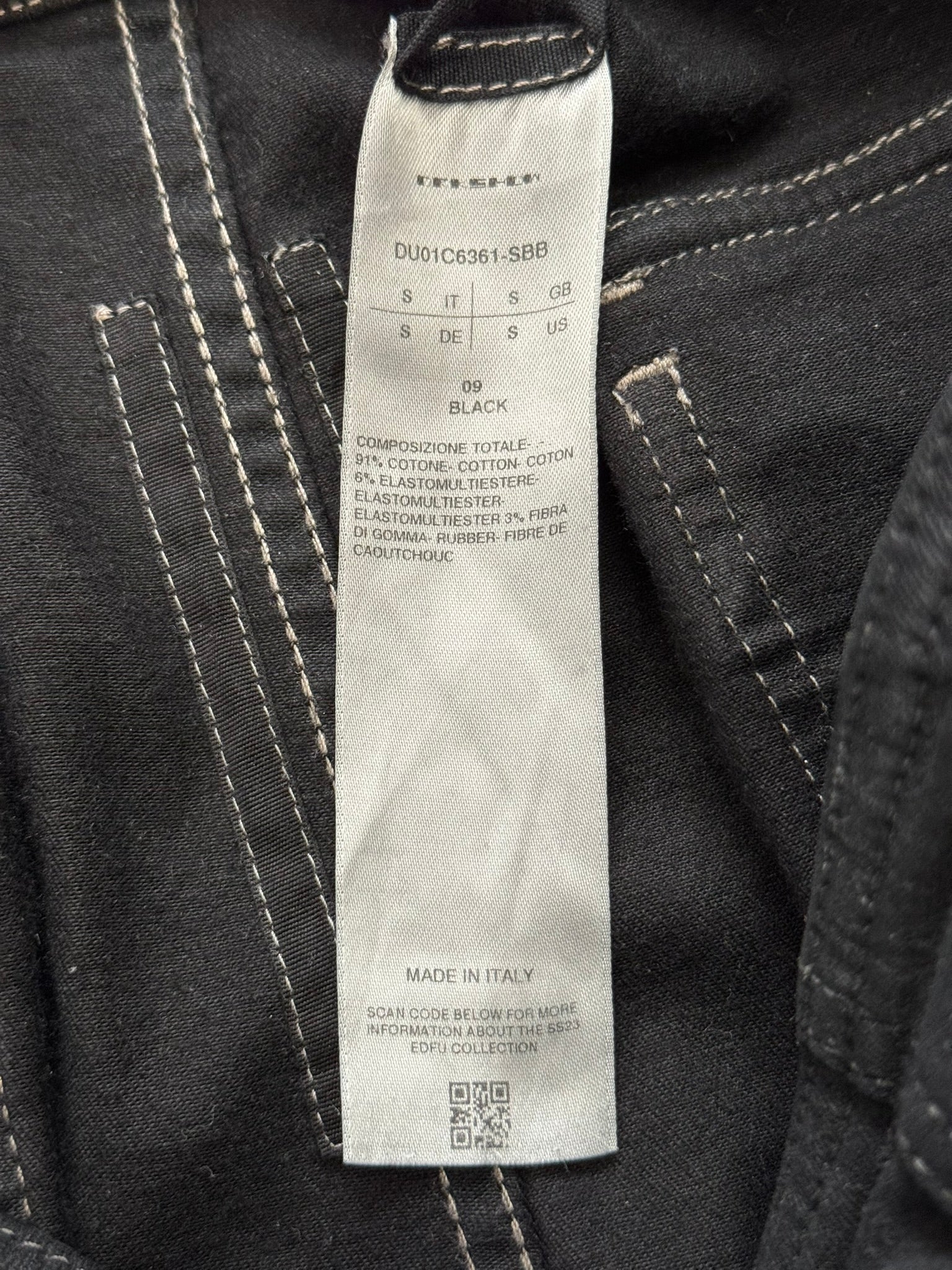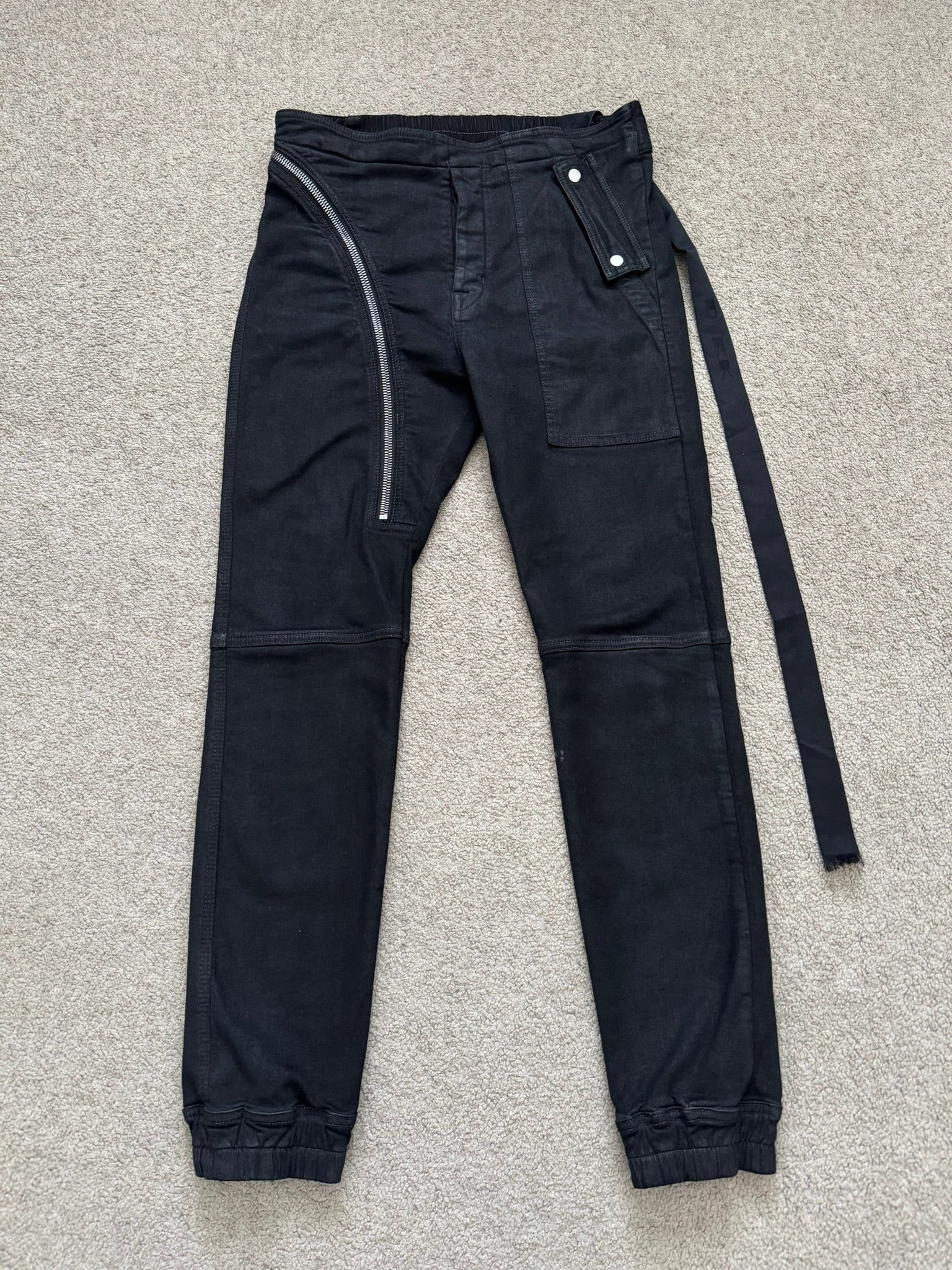 From Rick Owens's DRKSHDW line and his SS23 collection titled "EDFU." This pair of slim black stretch denim pants with a subtle wax coating throughout the pants feature their famous "Aircut" zipper flap with a back button closure, elasticated waist, a snap button front pocket, two back snap button pockets, jogger style cuffs, and the lengthy "DRKSHDW" tag. In great condition, no real flaws. Made in Italy. Tagged a size small, can fit many sizes due to stretchiness.