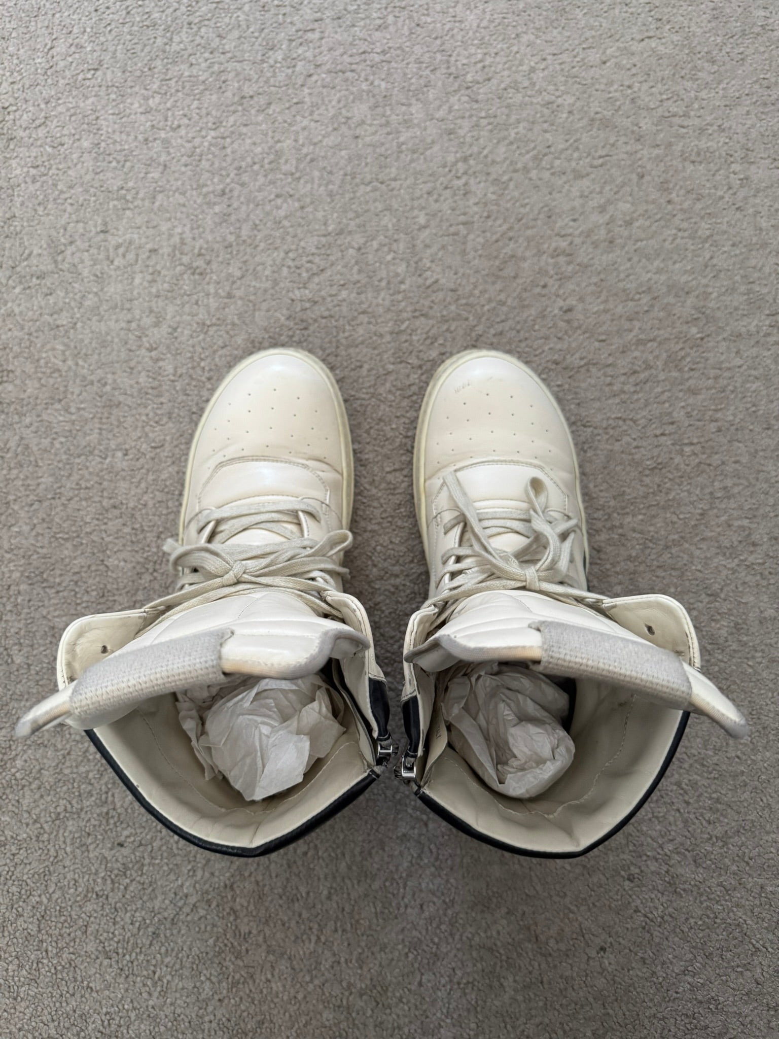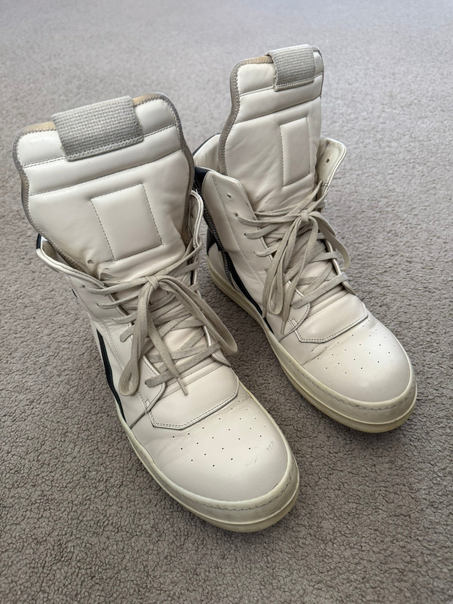From Rick Owen’s namesake mainline label and their SS23 collection titled "EDFU." These classic Geobaskets in an all white milk calf leather with black leather detailing feature an elongated tongue, silver Raccagni side zippers on each shoe, and the classic white rubber sharktooth soles. In great condition, minor scuffs & marks throughout and some wear on the soles with heel drag. Everything as pictured. Comes in original box. Made in Italy. Tagged a size EU 43, fits around a size U.S. 10 to 11.