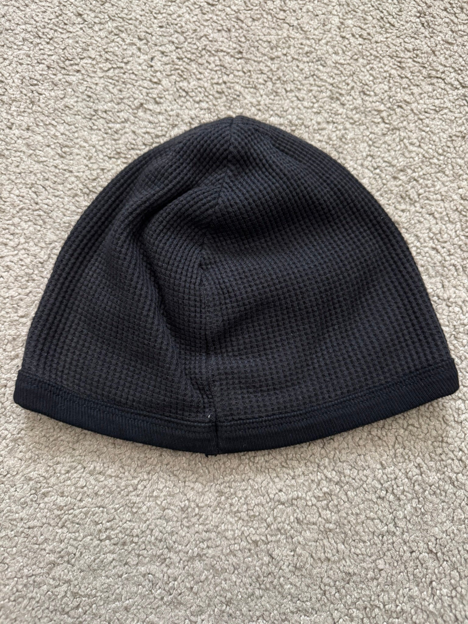 From iconic American leather & silver brand Chrome Hearts ran by Richard Stark and his family. This vintage 100% cotton black thermal beanie/cap features white embroidery of their horseshoe logo on the front. In great condition, no real flaws. Made in U.S.A. Measures to around 8 inches in length and 10 inches in width, stretches when worn.